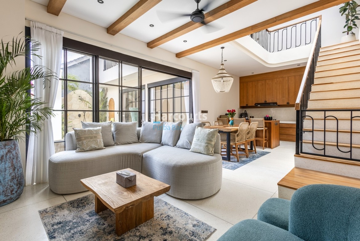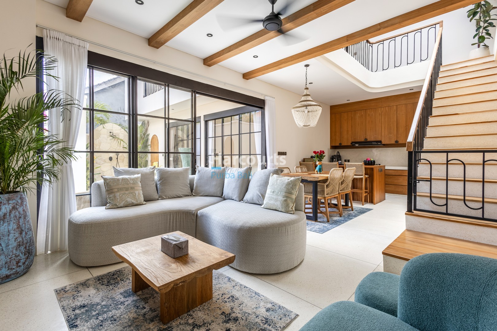 Inside, the 207 m² residence showcases thoughtful craftsmanship and European-standard finishes. The open-plan living and dining area features a custom-made Vanya fabric couch, Turkish carpets, and a solid recycled teak table. The modern kitchen comes fully equipped with an oven, stove, hood, dishwasher, and washing machine, as well as plates, silverware, and soft-close cabinetry finished with magnetic bronze fittings.