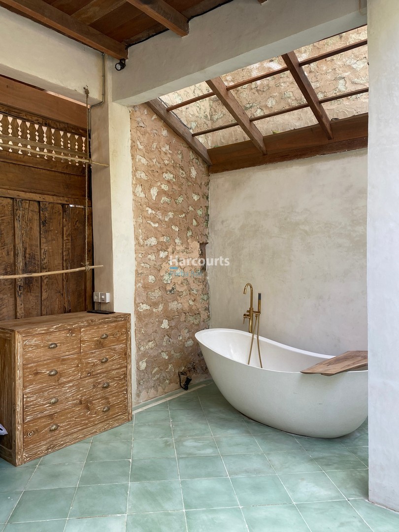 Both bedrooms are well-proportioned and come with beautifully appointed en-suite bathrooms featuring natural stone finishes and elegant fixtures. One of the bedrooms has an oyster bath while the other has an invigorating outdoor rain shower. Whether it’s waking up to ocean views or cooling off under a rain shower surrounded by tactile materials, every corner of this home has been curated for sensory pleasure and ease.
