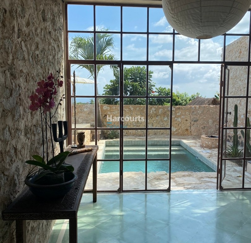 Sitting on a compact yet cleverly utilized 130m² of land, the villa features a building designed to maximize space, light, and flow. The interiors are infused with Mediterranean flair—textured walls, soft curves, neutral tones, and handcrafted finishes—giving a warm and inviting ambiance throughout. The spacious living area opens seamlessly onto a sun-drenched sundeck and pool lounge area, where the 4.15m x 2.85m swimming pool is perfectly positioned to enjoy the sweeping ocean horizon.