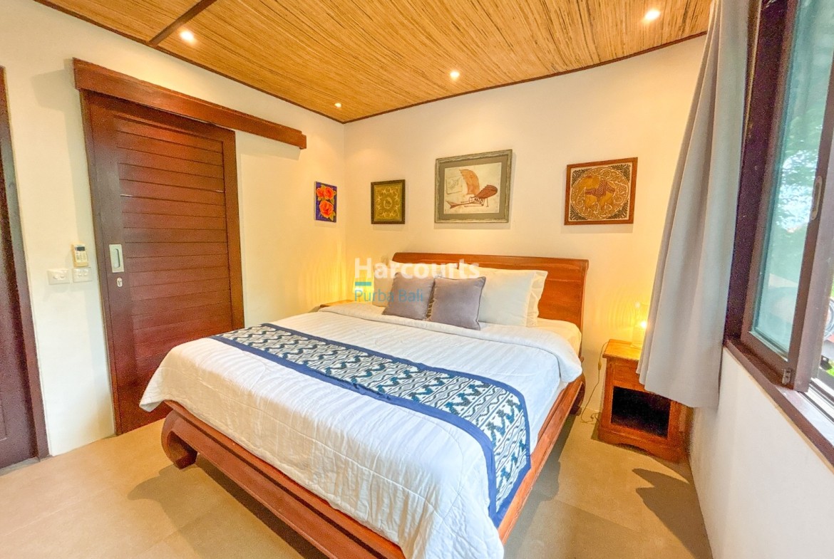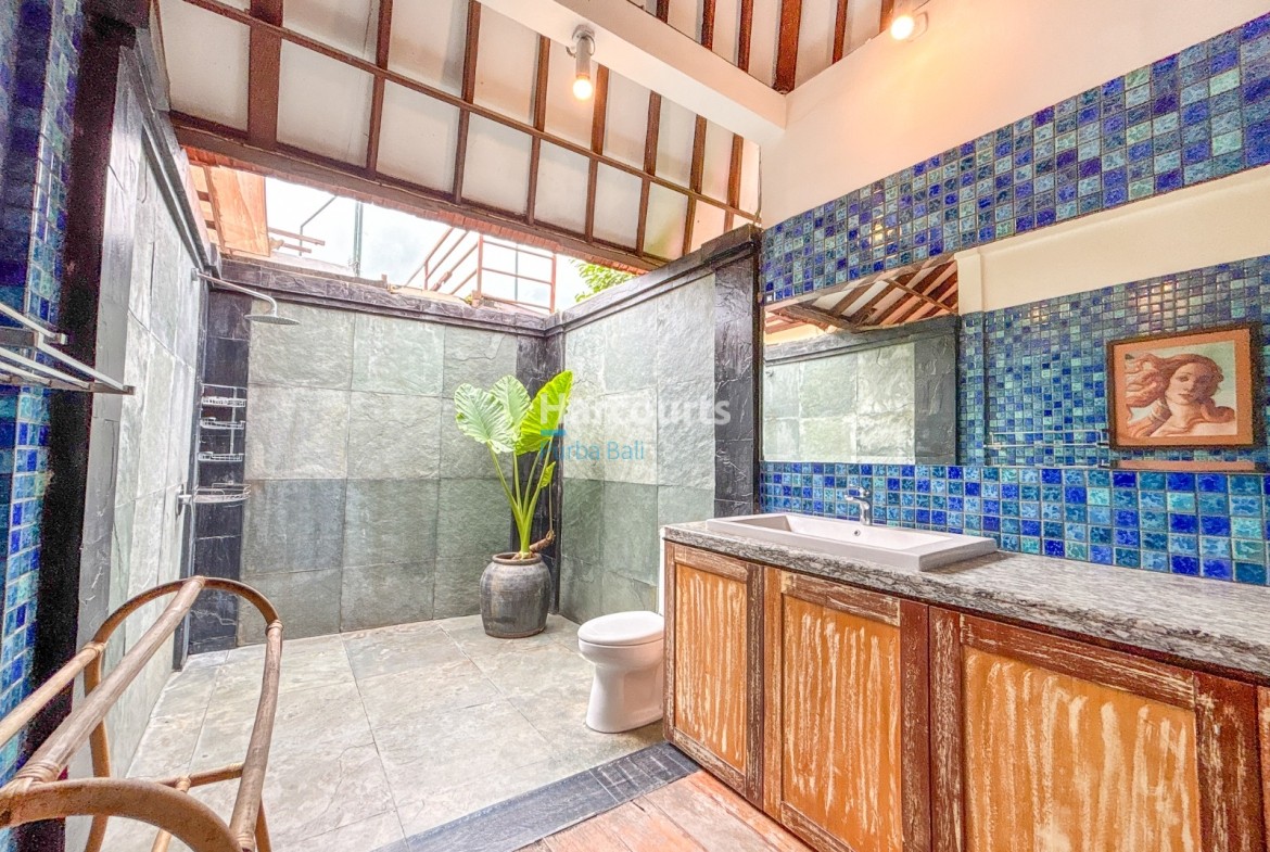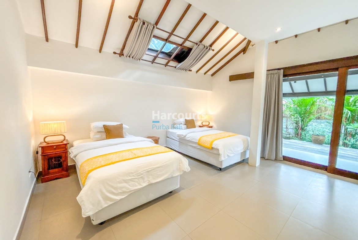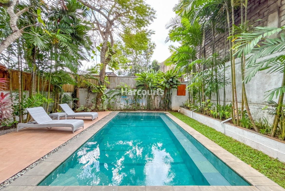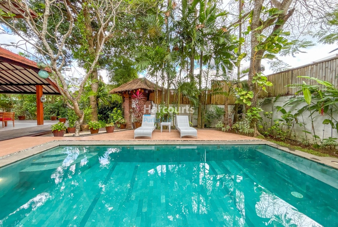 The villa features a Balinese open style living space on the ground floor providing a cool, relaxed and green ambiance and it also includes a guest bathroom and a fully equipped kitchen with elegant teak cabinets, Egyptian red granite counter tops, full size oven and an adjoining pantry for additional storage. The property also has a 3-metre access road and parking for a car and motorbike. The villa has a lovely garden with several trees (including a big mango tree) and a 8m x 4m swimming pool that uses saltwater filtration system instead of chlorine.