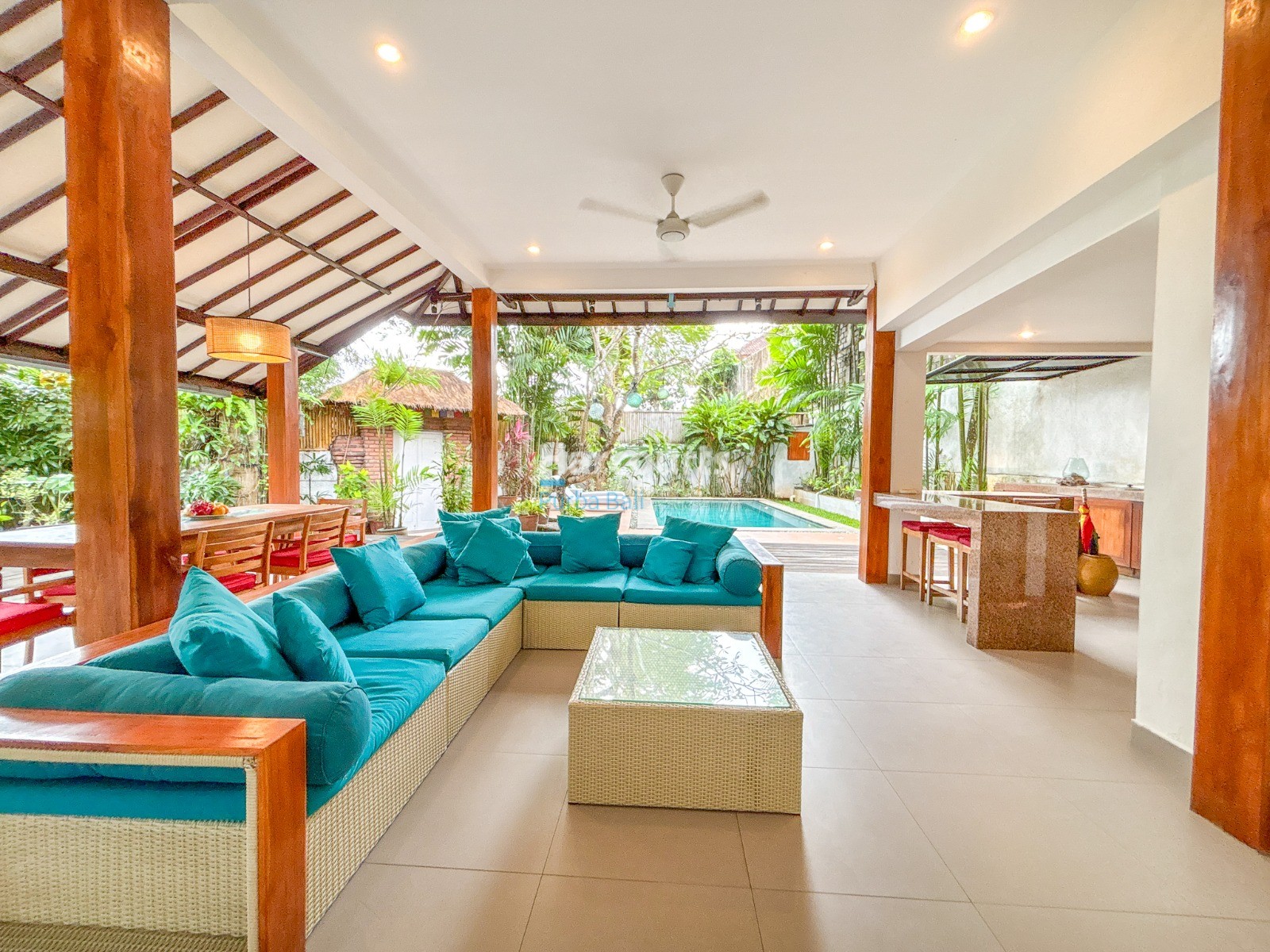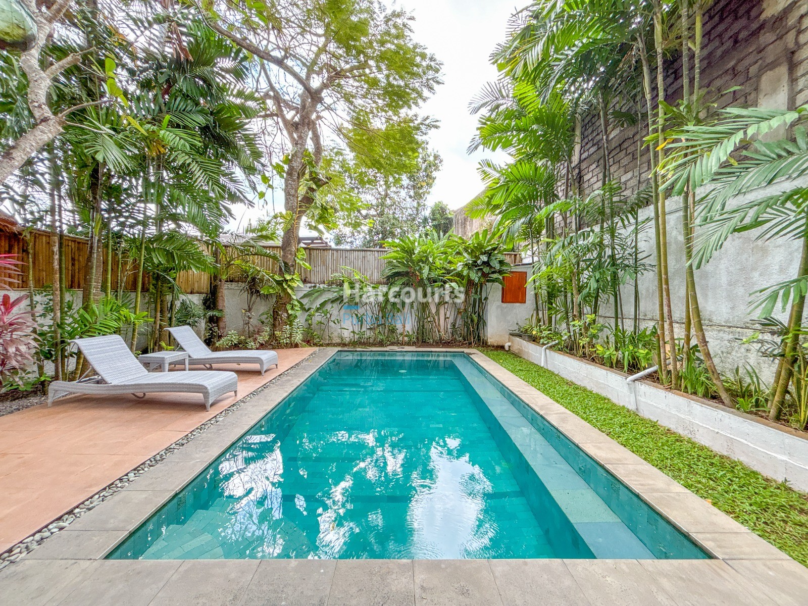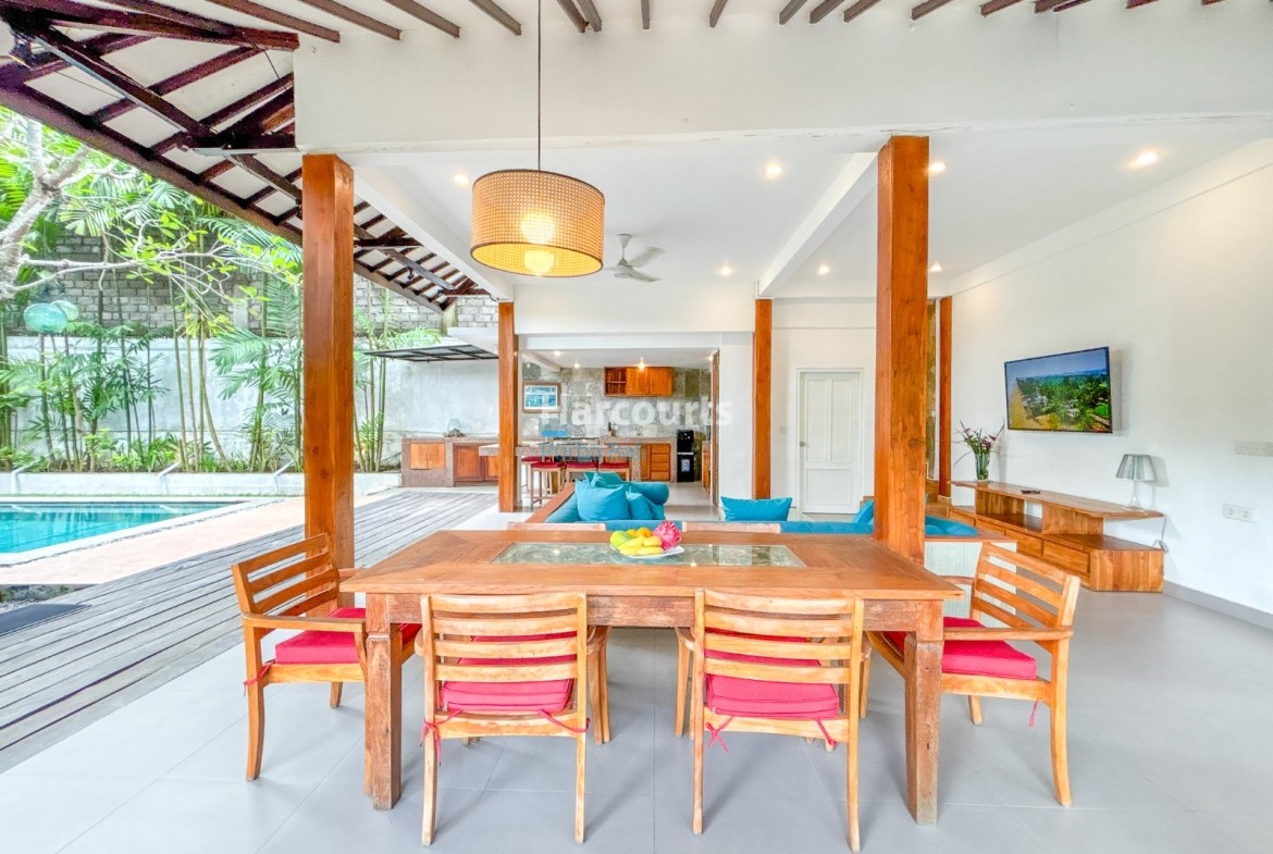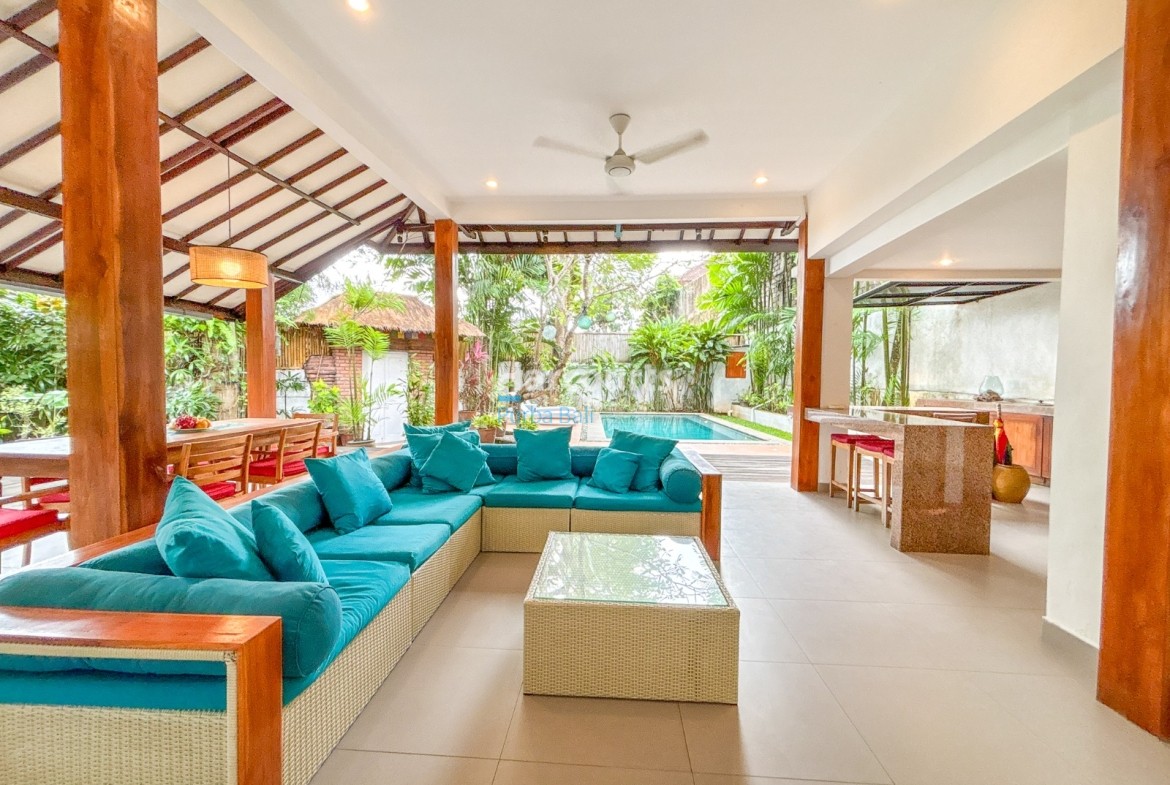 The villa features a Balinese open style living space on the ground floor providing a cool, relaxed and green ambiance and it also includes a guest bathroom and a fully equipped kitchen with elegant teak cabinets, Egyptian red granite counter tops, full size oven and an adjoining pantry for additional storage. The property also has a 3-metre access road and parking for a car and motorbike. The villa has a lovely garden with several trees (including a big mango tree) and a 8m x 4m swimming pool that uses saltwater filtration system instead of chlorine.