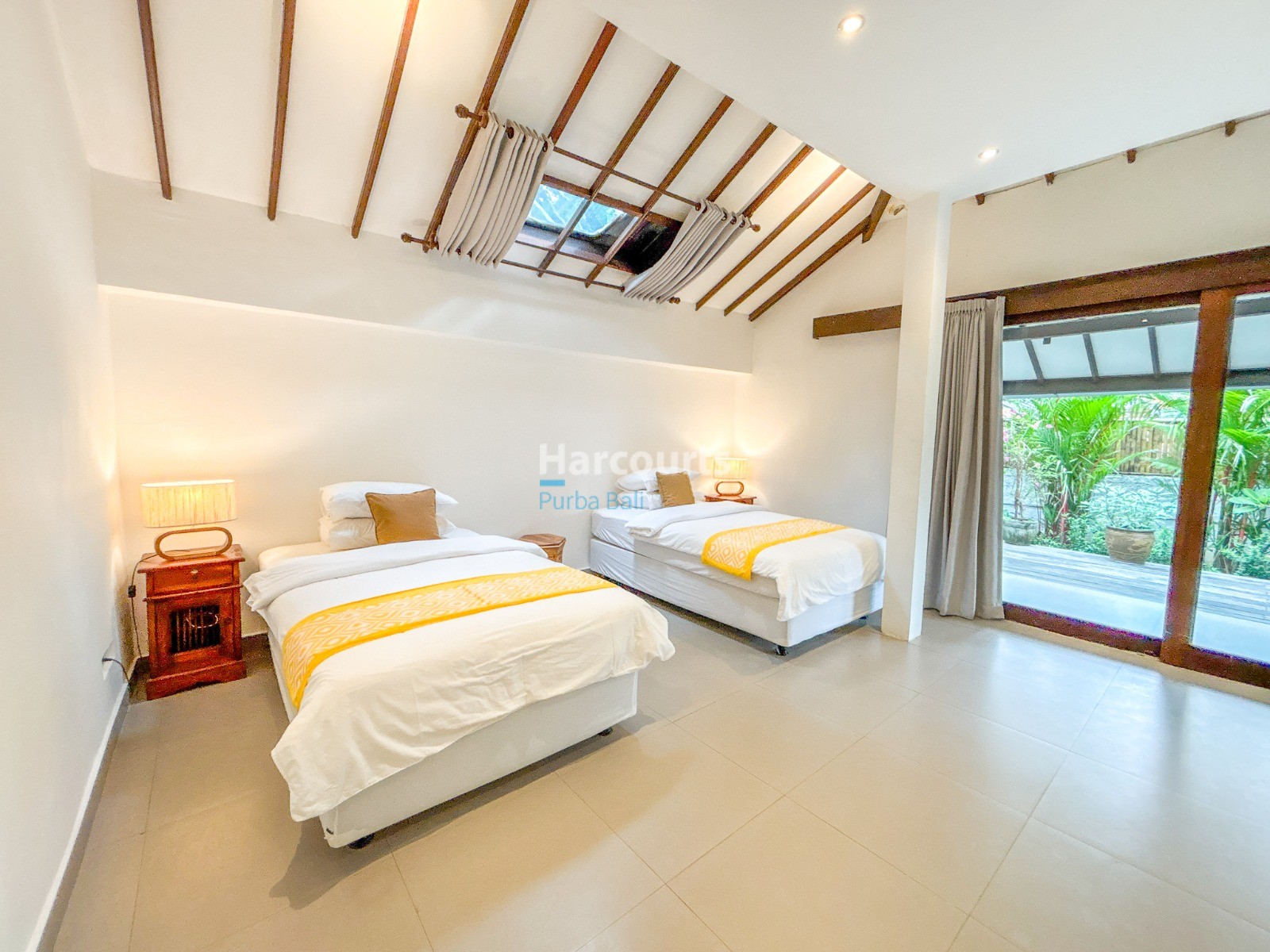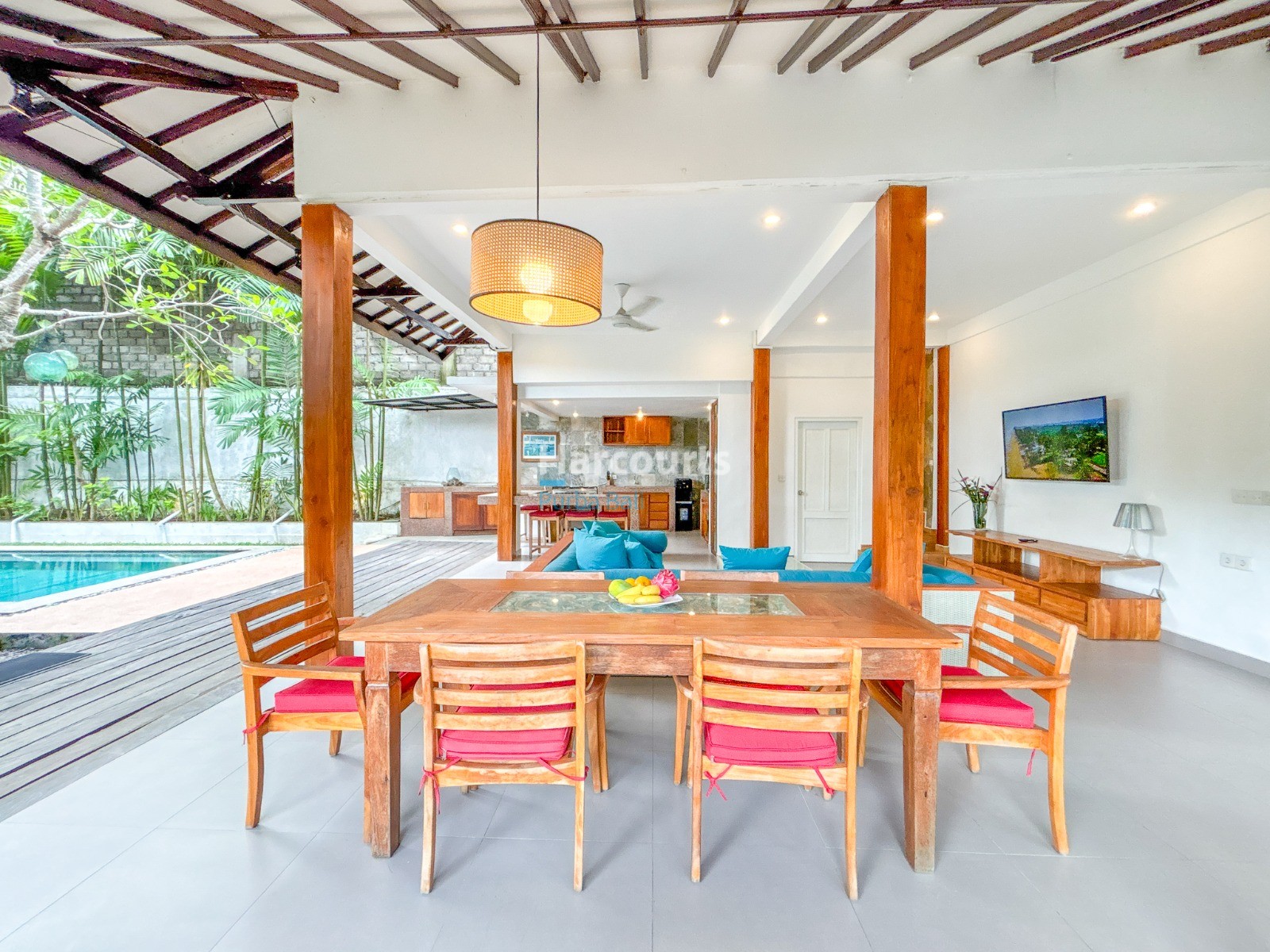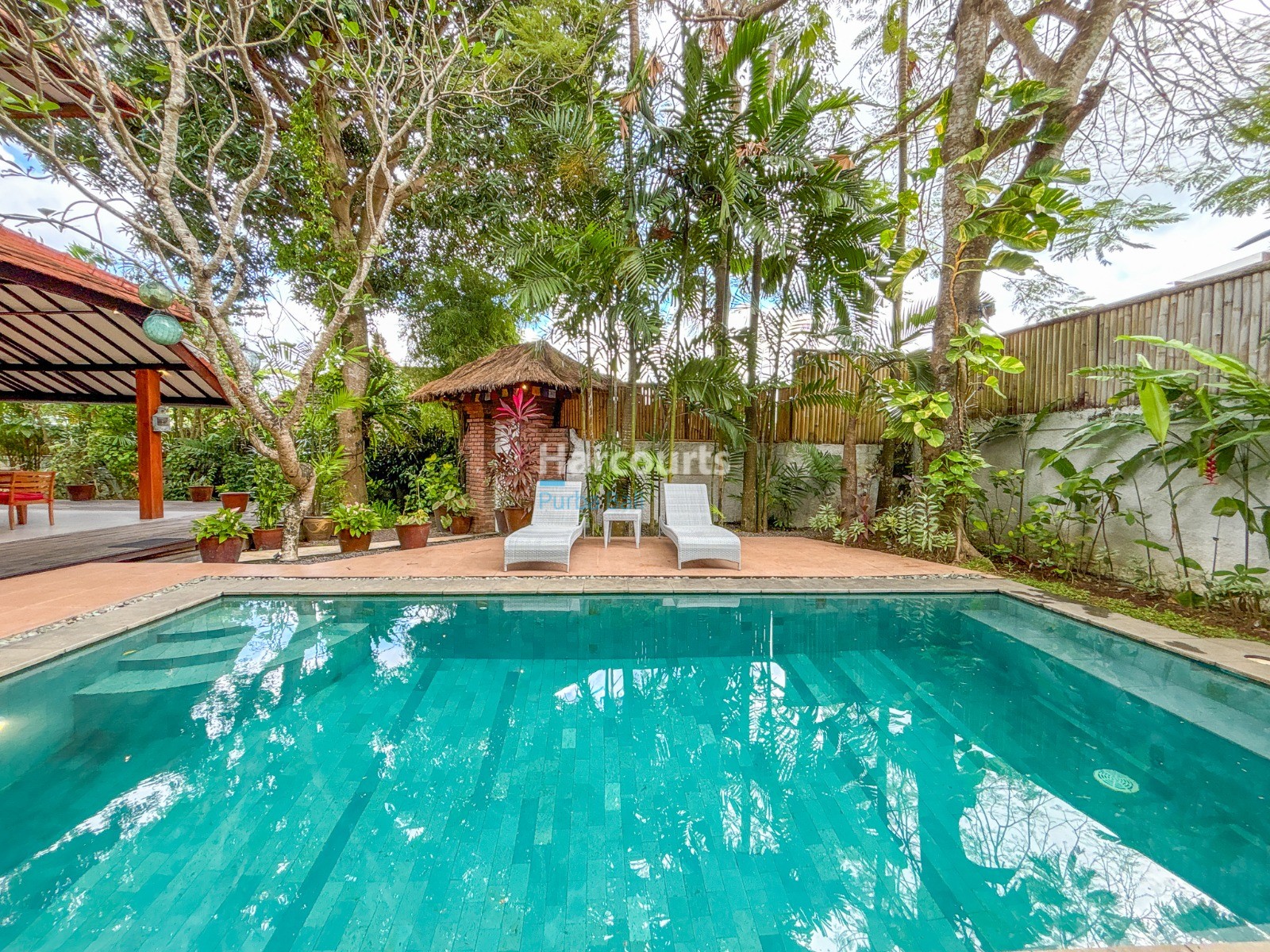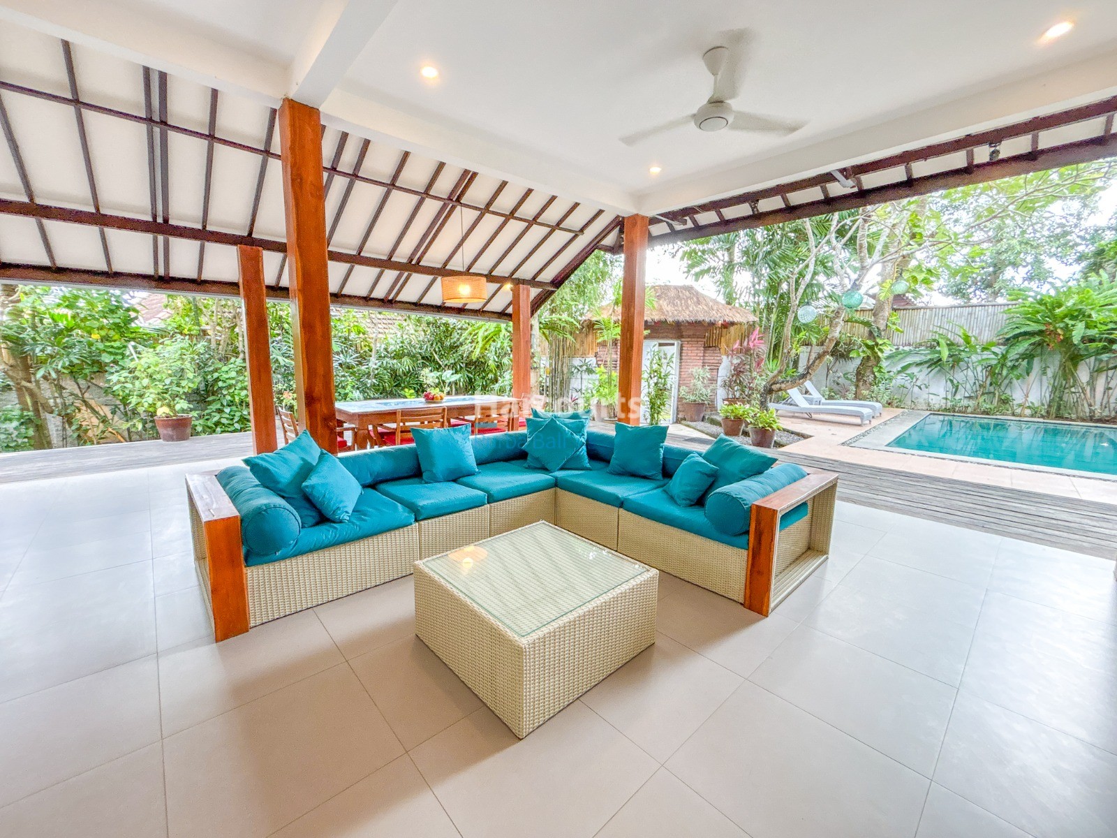 The villa features a Balinese open style living space on the ground floor providing a cool, relaxed and green ambiance and it also includes a guest bathroom and a fully equipped kitchen with elegant teak cabinets, Egyptian red granite counter tops, full size oven and an adjoining pantry for additional storage. The property also has a 3-metre access road and parking for a car and motorbike. The villa has a lovely garden with several trees (including a big mango tree) and a 8m x 4m swimming pool that uses saltwater filtration system instead of chlorine.