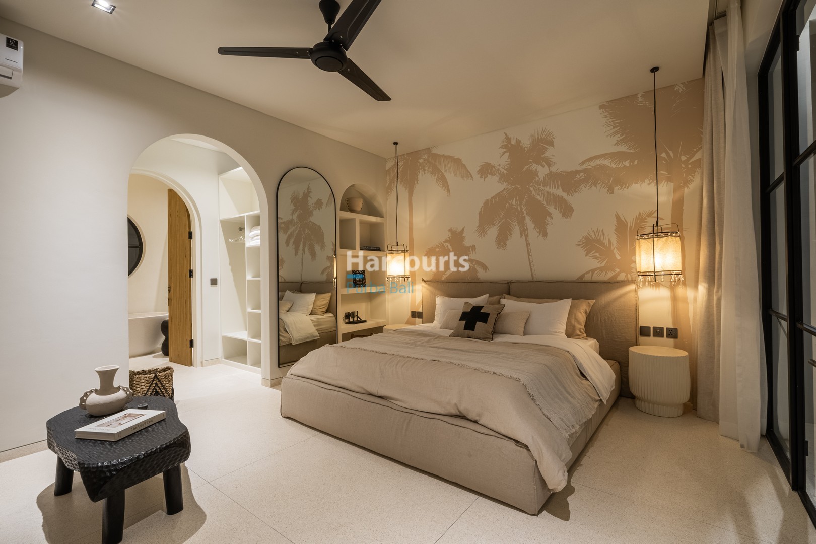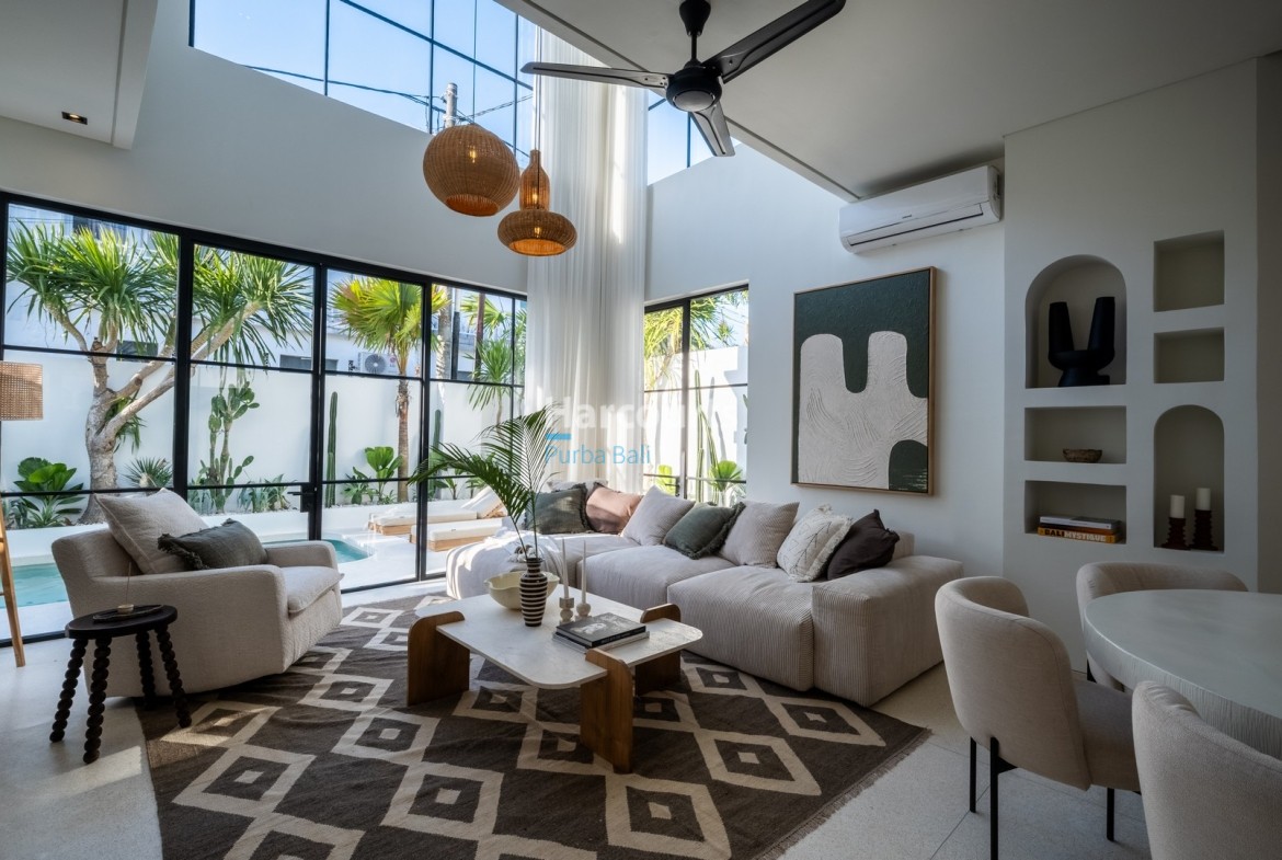 Set on 244 sqm of land with a build size of 172 sqm, the Modern Mediterranean villa consists of 3 ensuite bedrooms. The master bedroom is spacious with a good size balcony and large dressing room. The glamorous ensuite bathroom contains terrazzo bathtub, double vanity basins and quality black tapware. The villa also has a staff room and a carport. The interiors are designed and decorated by Tina Kirschner, leading international interior designer behind many successful villa projects both in Europe and Bali. The upmarket lighting concept is by a European lighting designer. The villa benefit from a 5-year structural warranty and a 1-year roof waterproofing warranty. The villa is built on elevated land as well as being north facing which allows for an abundance of natural light and ventilation with lots of all day sun around the 6.50 m x 2.5 m pool. Featuring strong galvanized steel French doors and windows, giving the ability for living areas to be fully enclosed for security and air conditioning or open for natural ventilation and indoor-outdoor living. A 6-metre-high void over the living room area adds to the natural light and spaciousness of the downstairs living area. The floors throughout the villa are polished terrazzo. Furniture package available upon request.
