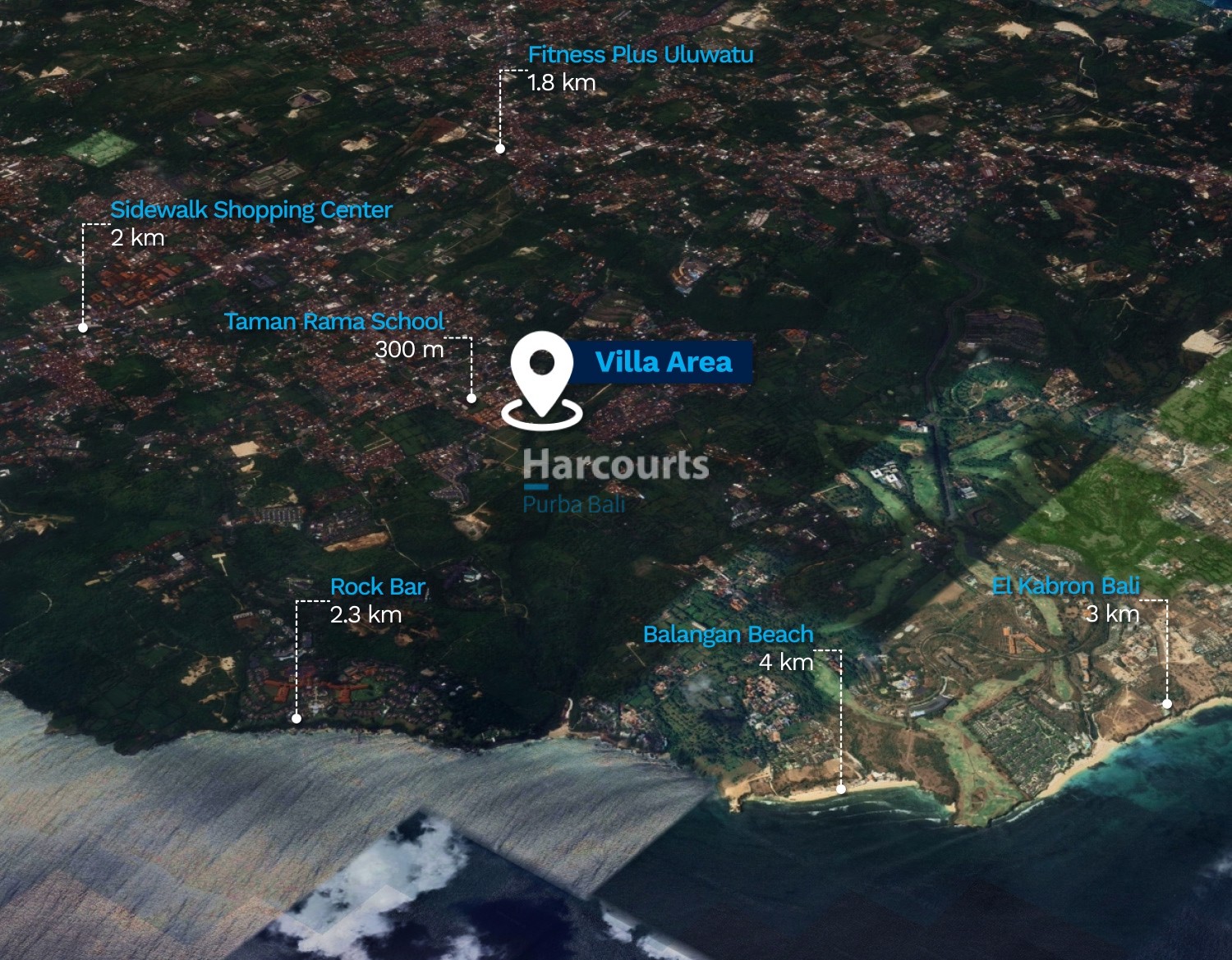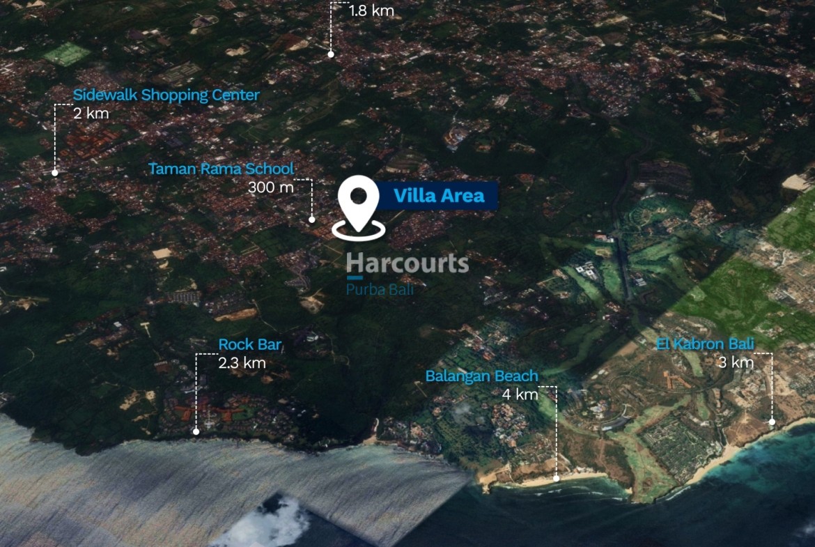 Nearby: Taman Rama School 300 m, Fitness Plus Uluwatu 1.8 km, Sidewalk Shopping Center 2 km, Rock Bar 2.3 km, Jimbaran Beach 3 km, El Kabron Bali 3 km, Udayana Hospital 3.8 km, Padang Padang Beach 4.5 km.