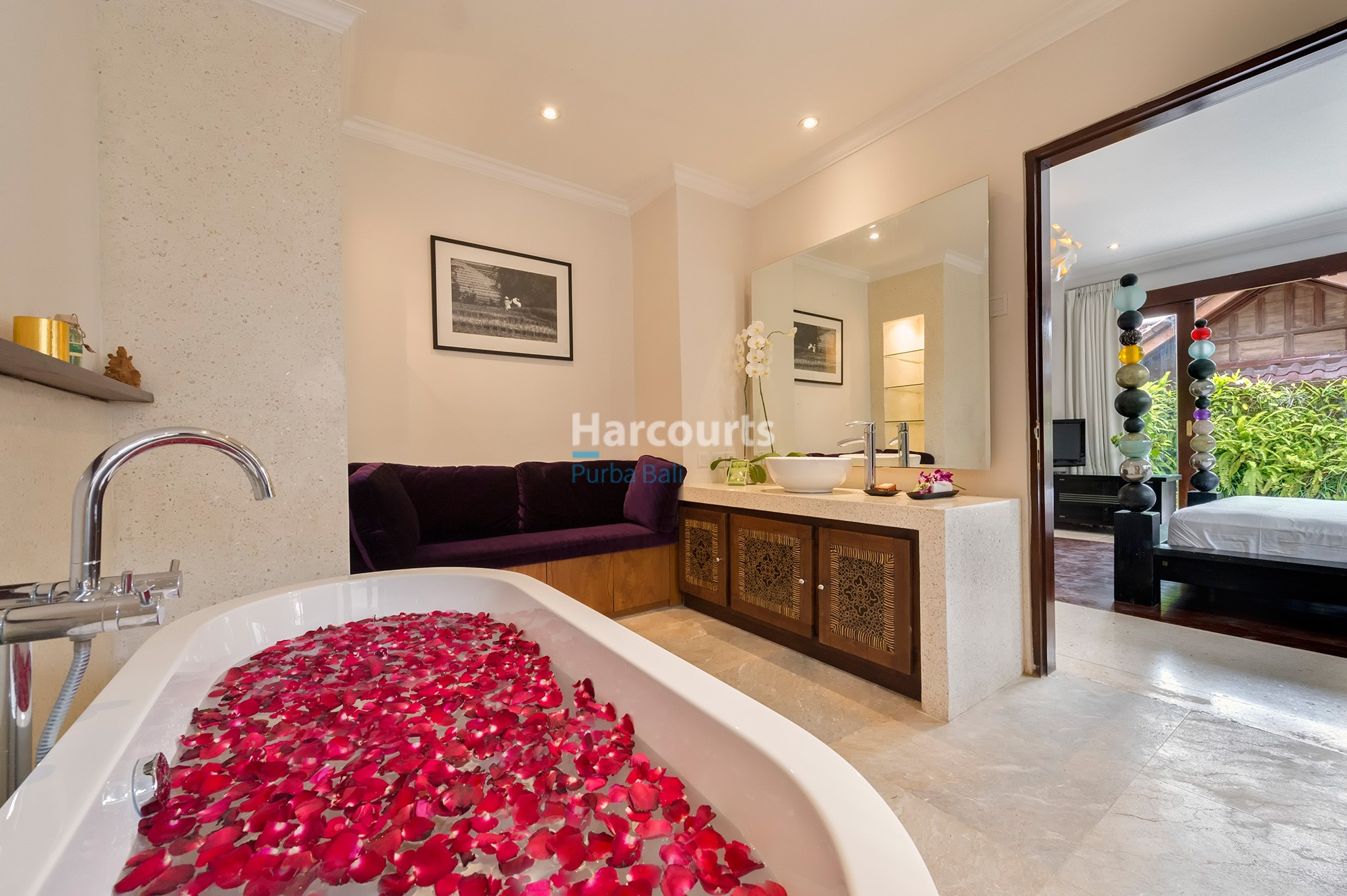 Spreading across 5848 sqm, the beautifully designed contemporary FREEHOLD villa boasts glorious views of rice fields that form part of the property. The villa with a total built size of 1500 sqm comprises four pavilions set around a large, gorgeous tiered garden (ideal for weddings and social events) and 17m x 4m lap pool. Kids have their own pool to frolic in. Be greeted by a sense of calm as you enter through the main pavilion to the extensive indoor and outdoor living areas and be awed by the high vaulted ceilings decorated in ornate carvings and hand painted panelling. The seating area has a massive leather sofa that can easily seat everyone in the family.