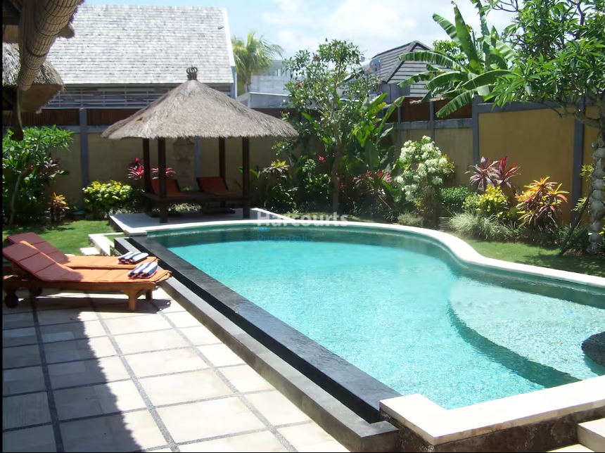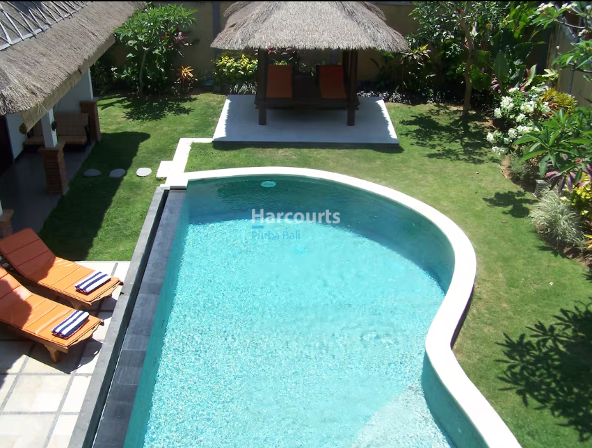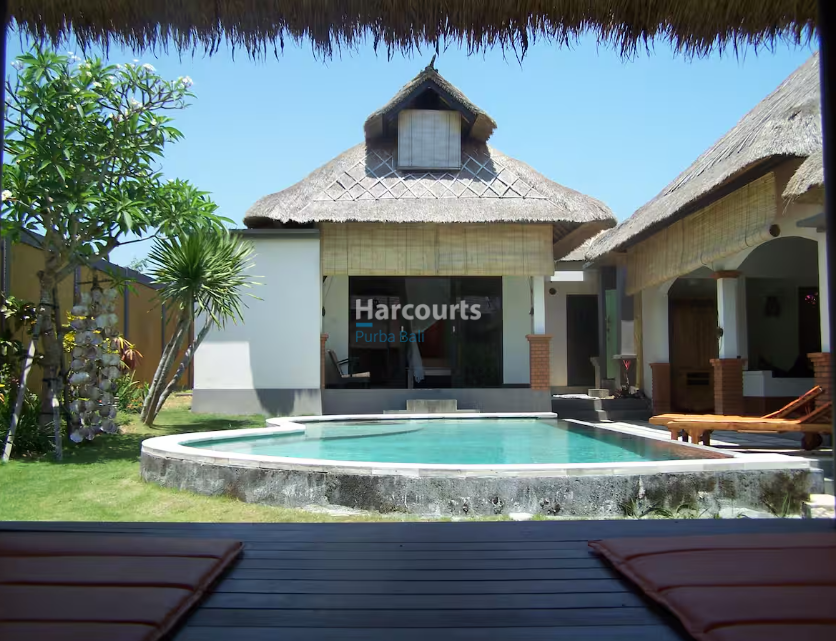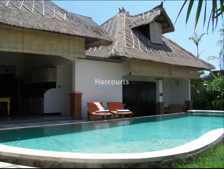 The villa’s curved swimming pool becomes the visual centerpiece, surrounded by manicured gardens, a classic alang-alang gazebo, and sun loungers that feel made for lazy afternoons. The thatched-roof architecture gives it a timeless Balinese feel, while the open-plan living and kitchen area adds a breezy flow ideal for daily living or entertaining friends.