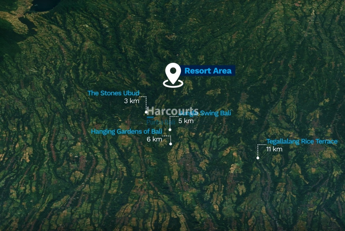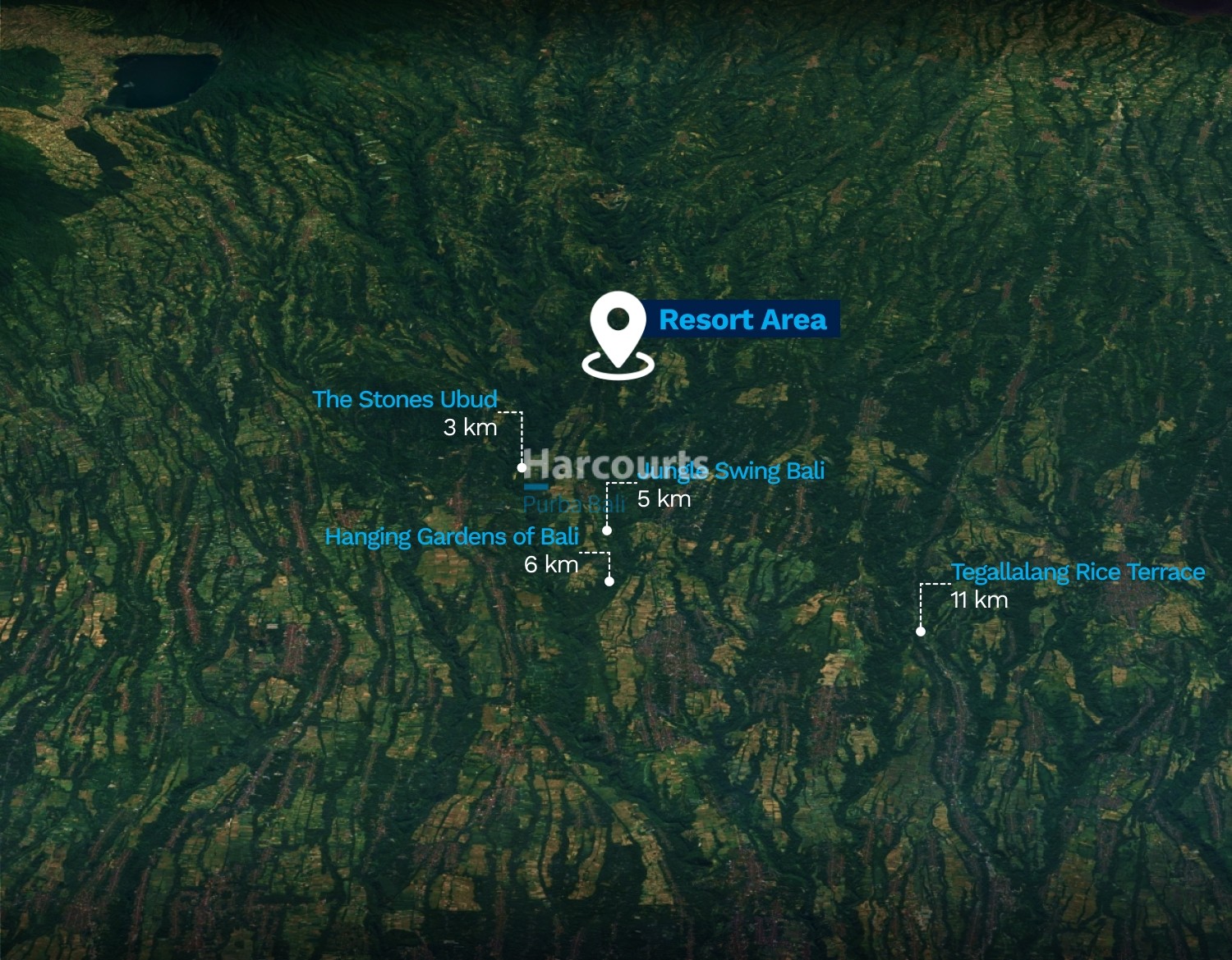 Nearby: The Stones Ubud 3 km, Jungle Swing Bali 5 km, Hanging Gardens of Bali 6 km, Tegallalang Rice Terrace 11 km, Campuhan Ridge Walk 15 km,