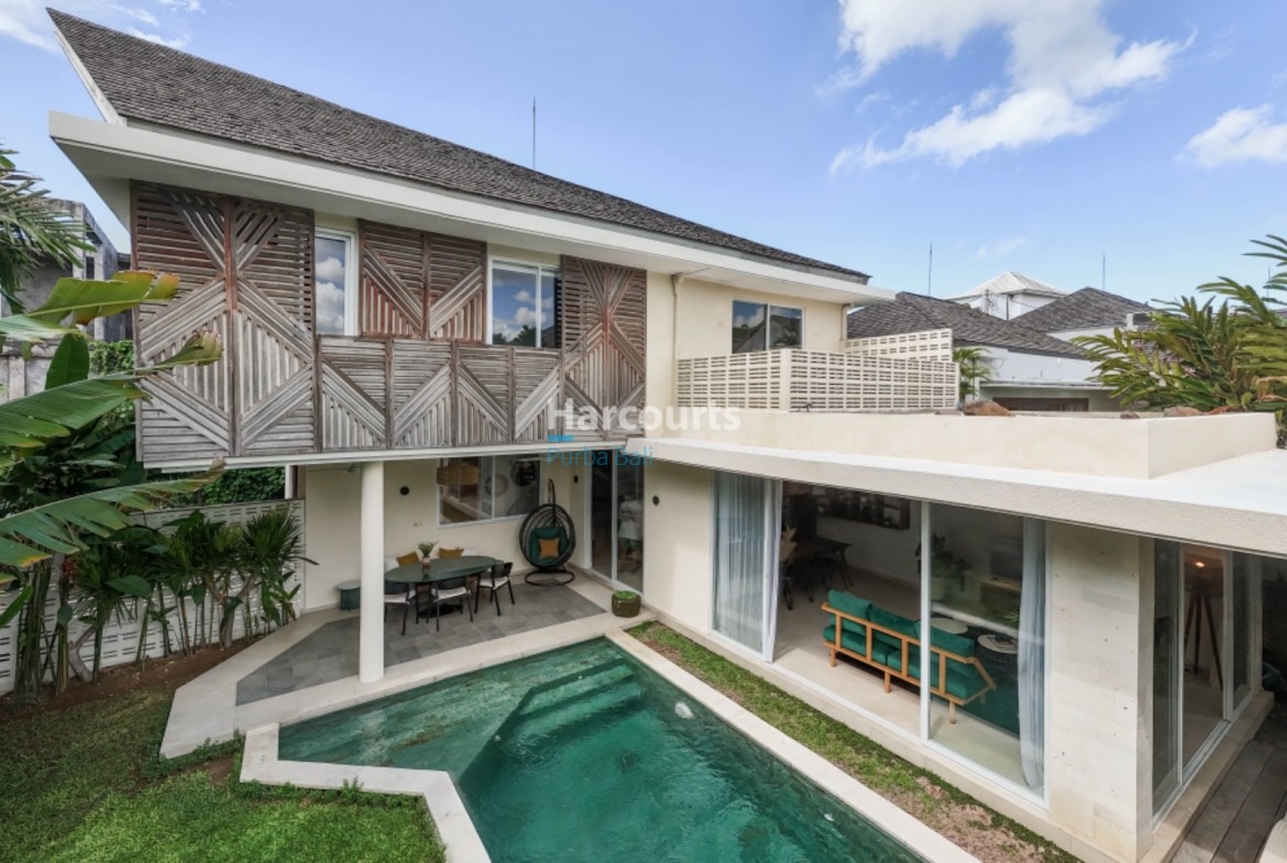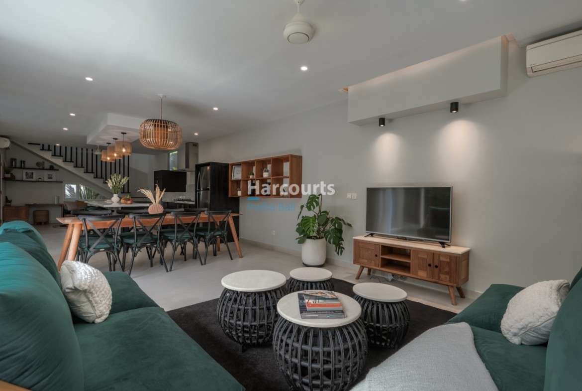 Berawa — a stylish three-bedroom, three-bath villa offered for yearly rental, fully furnished and anchored by a private swimming pool and a bright, enclosed living area that makes this a true turnkey residence. The 180 m² interior across two levels is designed for effortless living, with an open heart where living and dining flow into a well-equipped kitchen.