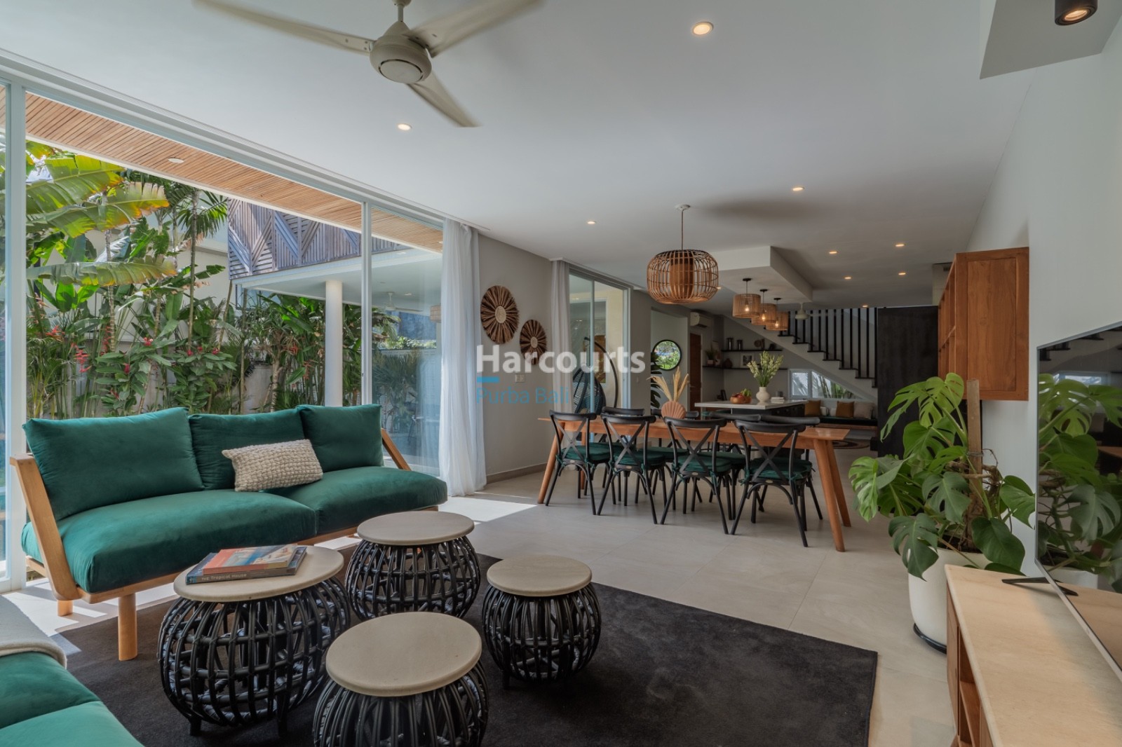 Interiors combine contemporary finishes with natural textures: a central island with a white countertop and dark cabinetry, woven pendant lights above the island, and modern appliances integrated into the layout. The living room features two green upholstered sofas with wooden frames, layered with round coffee tables and soft sheer curtains framing views of tropical planting. A staircase rises to the upper level where wooden shutters and generous windows add warmth; bedrooms show light-coloured tiled floors, wooden bed frames and subtle abstract art.