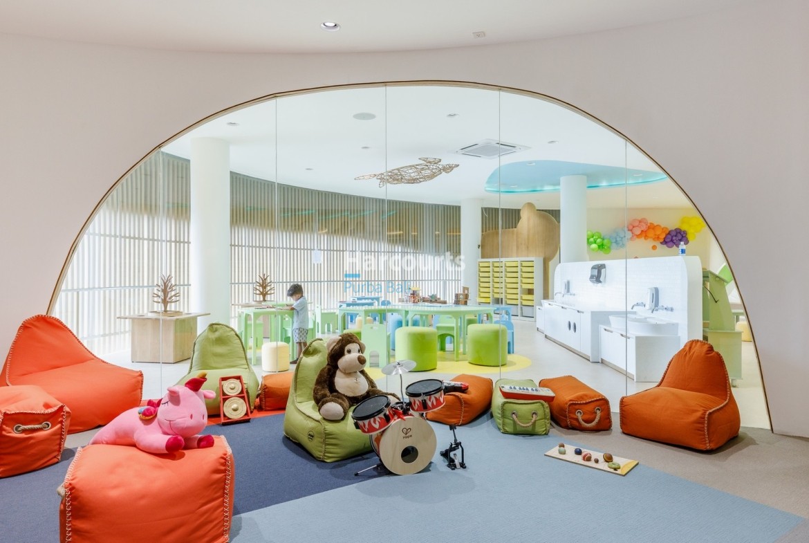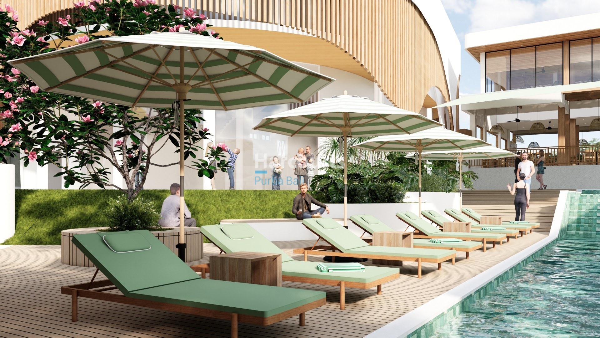 Outside, the living area extends to a 21 m² swimming pool and terrace set against tropical planting and palm trees, with sliding glass doors, white walls and warm wooden exterior accents under a sloped roof overhang; two poolside loungers emphasise the relaxed, private vibe. Residents also enjoy extensive communal facilities including a padel centre, communal laguna pool, family café, surf school, full‑day kids club and a steam and wellness centre, complemented by the property’s tourism (Pariwisata) zoning suitable for short-stay use.