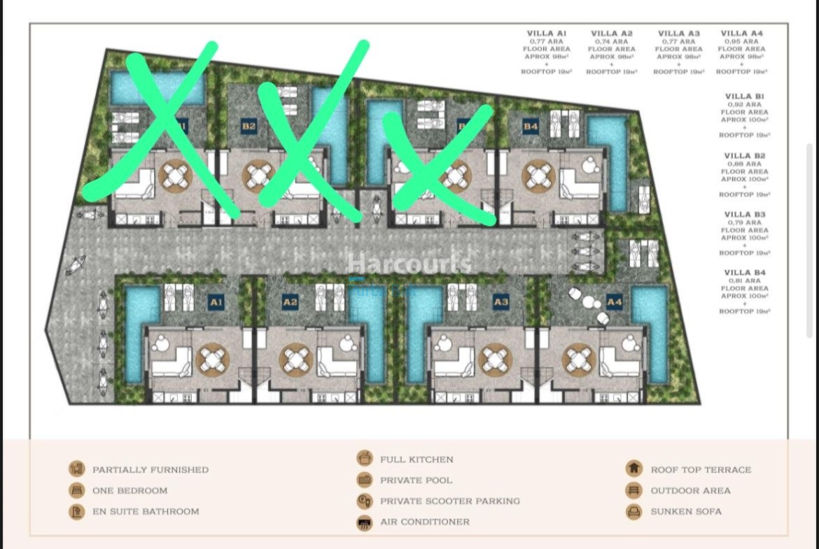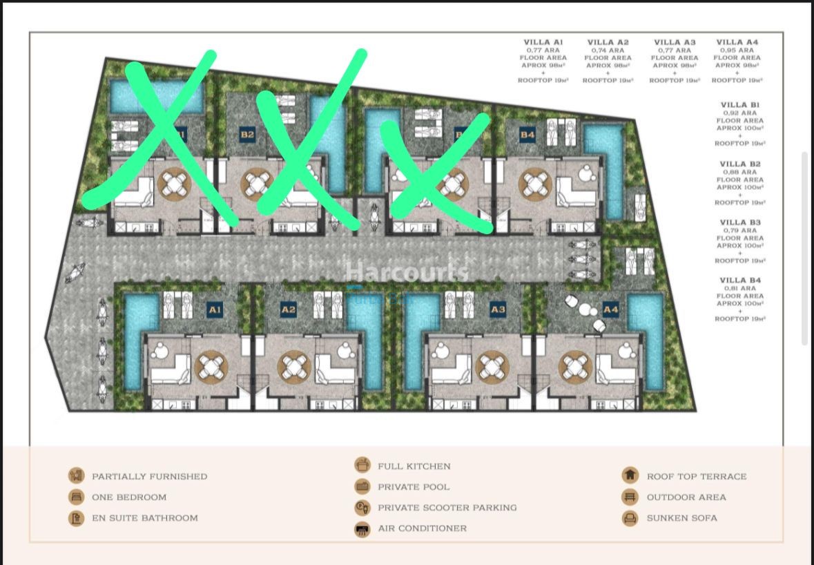 Thoughtfully visualized and well finished throughout, the villa is sold on a LEASEHOLD OF 25 years with the option to extend 25 years. The property has a living space of approximately 100 sqm over 2 levels and features a very welcoming sunken lounge, open-plan living/dining area along with a full kitchen. The 6 metre long swimming pool and outdoor lounge area merge seamlessly with the indoor living space creating a relaxed oasis, full of light and airflow. The bedroom is bright yet cozy with a luxurious ensuite bathroom. There is also private parking for your scooter. Its sophisticated design also boasts a 20 sqm roof top terrace, the perfect spot for sunset cocktails while taking in the views.