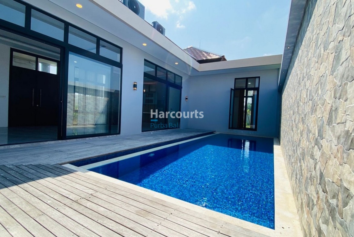 The modern FREEHOLD villa was completed in November 2022. This piece of prime property is located in a peaceful street with a good 5 metre access road and is surrounded by other luxury villas. Located in the established neighbourhood of Umalas – home of million-dollar homes, popular with expats and tourists alike. Plenty of cafes, restaurants and shops can be found in this charming area that has a friendly village feel. This villa is close to International Schools (Canggu, French, Montessori & Pro Ed) and is also minutes away from Berawa and Batu Belig beaches. Chic Seminyak and trendy Canggu are a short drive away.