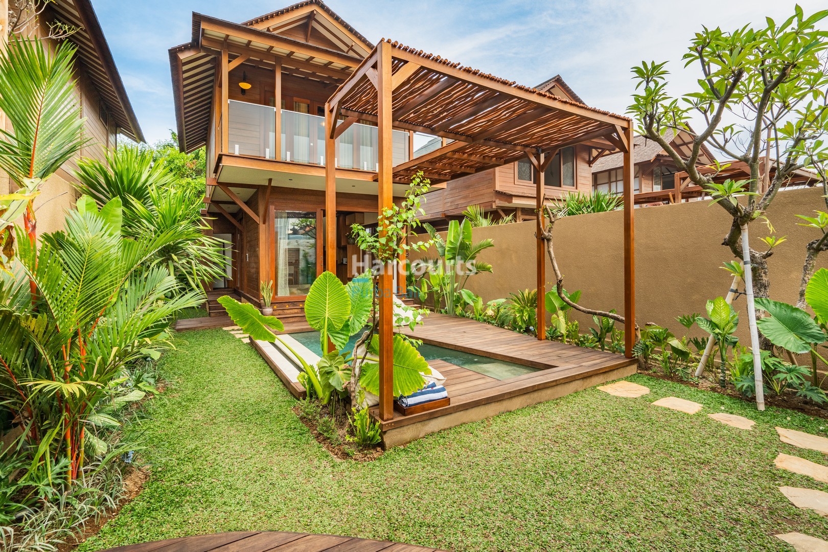 Set on a 2-are (~200 m²) plot, the outdoor space is a private oasis — a small rectangular pool edged with timber decking, a wooden pergola for partial shade, plush cushions for lounging and a stepping-stone path through lush planting. The garden and yard are enclosed by a perimeter wall and include private parking, delivering both security and seclusion.