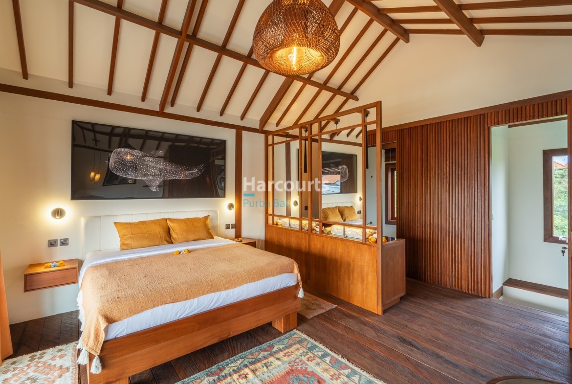 Inside, an open-plan living and dining area unfolds through large glass sliding doors, accentuated by wooden flooring and a ceiling lined with timber slats. The kitchen features green cabinetry, a wooden countertop and white tiled splashback, complemented by a black refrigerator and gas stove. Bespoke joinery appears throughout: a built-in wooden shelf, a stone basin beneath a rectangular wooden-framed mirror, and a walk-in shower framed by green stone walls with a black showerhead. A spiral staircase rises to the upper level; the main bedroom presents a calm palette of white and beige, exposed wooden beams and a striking whale-shark artwork above the bed.