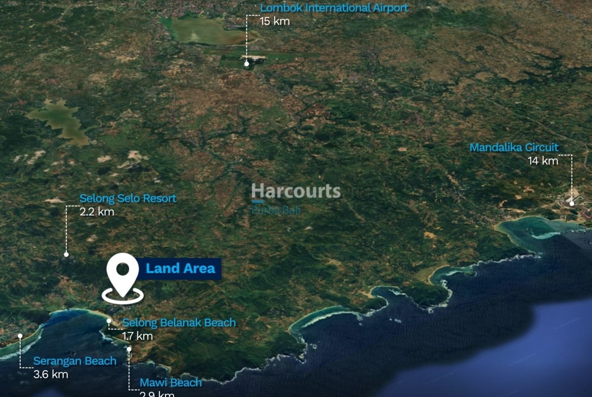 Positioned just 10 minutes from the world-renowned Selong Belanak Beach, this expansive 1.07-hectare (10,742 sqm) FREEHOLD plot in Central Lombok offers a rare opportunity for investors or developers seeking prime tourism-zoned land. Measuring approximately 98 by 109 meters, its almost square shape, flat-to-gently-sloping contour, and unobstructed ocean, valley, mountain, and sunset views create an ideal foundation for a luxury villa complex or boutique resort.