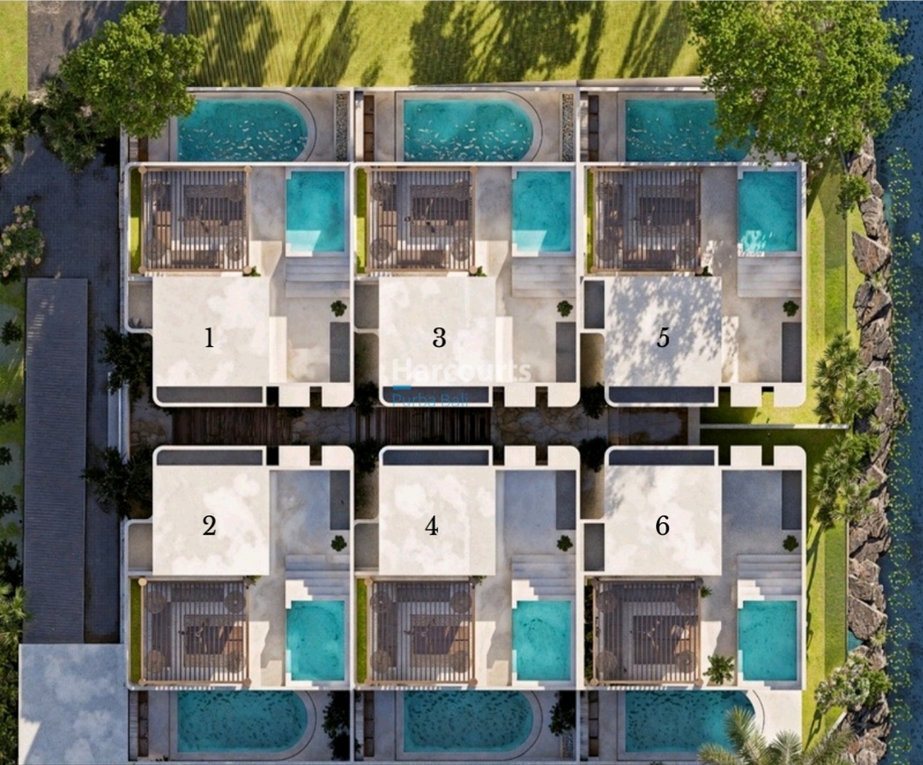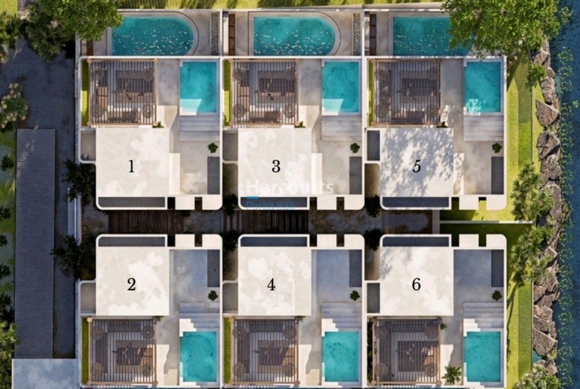 West-facing with a view toward a riverside green buffer, the villa is positioned in a quiet pocket of Batu Bolong with 3-meter private road access and onsite parking. Water is sourced from a private well.
