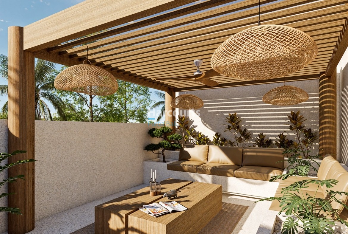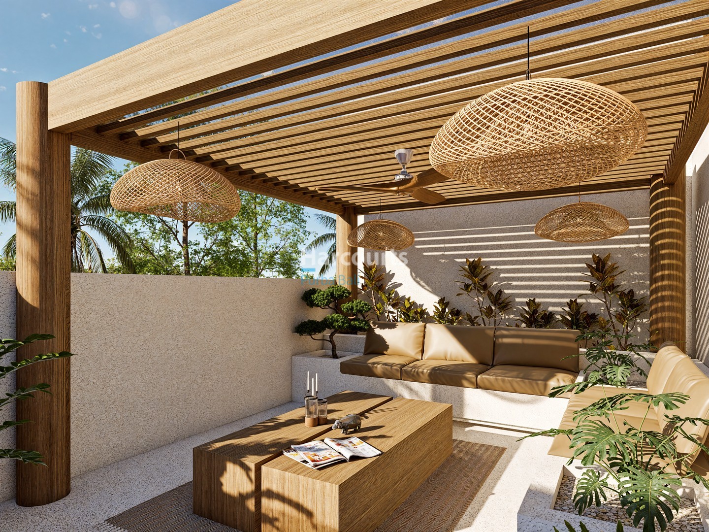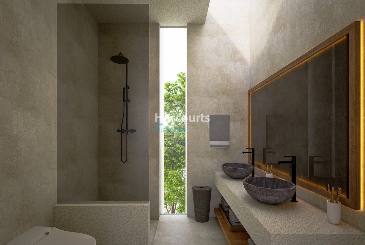 This 2-bedroom leasehold property is set across two floors with a rooftop lounge and plunge pool, offering 230 sqm of living space on 100 sqm of land. The ground floor features an enclosed living and dining area, a full kitchen, and large sliding glass doors that open to a 7×3 meter private pool. Upstairs, both bedrooms come with built-in storage, double vanities, and rain showers. The rooftop adds a second plunge pool and shaded seating area — ideal for sunset hours and private downtime.