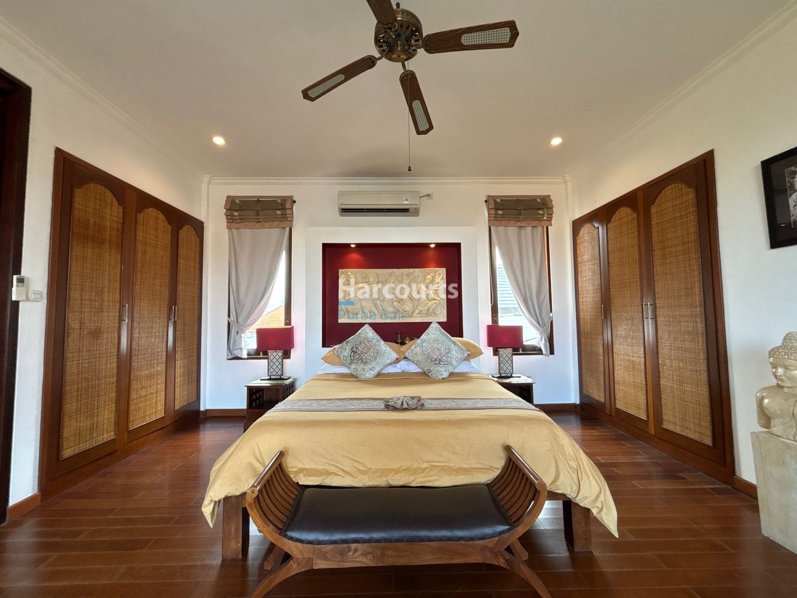 Interiors flow with an adaptable open-and-close concept that separates lounge and dining areas while leading to a fully equipped open-plan kitchen. Polished wood floors and high ceilings with exposed wooden beams create warmth and scale; large windows and sliding glass doors frame the garden and pool. Bedrooms are appointed with both ceiling fans and wall-mounted air conditioning, furnished with woven-texture wooden wardrobes, bedside tables and lamps, and decorative finishes including carved reliefs and accent artwork. Each ensuite features premium fixtures, with bathtubs and rain showers delivering a private, retreat-like atmosphere.
