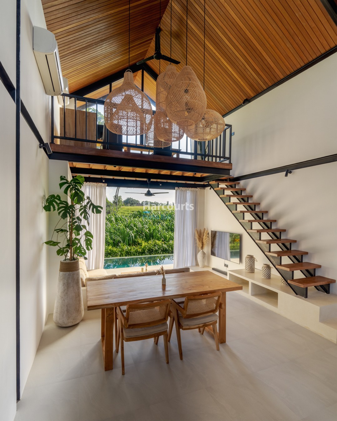 Inside, enclosed living and dining areas provide climate-controlled comfort while preserving a bright, airy feel. High, sloped ceilings with exposed wooden beams, floor-to-ceiling glazing dressed in sheer white curtains, and light stone or tile floors create a contemporary tropical palette. The living room is anchored by a light-coloured sectional and wooden coffee table, while a modern kitchen features a large island with integrated cooktop, black refrigerator, textured backsplash and pendant lighting — all arranged for effortless entertaining and daily living. Thoughtful details such as a chevron-patterned wooden door, a staircase with wooden treads and black railing, and woven pendant lights add warmth and texture.