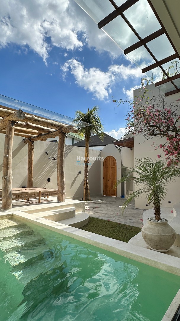 A private square pool (approx. 3 x 3 meters) sits just off the living area, creating a perfect space to cool off and relax. The villa has motorbike parking, well water, and villa zoning in place.