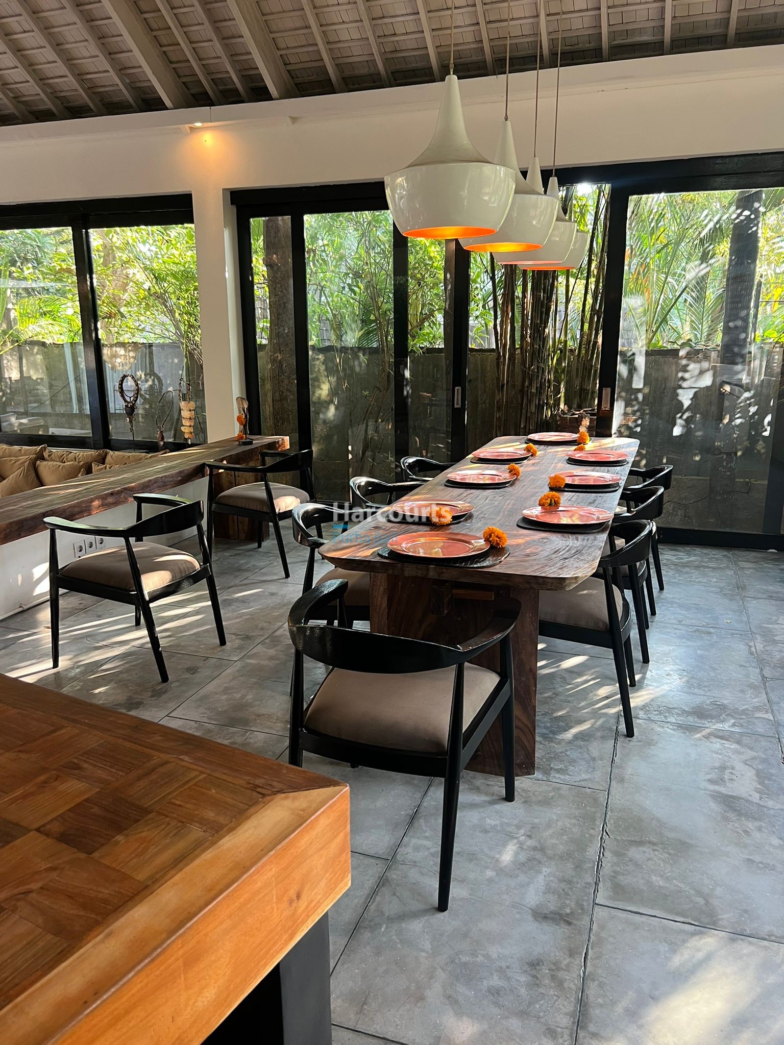 The villa features five ensuite bedrooms, each crafted for privacy and comfort, complemented by six bathrooms that include bathtubs, rain showers, and modern amenities. Large glass doors open directly to the pool, allowing natural light and refreshing breezes to flow throughout. The interiors blend contemporary design with warm touches, highlighted by patterned floors, high ceilings, and a welcoming lounge area perfect for entertaining.