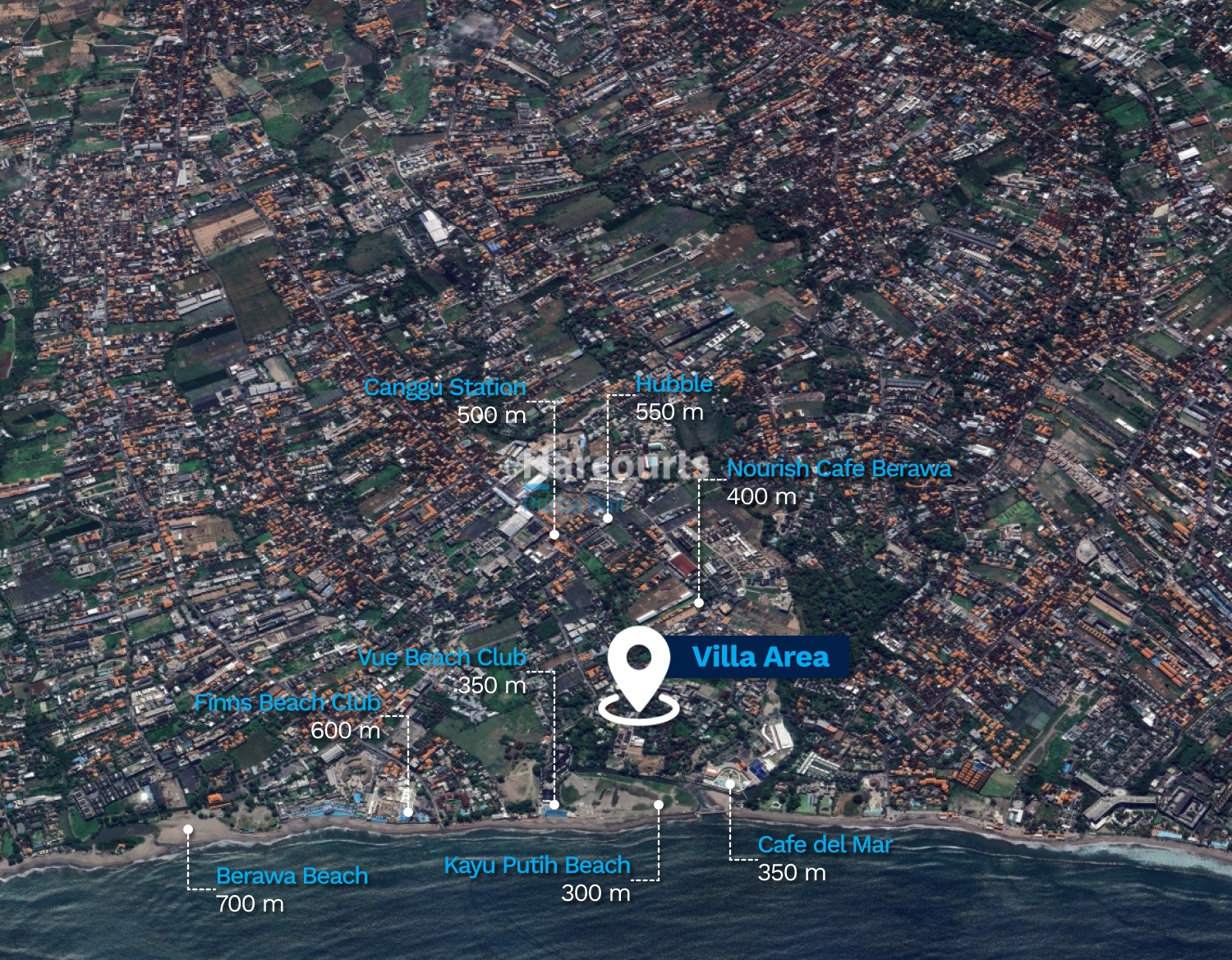 Nearby: Kayu Putih Beach 300 m, Vue Beach Club 350 m, Cafe Del Mar 350 m, Nourish Cafe 400 m, Canggu Station 500 m, Hubble 550 m, Finns Beach Club 600 m, Finns Recreational Club 600 m, Berawa Beach 700 m