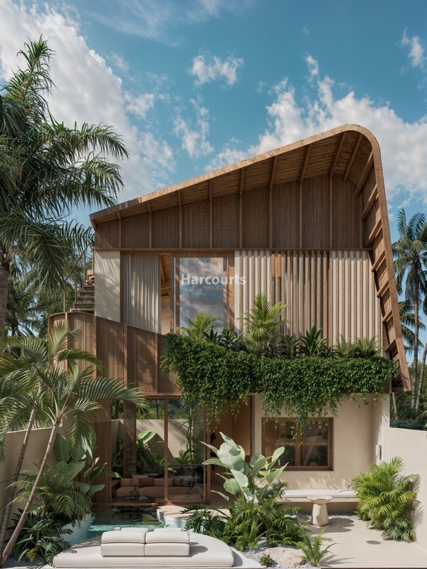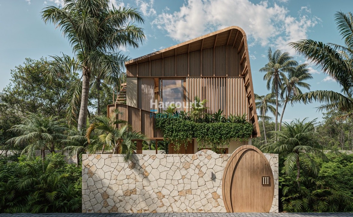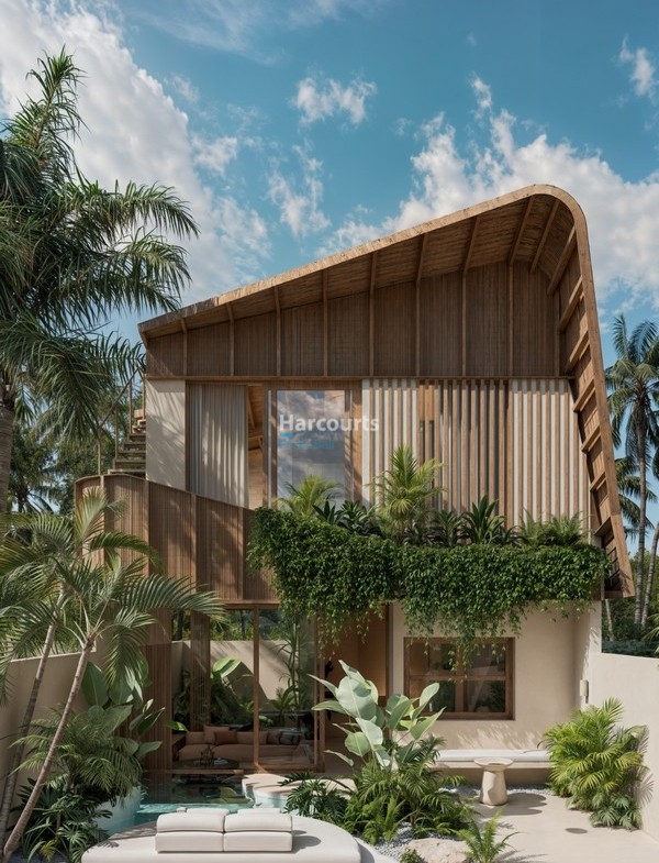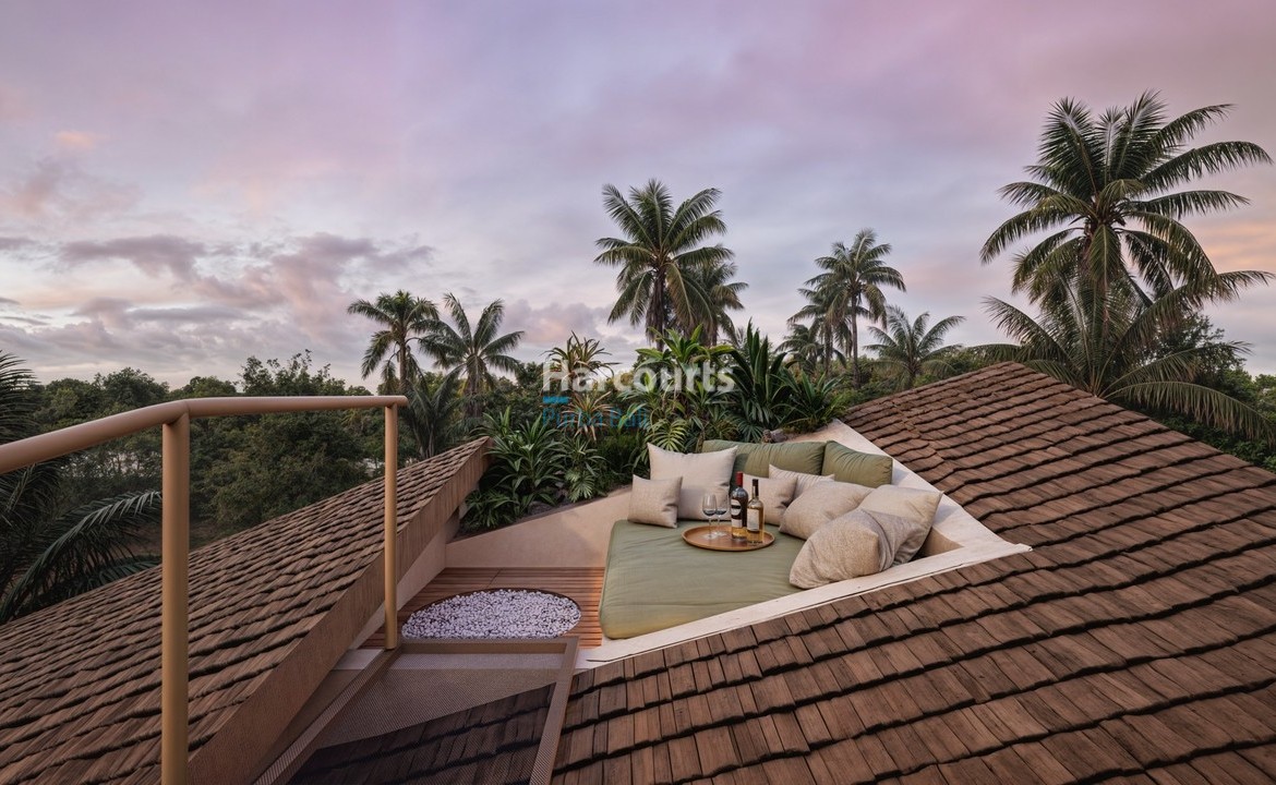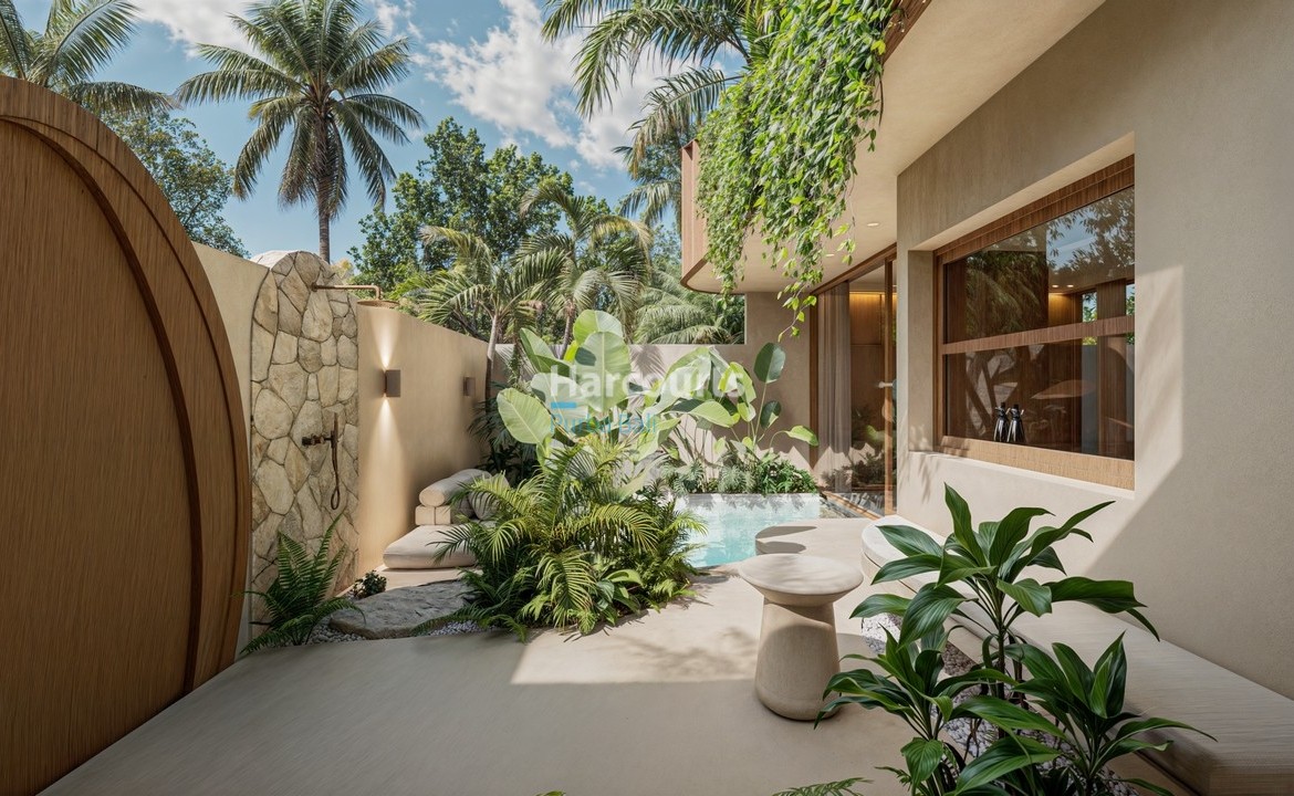 Outdoor living is quietly luxurious on this compact 0.75 are (~75 m²) plot. A private swimming pool with an integrated sunbed sits at the centre, accompanied by an 8 m² deck and an outdoor stone shower. Mature tropical planting, a curved wooden feature wall and stone perimeter create a secluded atmosphere, while a rooftop terrace delivers captivating ocean views. The property is fully enclosed and includes private parking.