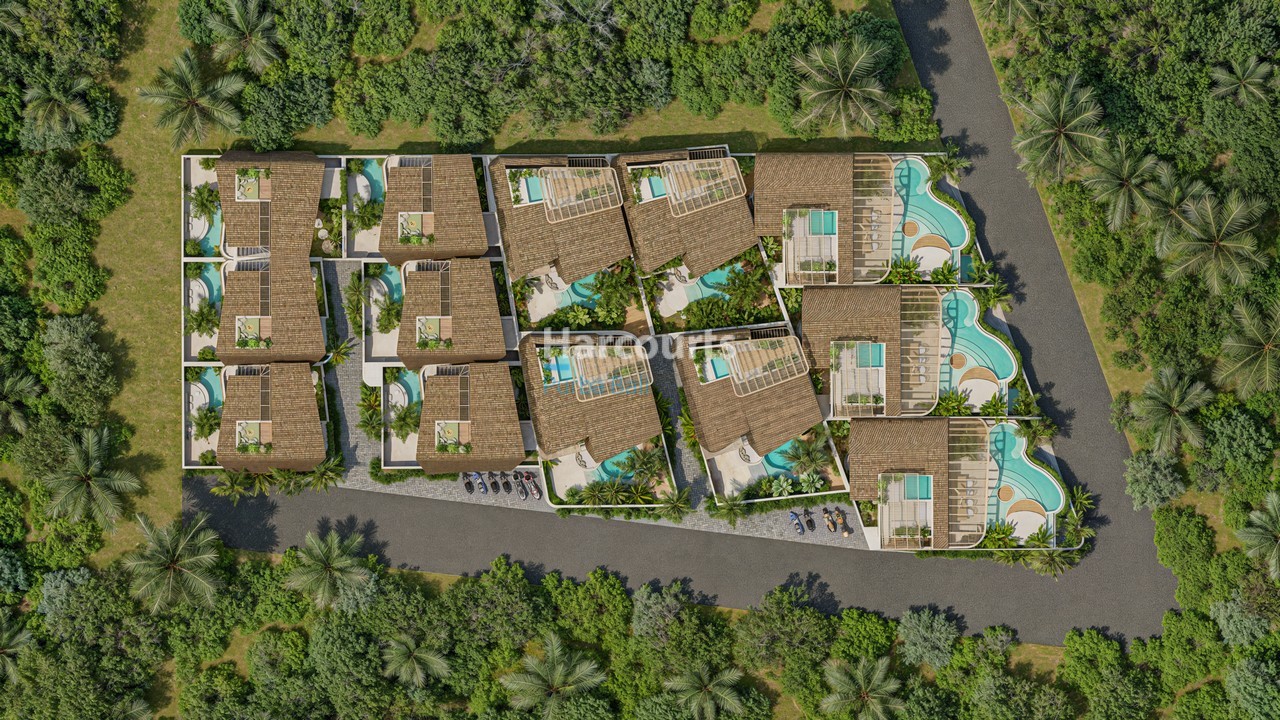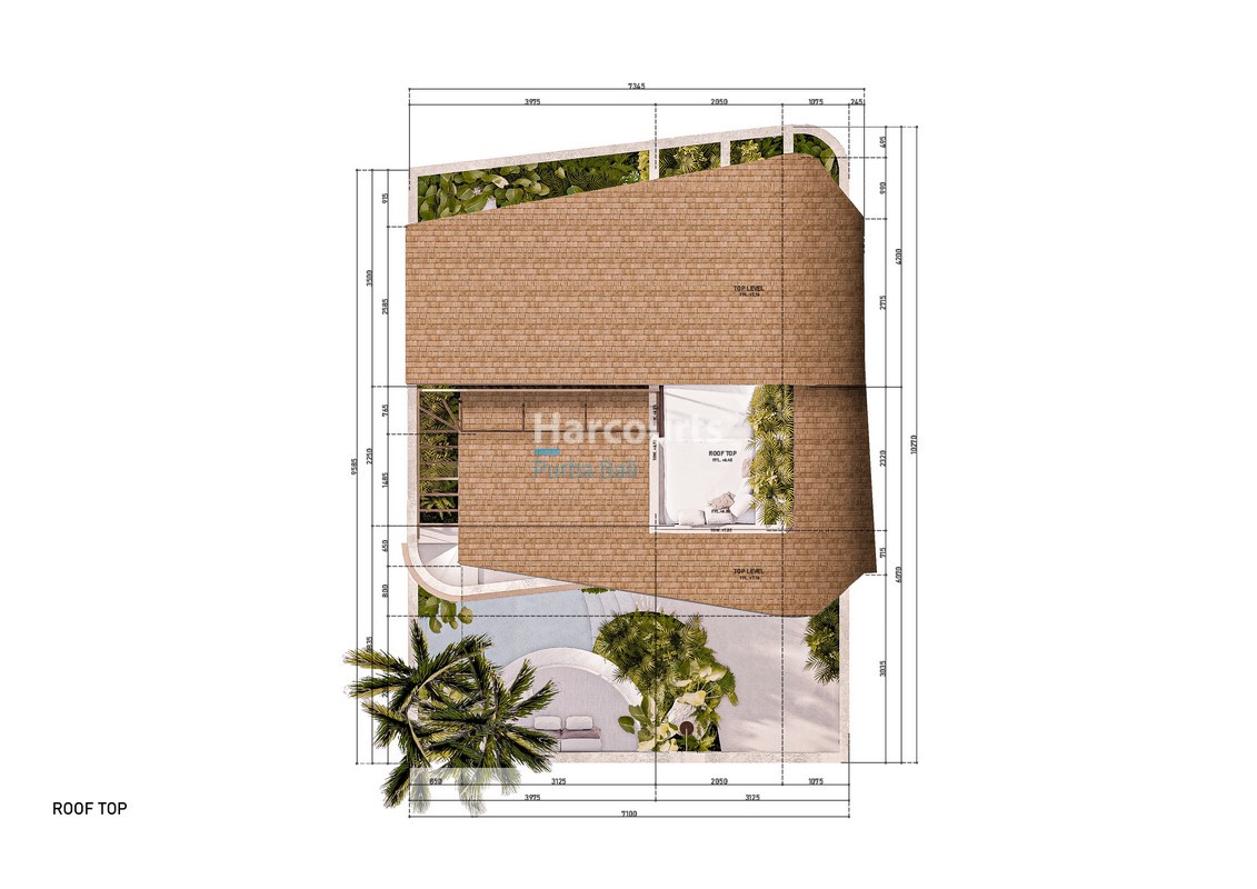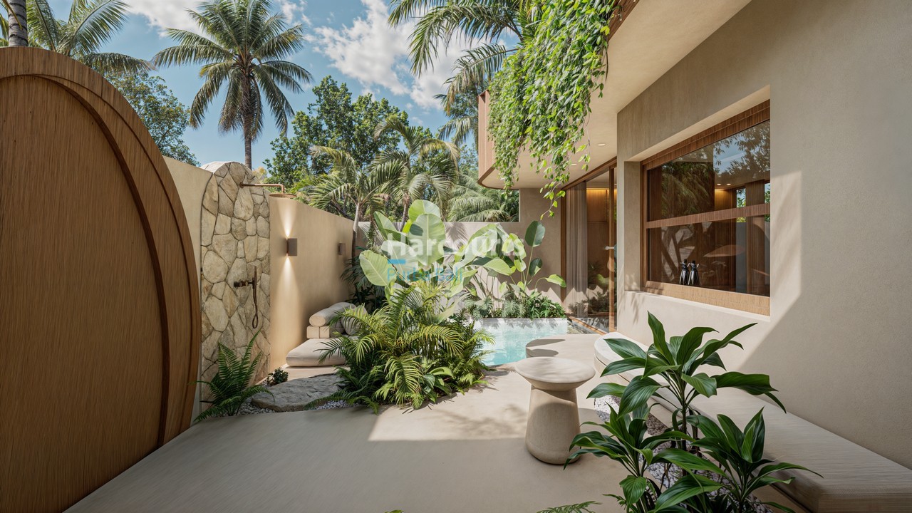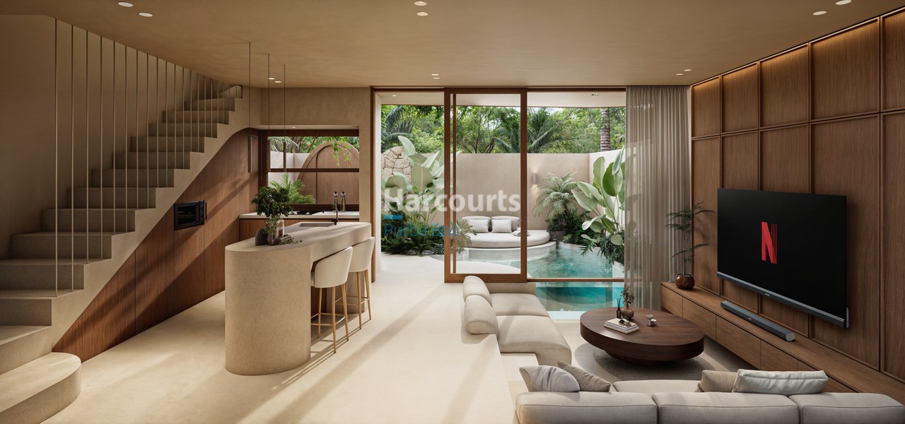 Outdoor living is quietly luxurious on this compact 0.75 are (~75 m²) plot. A private swimming pool with an integrated sunbed sits at the centre, accompanied by an 8 m² deck and an outdoor stone shower. Mature tropical planting, a curved wooden feature wall and stone perimeter create a secluded atmosphere, while a rooftop terrace delivers captivating ocean views. The property is fully enclosed and includes private parking.