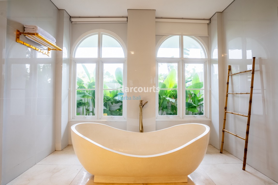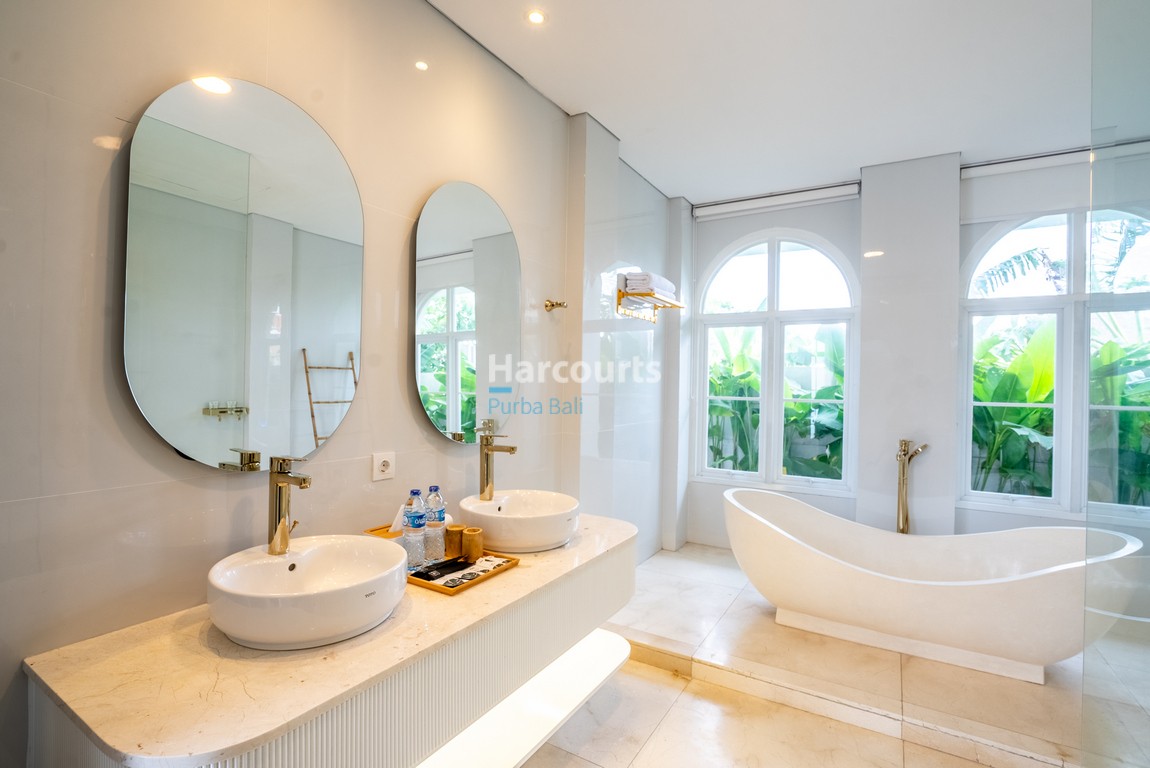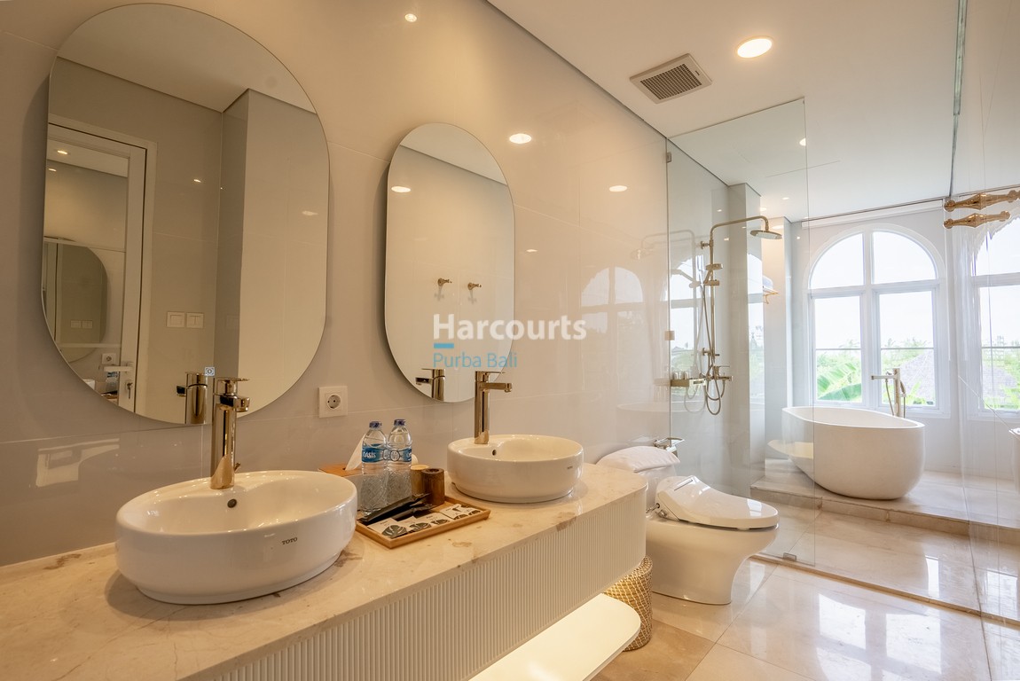Set across 330 sqm of land with a substantial 435 sqm of built space, the villa spans two levels and features four well-appointed bedrooms, each with its own ensuite bathroom. Thoughtfully designed, the bathrooms include rain showers, stone sinks, and a luxurious bathtub in the master suite. The flowing layout centres around a light-filled living and dining area with high ceilings, while a fully equipped Western kitchen and additional guest powder room add further practicality to the home.