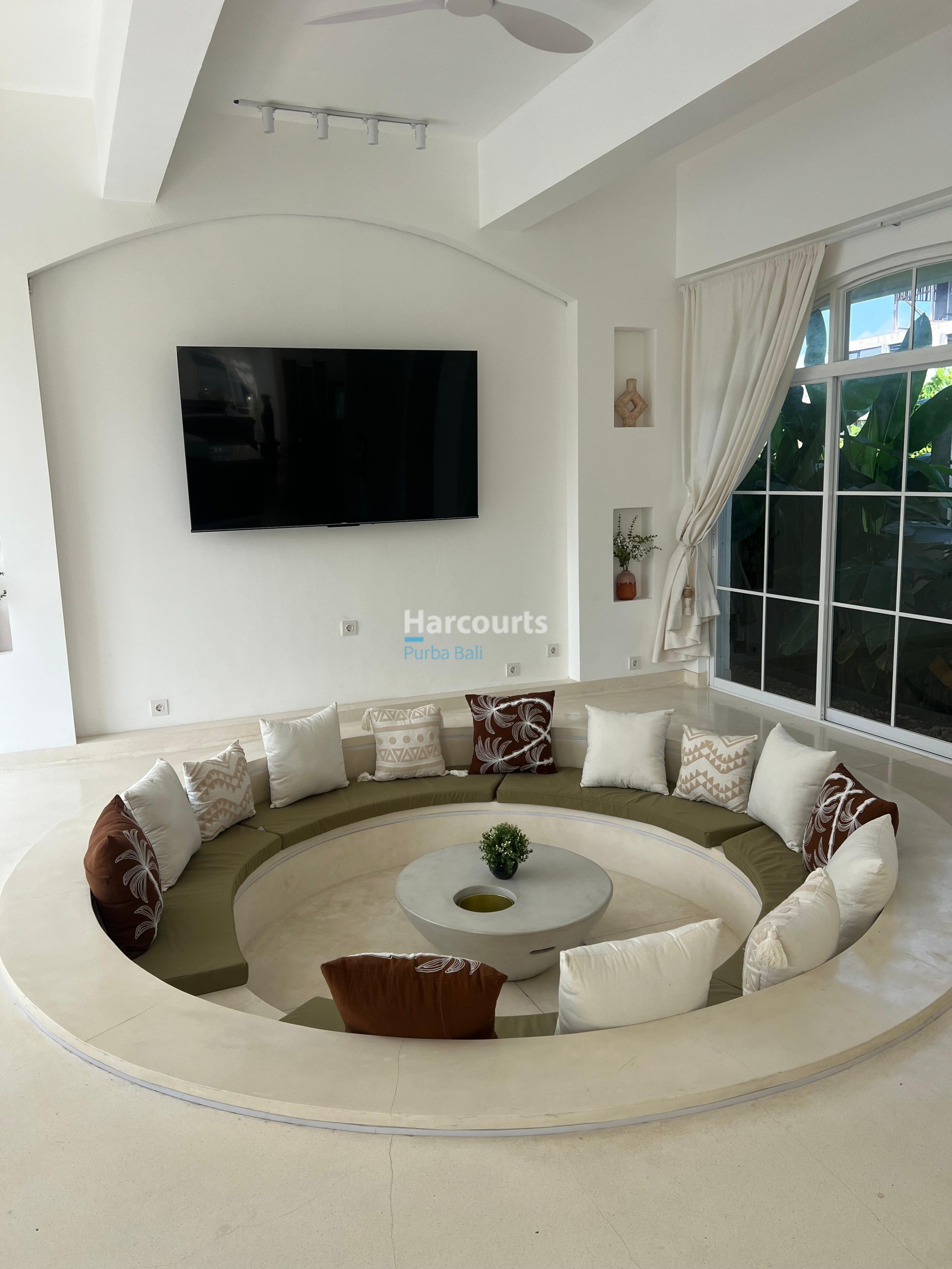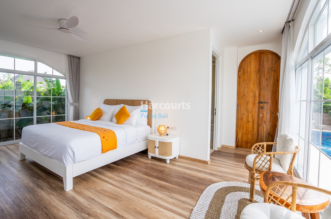 Natural light pours through expansive glass panes and wide arched windows, a signature feature that elevates the villa’s contemporary aesthetic and blurs the line between indoor and outdoor living. The private swimming pool is framed by tropical landscaping and easily accessible from both the master bedroom and common areas, perfect for both relaxation and entertaining.