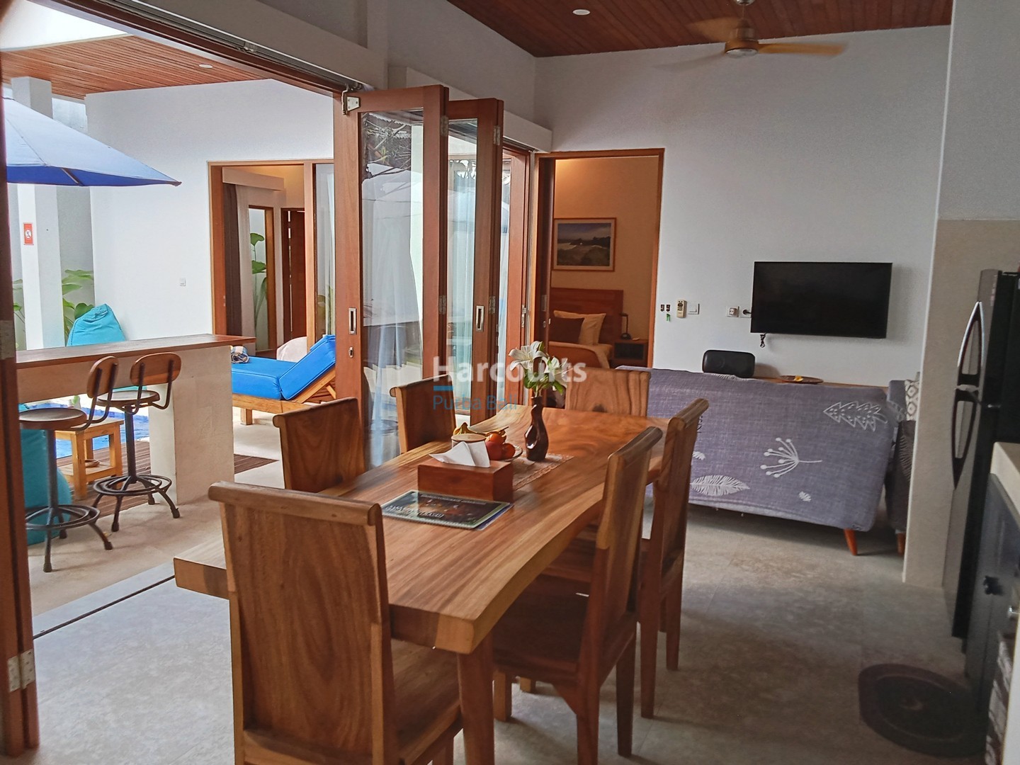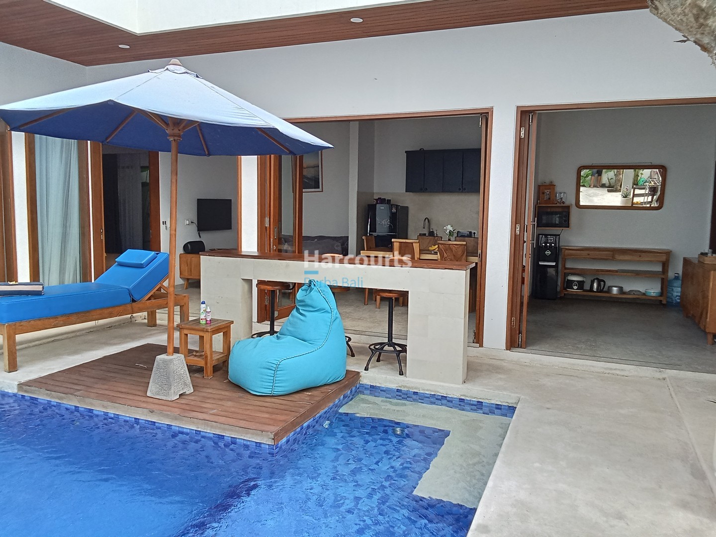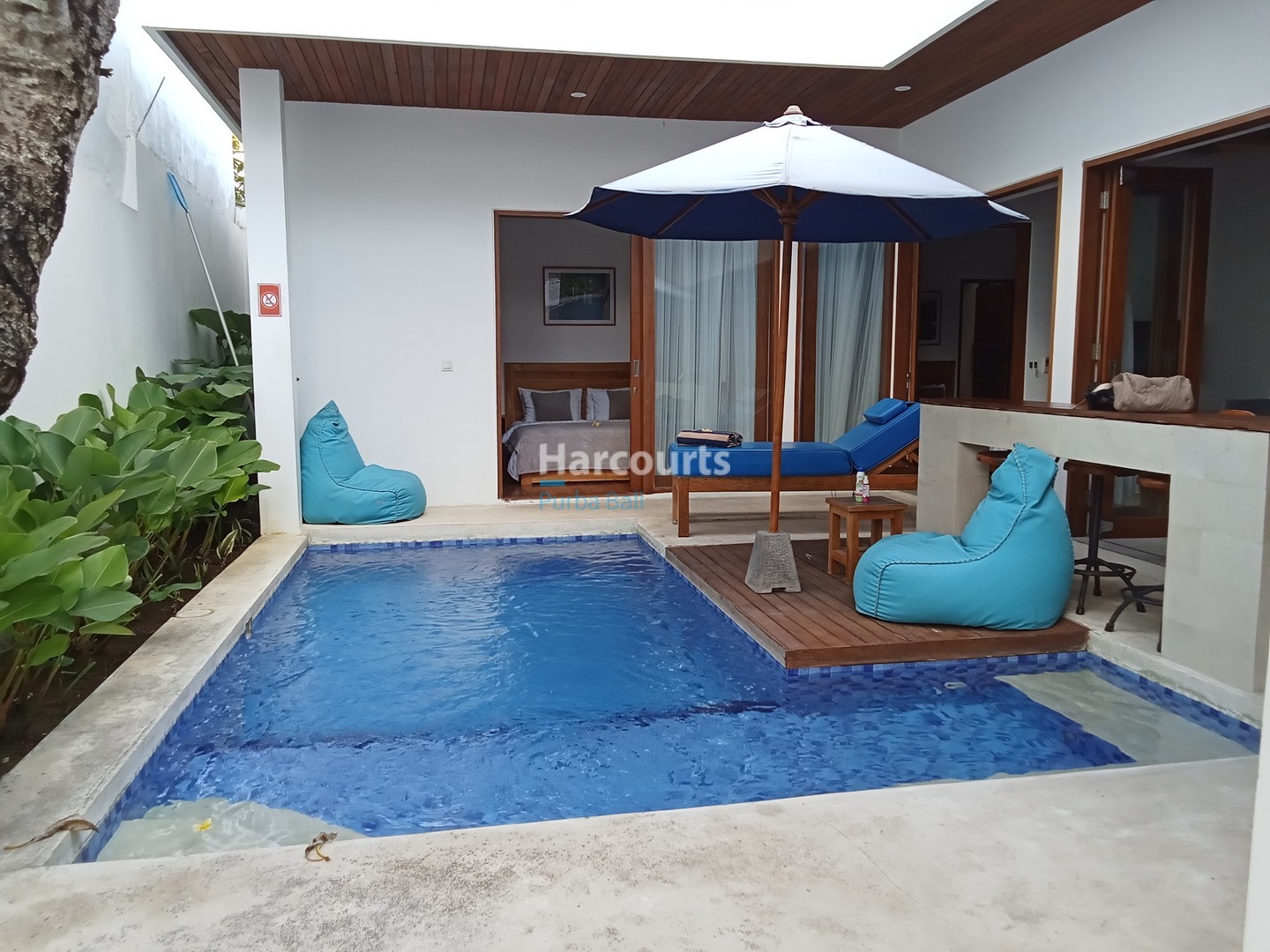 The layout is refreshingly practical. An open-plan living, dining, and kitchen space flows directly to the pool deck, giving the home a relaxed indoor-outdoor feel. The kitchen is fully equipped, and all three bedrooms come with en-suite bathrooms featuring rain showers. Outside, the private 18 sqm swimming pool is flanked by tropical greenery and bright blue loungers—an inviting spot to soak up Berawa’s sun. There’s also enough parking for one car, with direct access from a 4-meter public road.