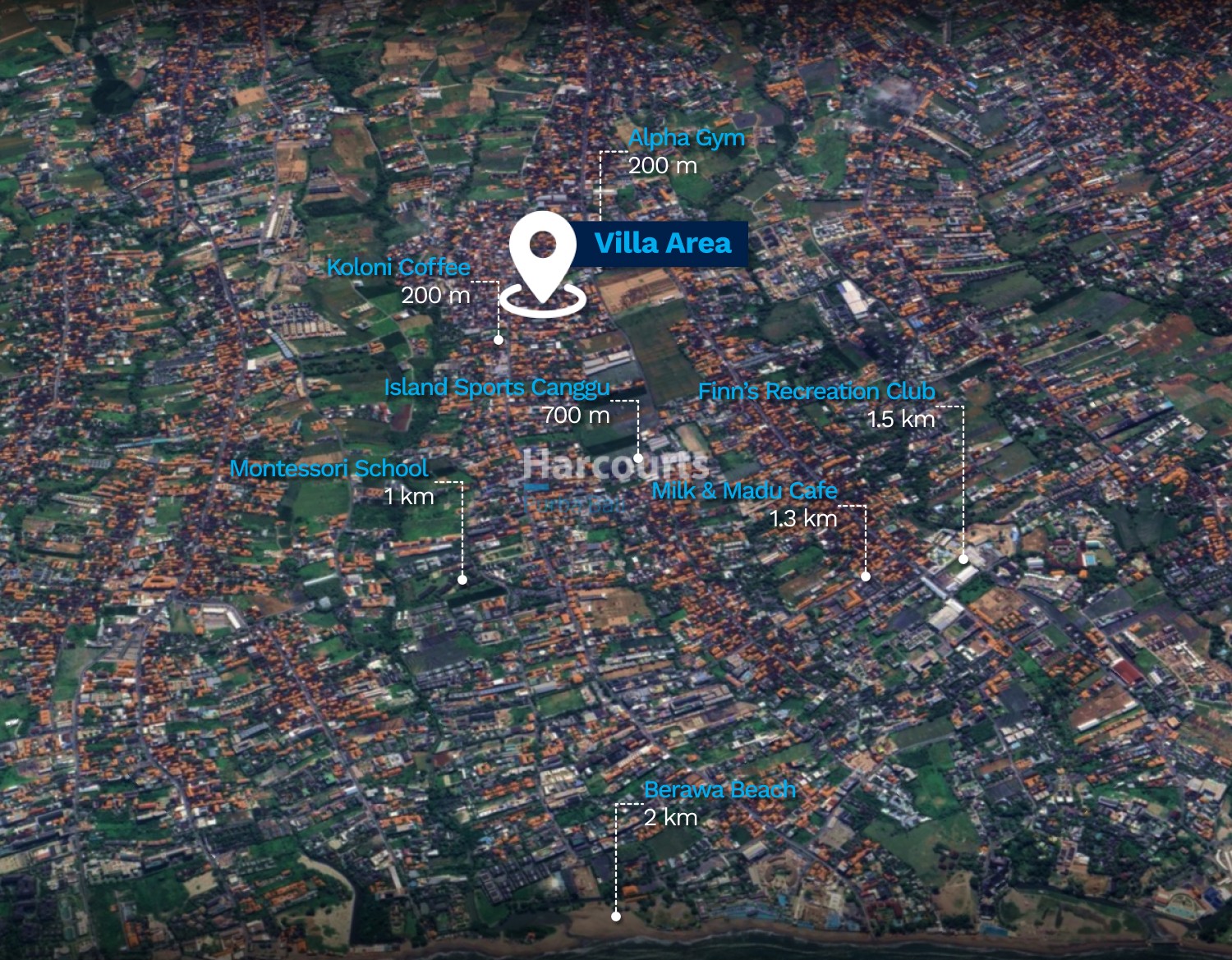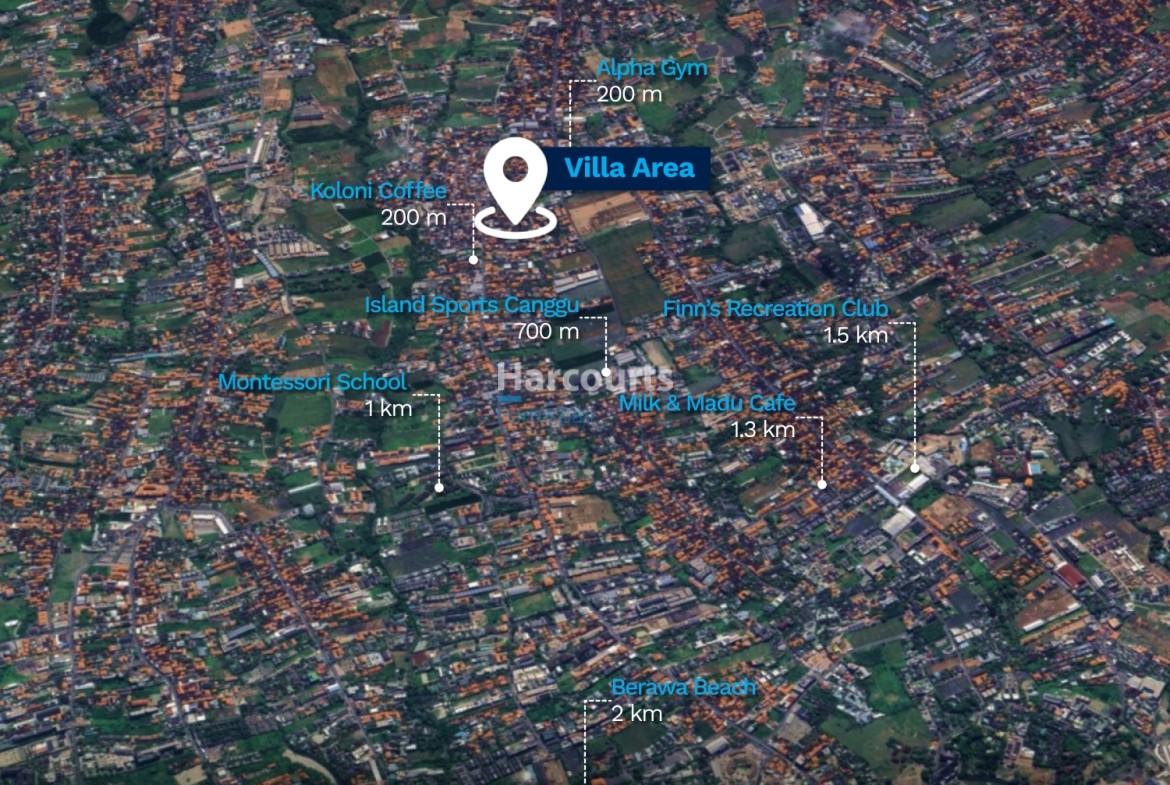 Nearby: Koloni Coffee 200 m, Alpha Gym 200 m, Pepito Market Tibubeneng 400 m, Island Sports Canggu 700 m, Montessori School 1 km, Milk & Madu Cafe 1.3 km, Finn’s Recreation Club 1.5 km, Berawa Beach 2 km
