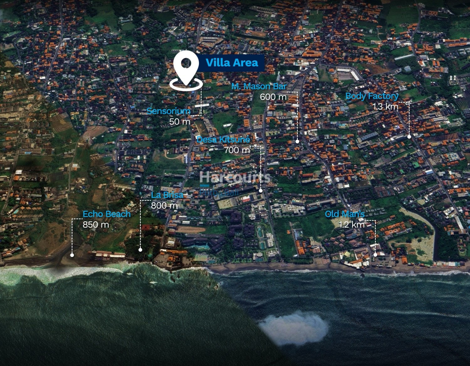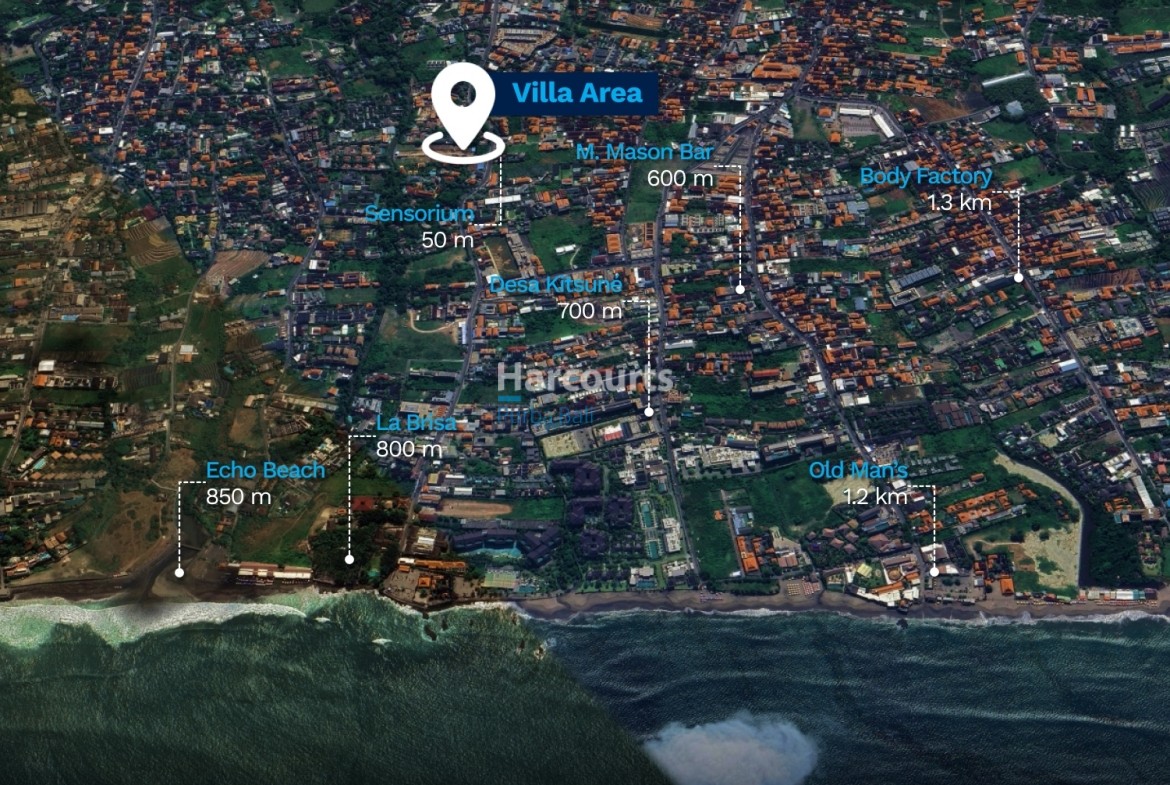 Nearby: Sensorium 50 m, Copenhagen Cafe Canggu 550 m, M. Mason Bar 600 m, Desa Kitsuné 700 m, La Brisa 800 m, Echo Beach 850 m, Old Man’s 1.2 km, Body Factory 1.3 km