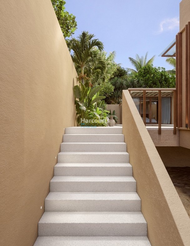 - Mid‑century tropical interiors—custom teak furniture, earth‑tone terrazzo, woven accents—create a warm, natural palette that echoes the surrounding jungle canopy .