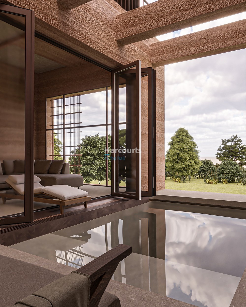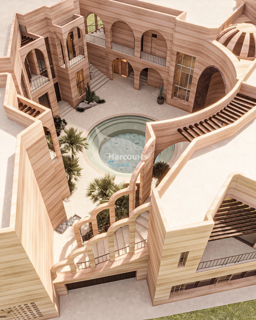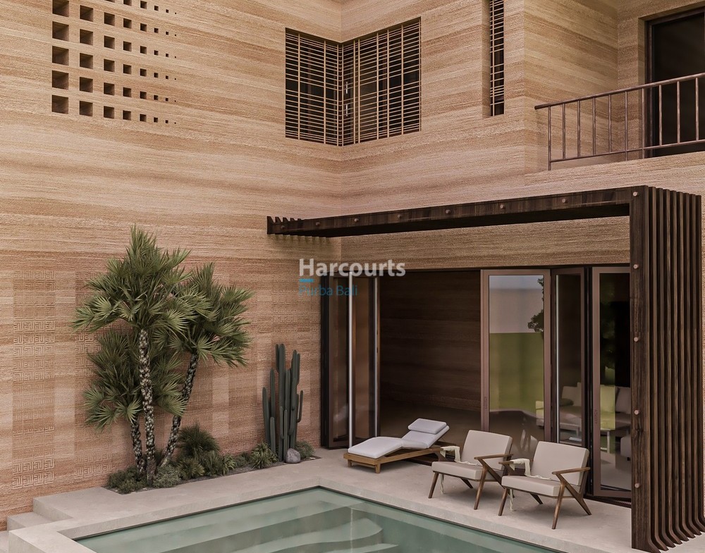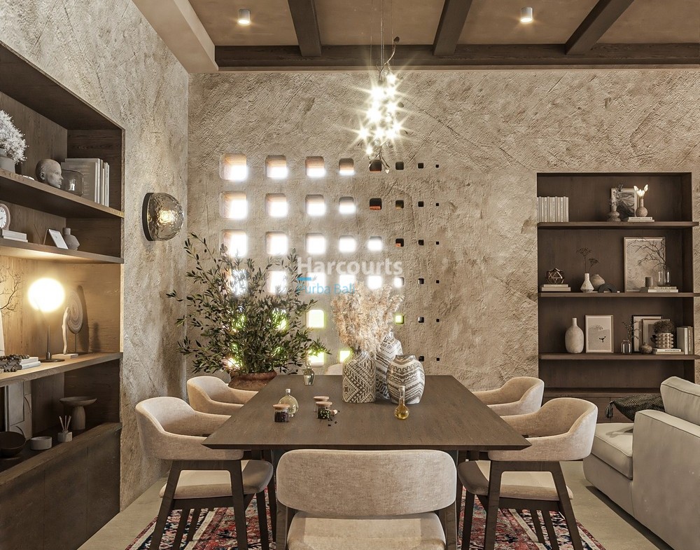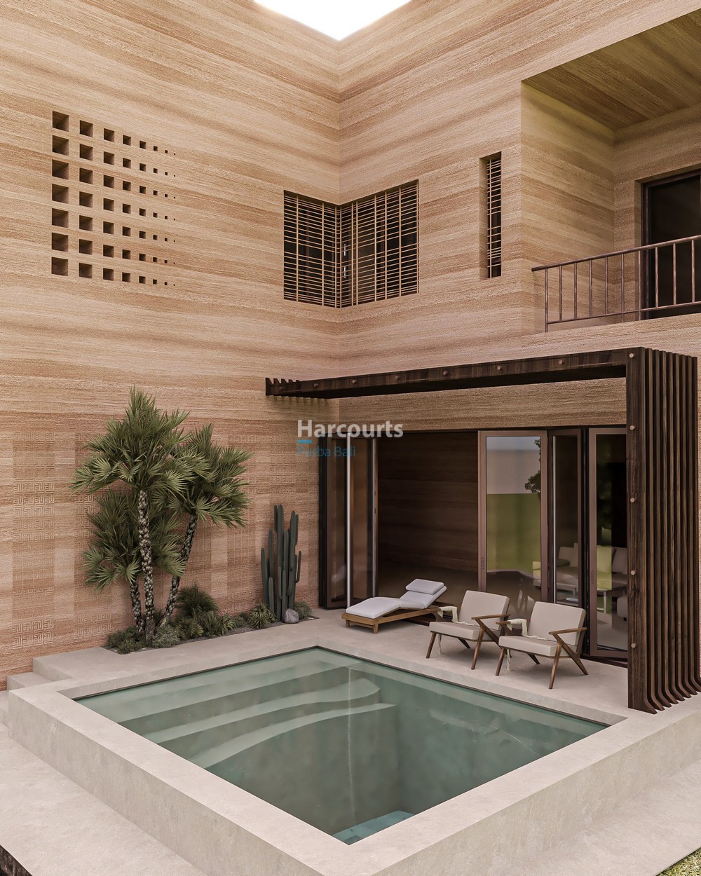 While the complex’s exterior pays homage to the rich, textured style of Jordan’s architectural legacy, each villa takes on a lighter, more contemporary expression. Think floor-to-ceiling glass walls, expansive sliding doors, and clean lines that connect indoor comfort with Bali’s tropical outdoors. Set on 220 sqm of land, the 183 sqm two-storey villa includes three bathrooms, a fully equipped enclosed kitchen, and an open yet private enclosed living and dining space. Fully furnished and finished to high standards, it features modern bathroom amenities including a bathtub and power shower, along with a sleek rectangular private pool—all designed for effortless indoor-outdoor living.
