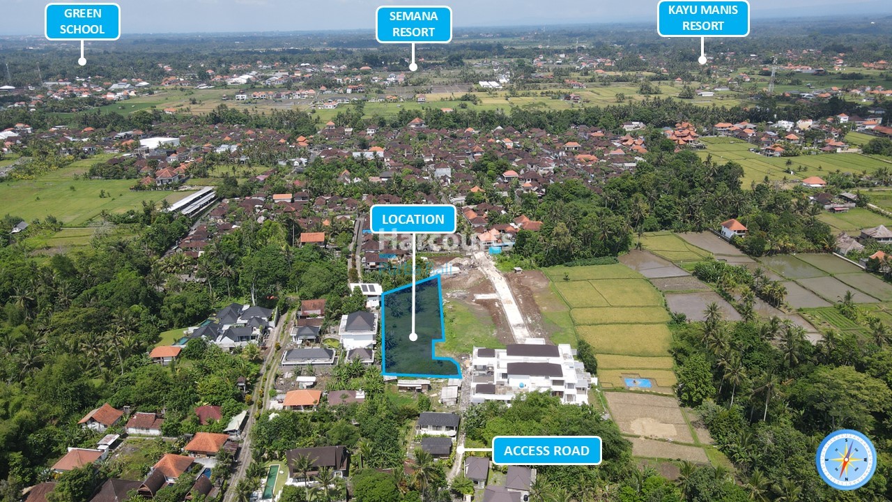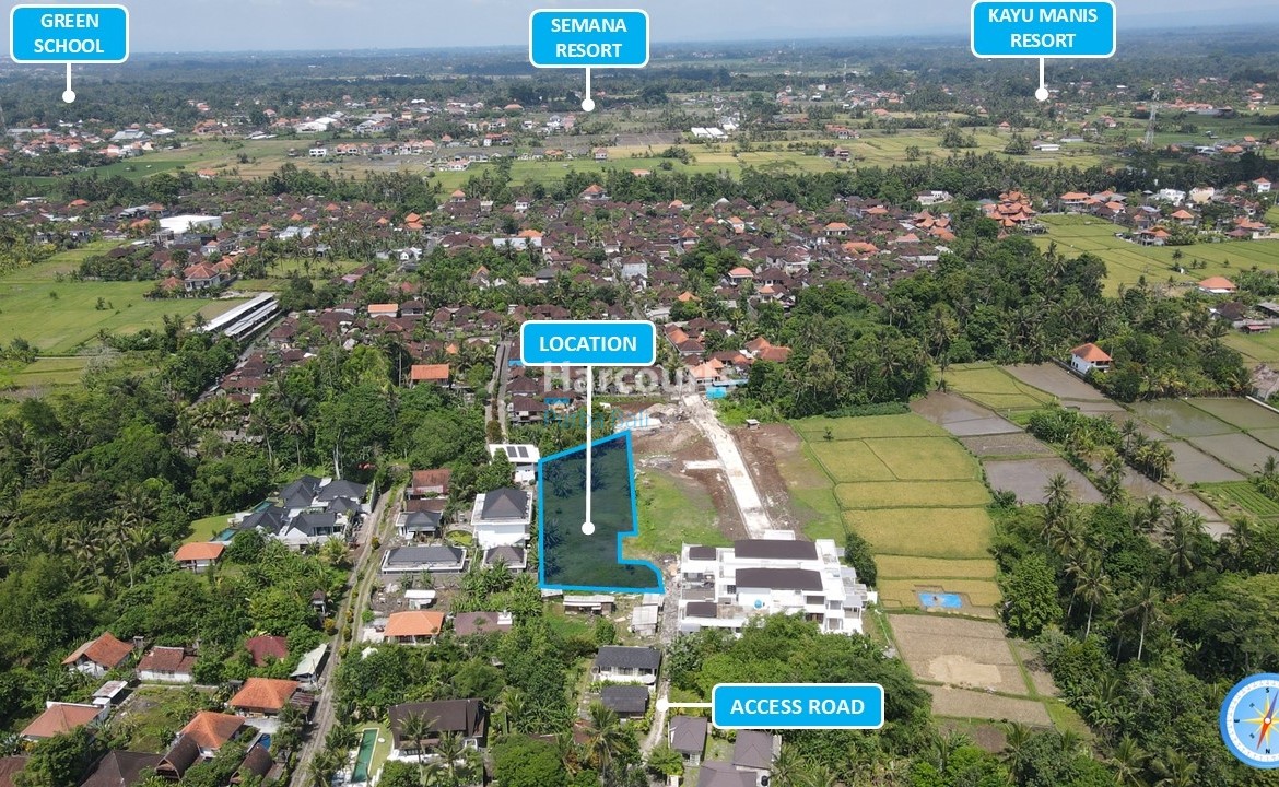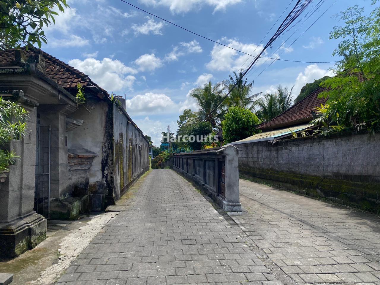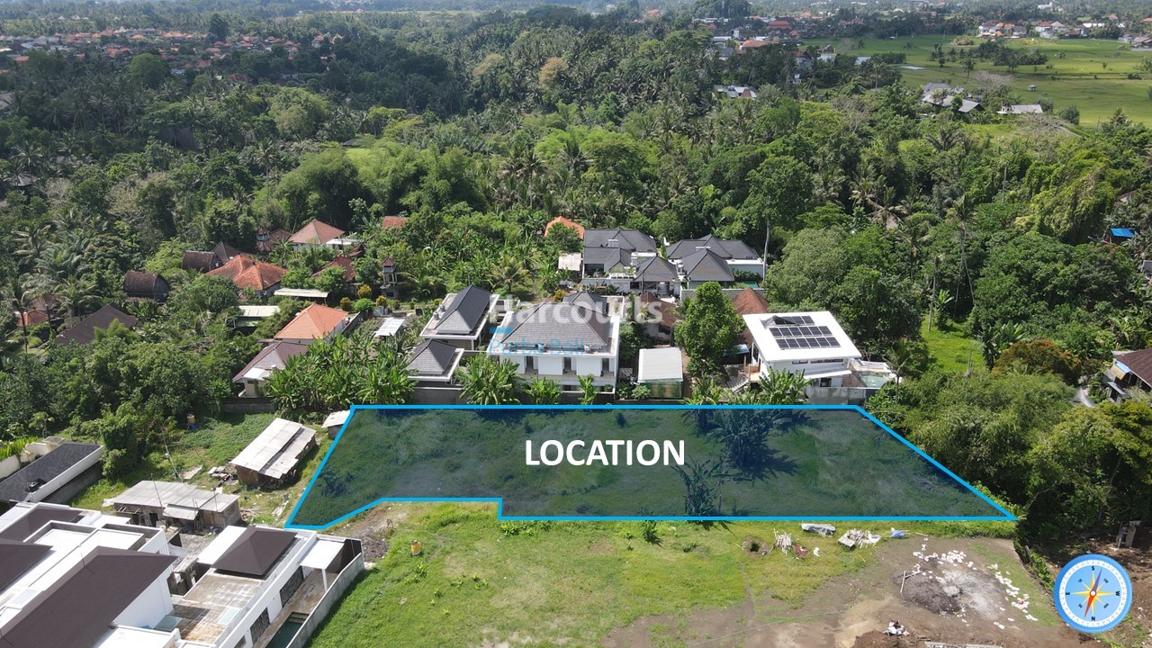 Bordered by rice fields, coconut palms and natural greenery, the site offers a strong sense of privacy and retreat. The parcel is clearly defined, accessed via a nearby paved road and a narrow rural pathway that runs between neighboring homes, reflecting the gentle blend of local village life and natural landscape.