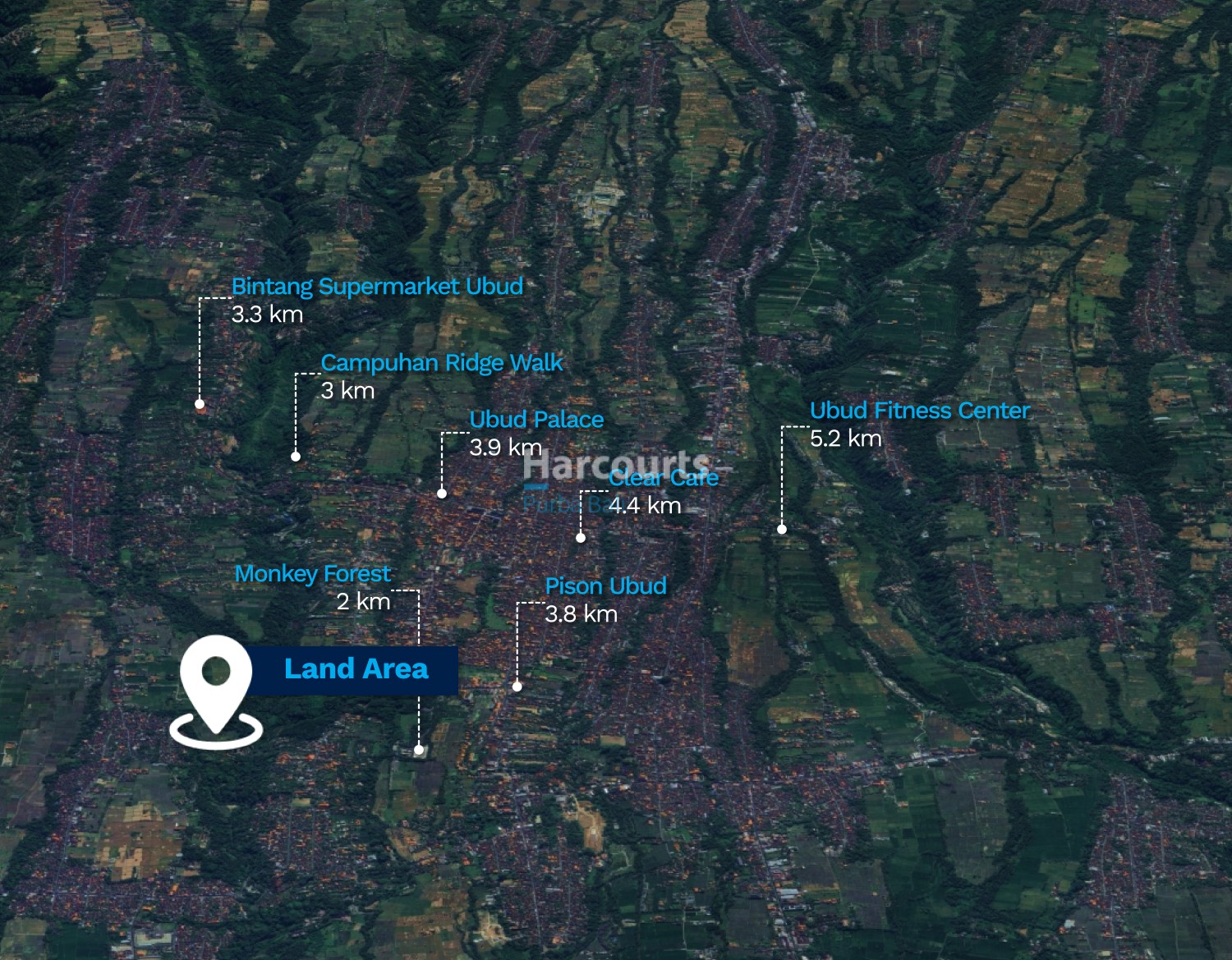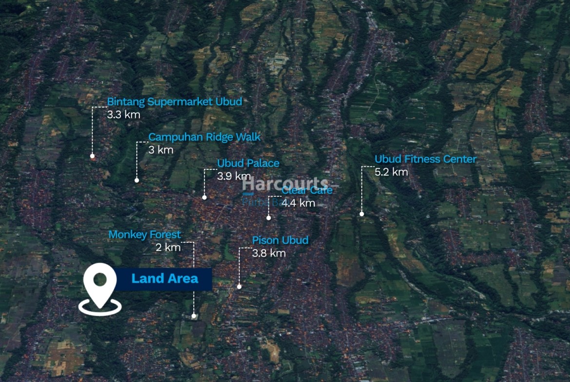 Importantly, the property sits within the Pink Zone (Pariwisata) — zoning that permits commercial hospitality development, including villas, boutique resorts, wellness retreats or short-stay accommodation, aligning well with Ubud’s thriving tourism and yoga-wellness market. Its position places you within easy reach of iconic cultural destinations such as the Campuhan Ridge Walk, Monkey Forest, yoga studios, organic cafés and artisanal galleries, while still enjoying a quiet and serene environment.