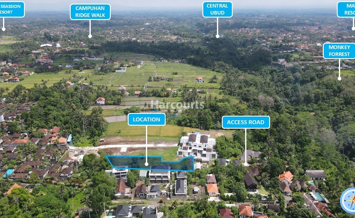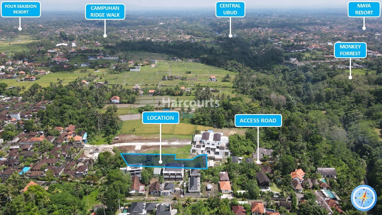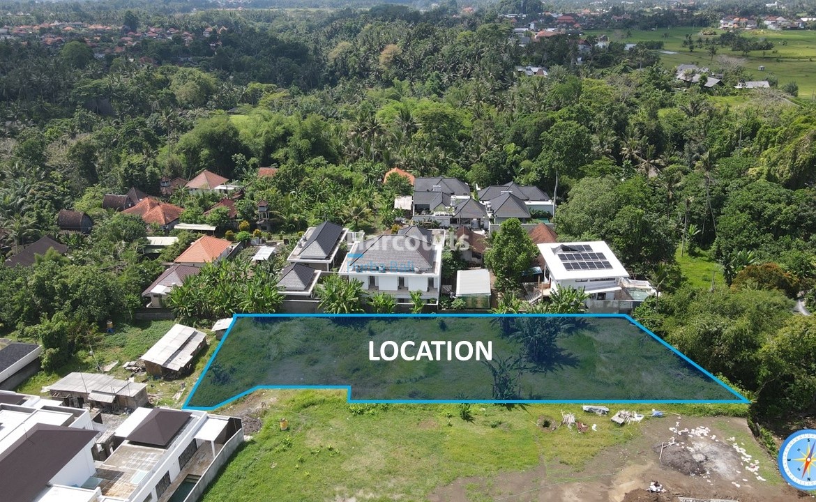 Zoned ‘Pariwisata’, the property aligns with Ubud’s thriving accommodation market and is well placed for projects that benefit from proximity to the town’s cultural attractions. The aerial imagery shows the parcel amid a patchwork of homes, resorts and rice terraces, with landmarks such as Campuhan Ridge Walk and the Monkey Forest indicated nearby, supporting a lifestyle that balances tranquility with easy access to yoga studios, organic cafes, galleries and cultural venues. The land is offered at Rp 3,240,000,000.