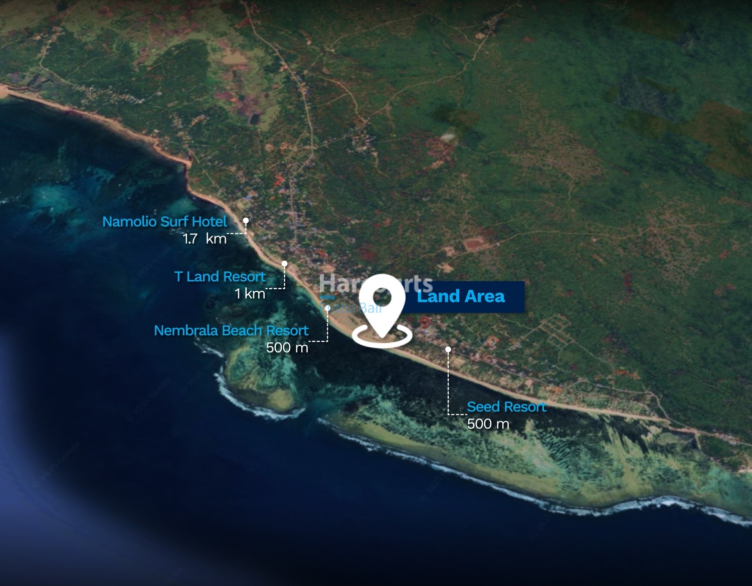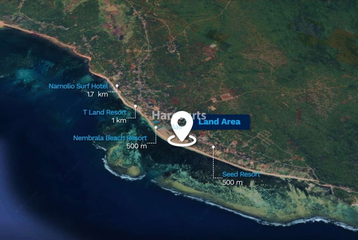 Acquire one of the last remaining beachfront lands available overlooking T-Land – the world class and epic, long left-hand surf break. Measuring 9550 sqm, the property is offered on a LEASEHOLD of 20 years (until Dec 2045) with the opportunity to extend the lease. This square-shaped large beachfront property with dimensions approximately 100m x 100m has views of the T-Land surf and has its own private 5 metre access road. Public water supply and electricity can be easily connected within 120 metres.