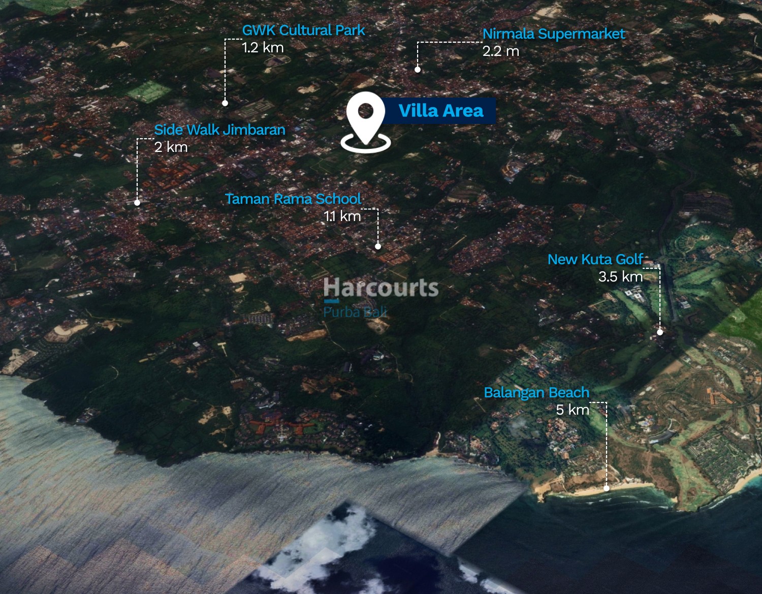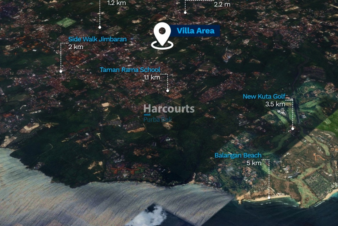 Nearby: Taman Rama School 1.1 km, GWK Cultural Park 1.2 km, Sidewalk Jimbaran 2 km, Nirmala Supermarket 2.2 km, New Kuta Golf 3.5 km, Jimbaran Bay 4 km, Balangan Beach 5 km.