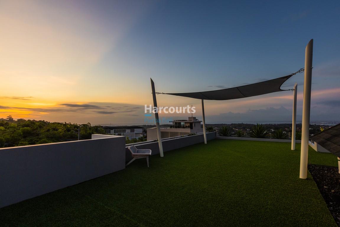 Step outside to beautifully manicured tropical gardens surrounding the solar-heated infinity pool, creating a private sanctuary of calm and sophistication. The outdoor entertainment terrace and sun deck offer the perfect backdrop for sunset cocktails, BBQs, or relaxed family gatherings under Bali’s golden skies. A stunning rooftop lounge provides sweeping 300° ocean and mountain views — an ideal setting to unwind and enjoy Bali’s magical evenings.