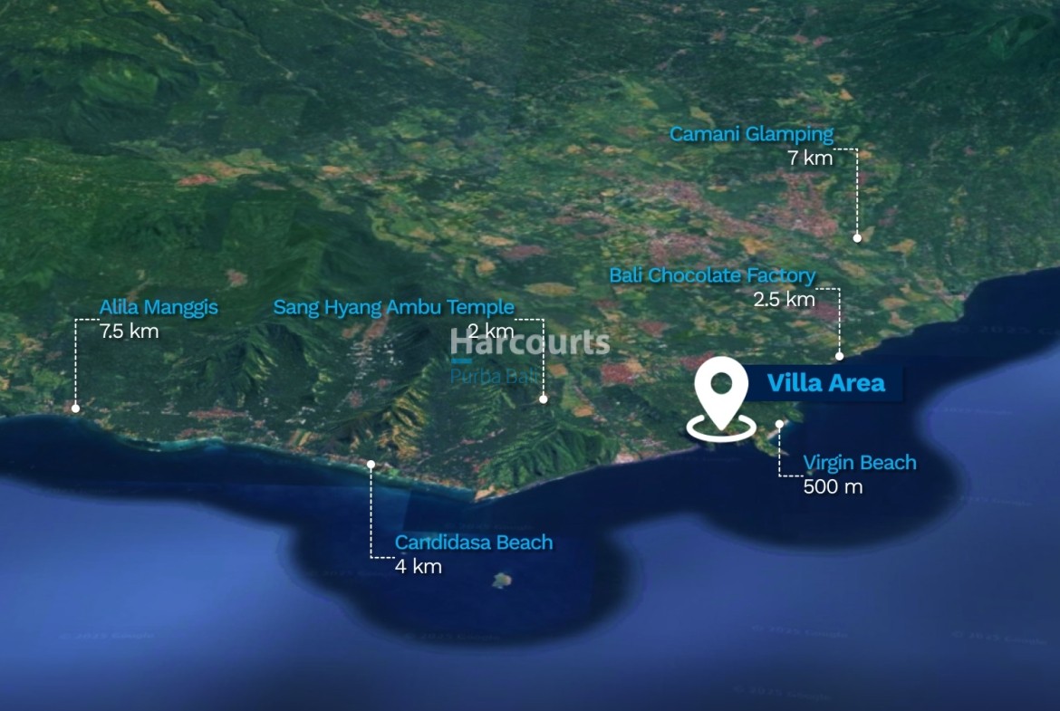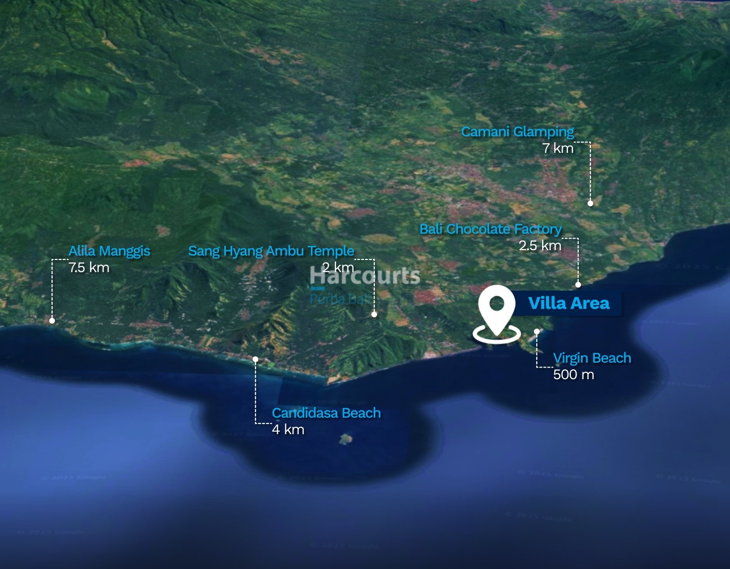 Nearby: Virgin Beach 500 m, Sang Hyang Ambu Temple 2 km, Bali Chocolate Factory 2.5 km, Candidasa Beach 4 km, Camani Glamping 7 km, Alila Manggis 7.5 km