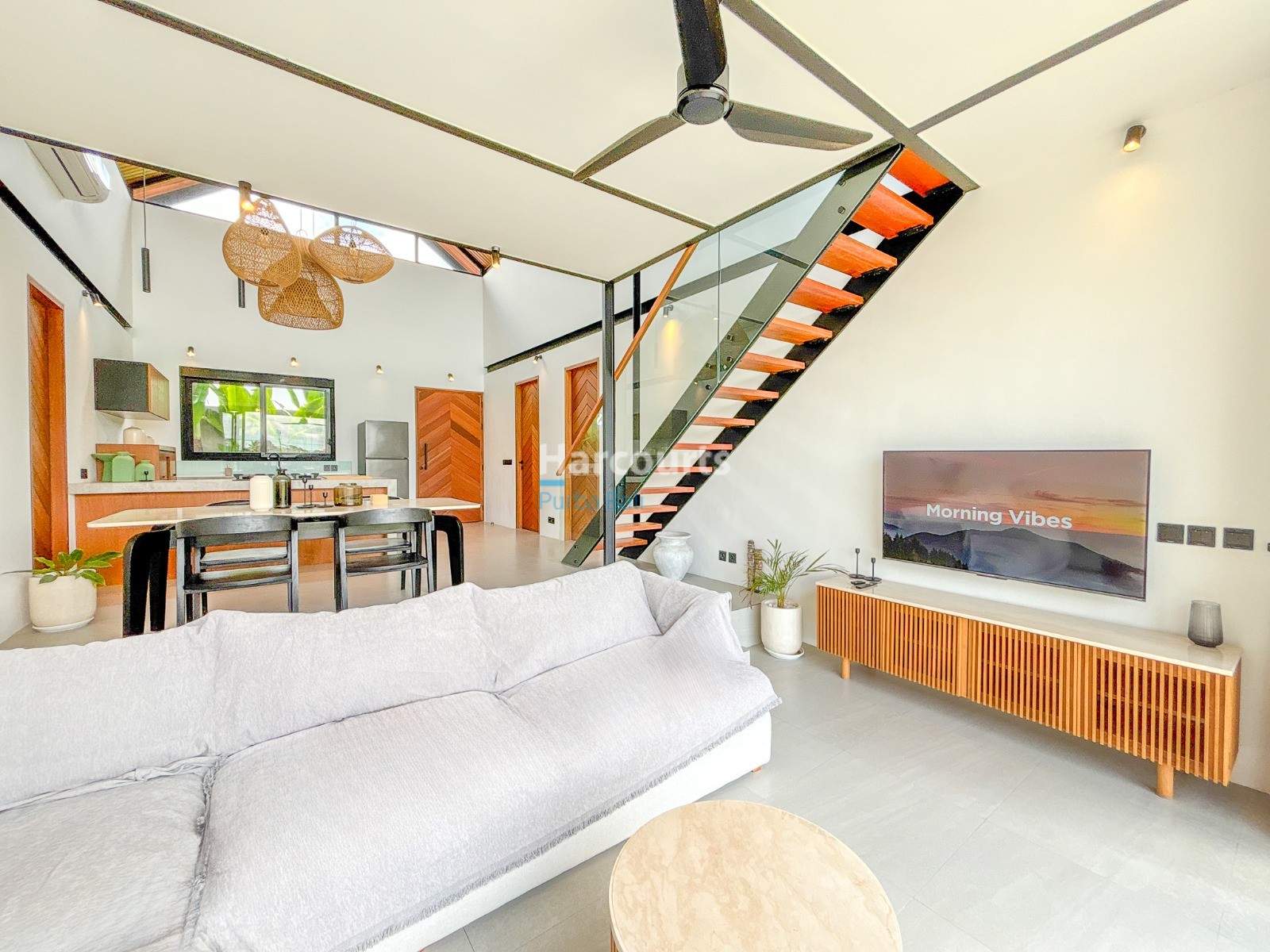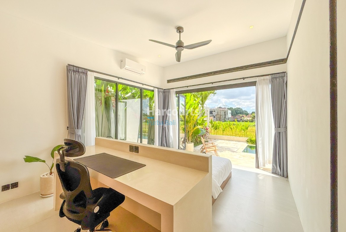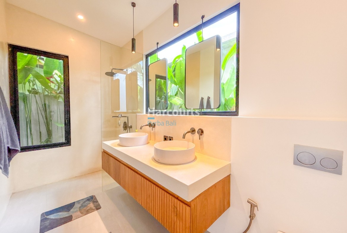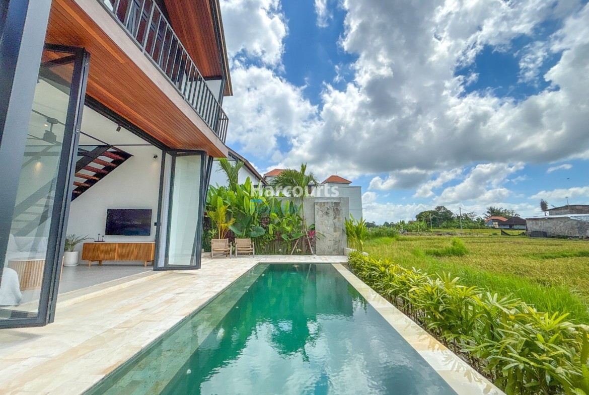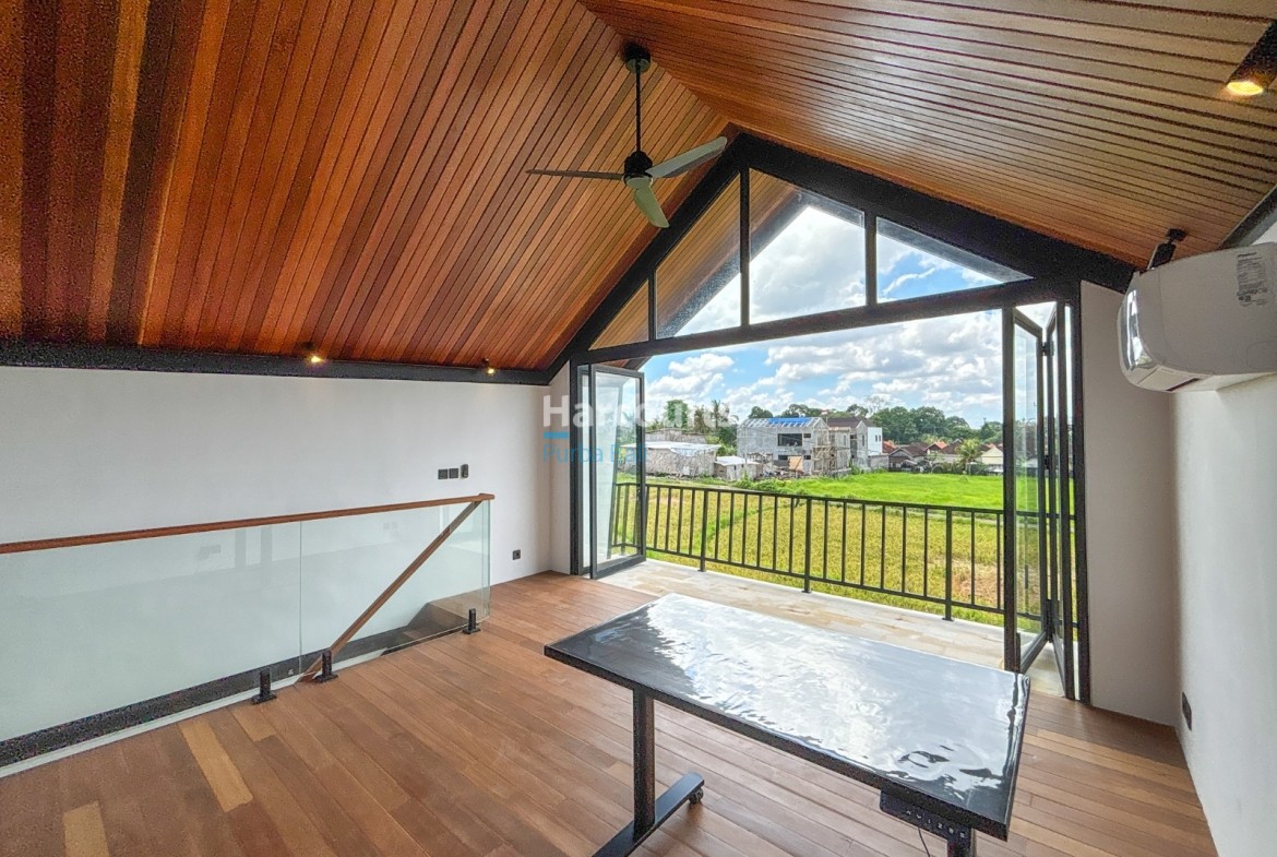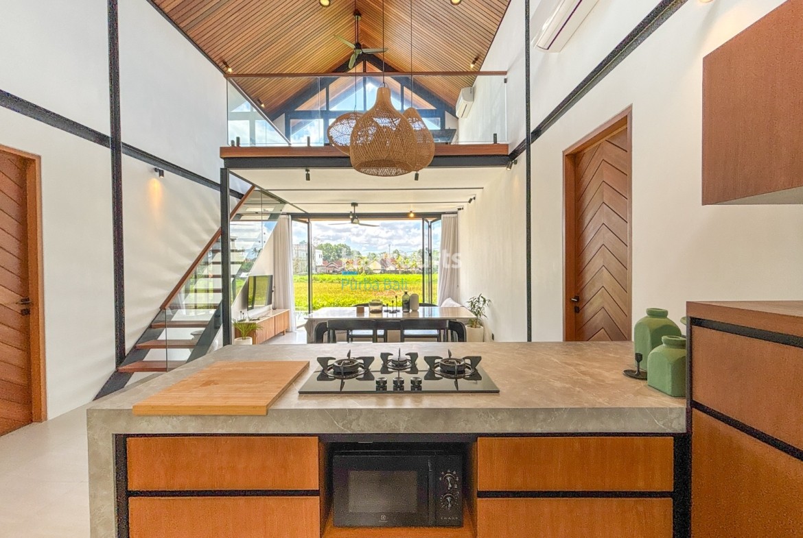 Discover this brand-new villa available for yearly rental in the serene rice fields of Kaba Kaba. Completed in 2025 and offered fully furnished, the 165 m² build houses two bedrooms and two bathrooms with a distinctive mezzanine level that overlooks the open-plan living space—ideal as a home office, media nook or extra guest area—and frames peaceful views across the paddies.