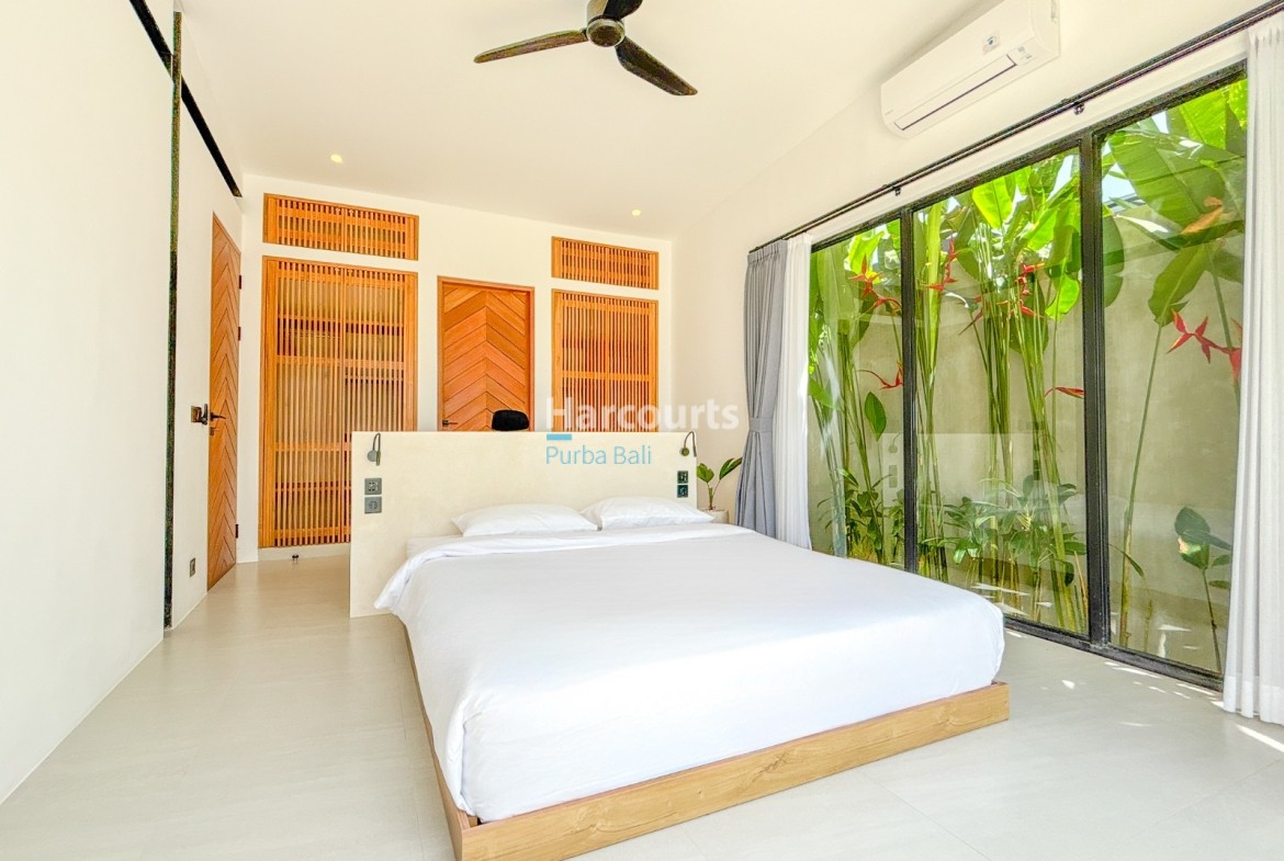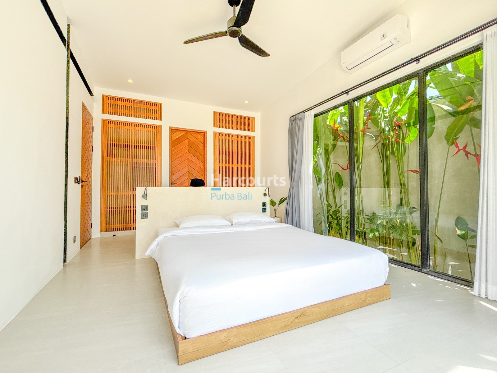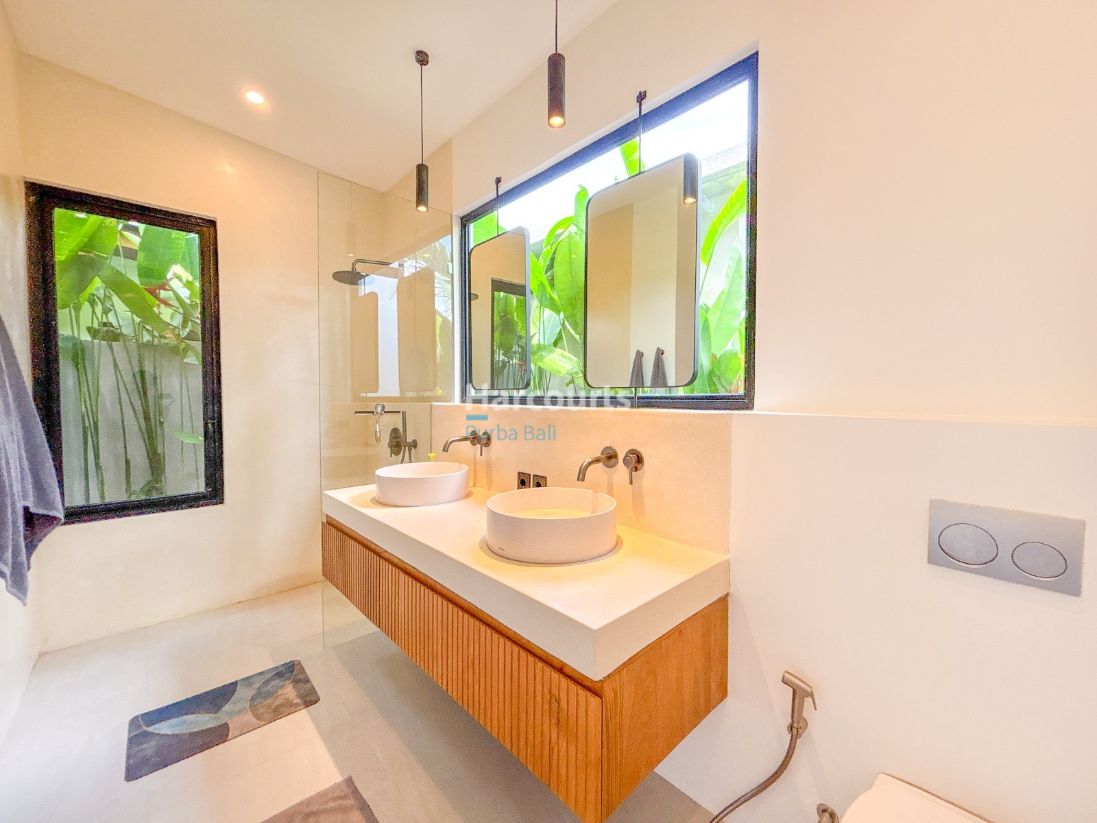 Interiors are bright and contemporary, with large glass doors and windows that draw in natural light, white walls and light-colored flooring that enhance the sense of space, and natural timber finishes on doors and the bed frame. Thoughtful built-in storage keeps the plan uncluttered, while the bathrooms are finished with blue hexagonal tiles, a round white basin on a light countertop and glass-enclosed rain showers for a refined tropical feel. Small touches—potted plants, dried-flower accents and clean-lined furniture—reinforce the turnkey quality.