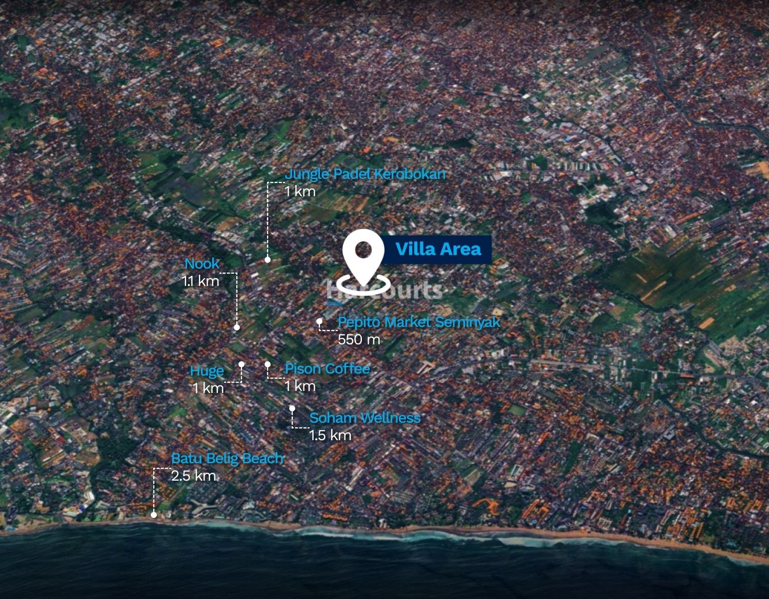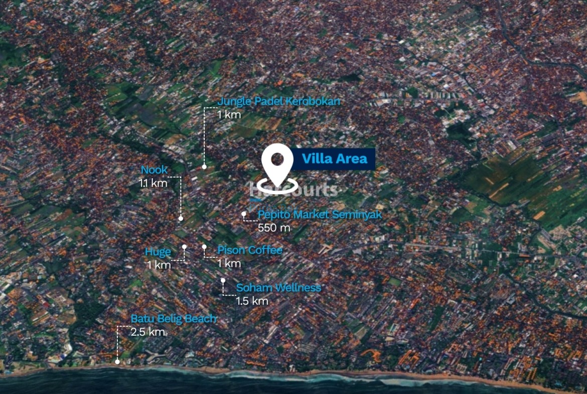 Nearby: Pepito Market Seminyak 550 m, Jungle Padel Kerobokan 1 km, Pison 1 km, Huge 1 km, Nook 1.1 km, Soham Wellness 1.5 km, The Forge 1.5 km, Batu Belig Beach 2.5 km