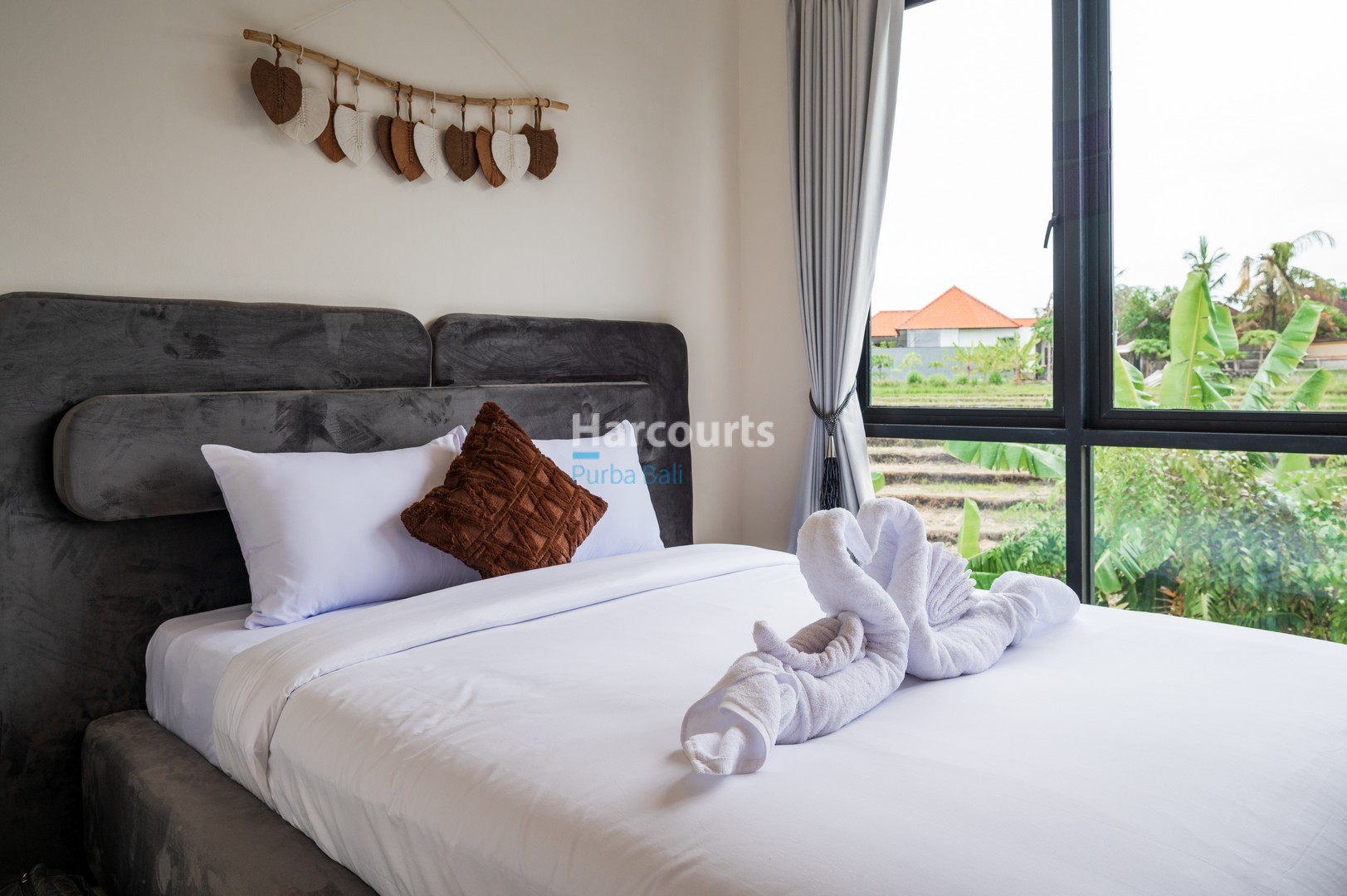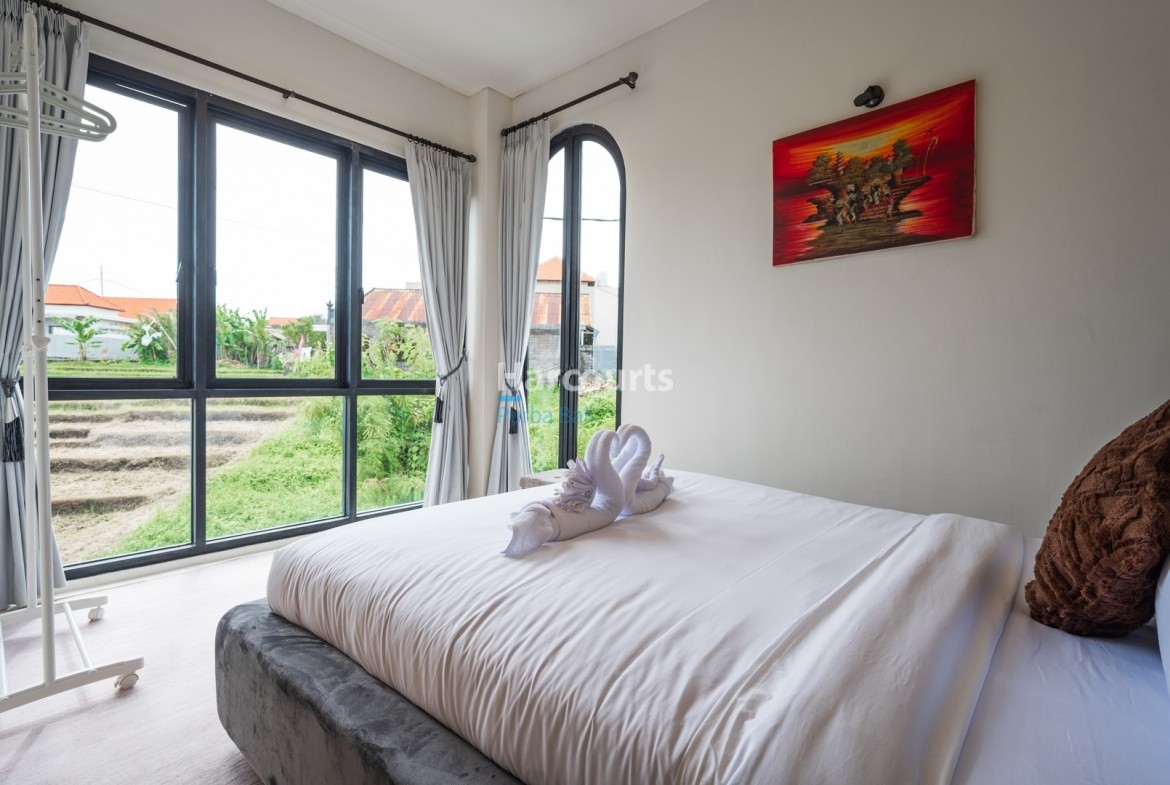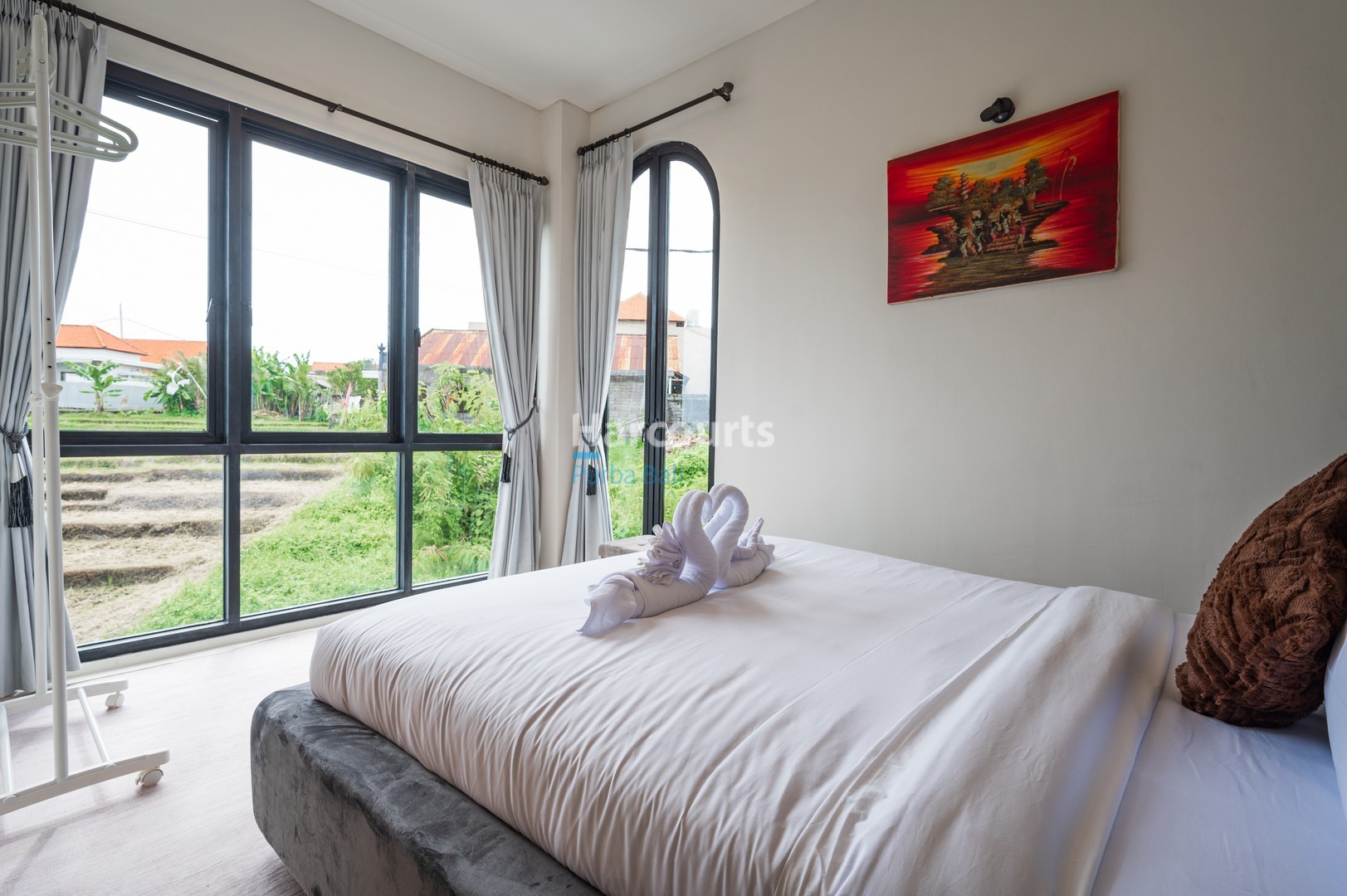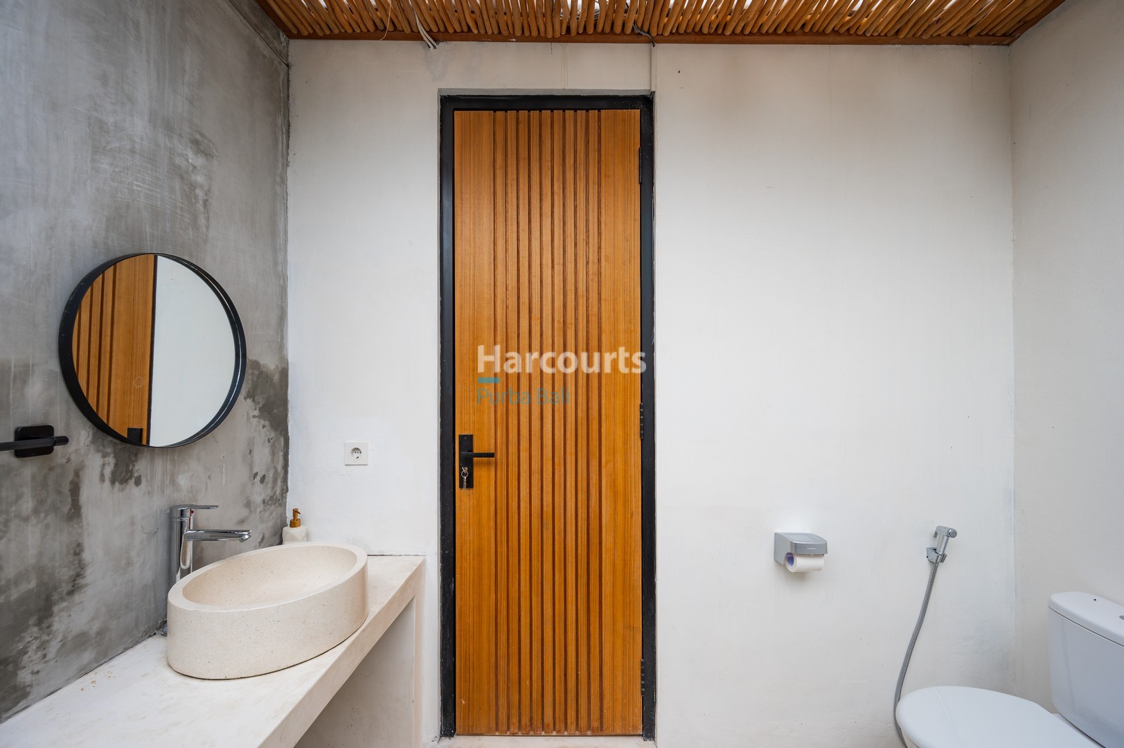 Upstairs, both bedrooms are bathed in natural light, with oversized windows that frame ricefield views—a rare bonus at this price point. The shared bathroom includes a rain shower and single sink, and there’s a convenient guest toilet on the lower level. Every space is designed for comfort, with a layout that feels practical, intimate, and easy to maintain.