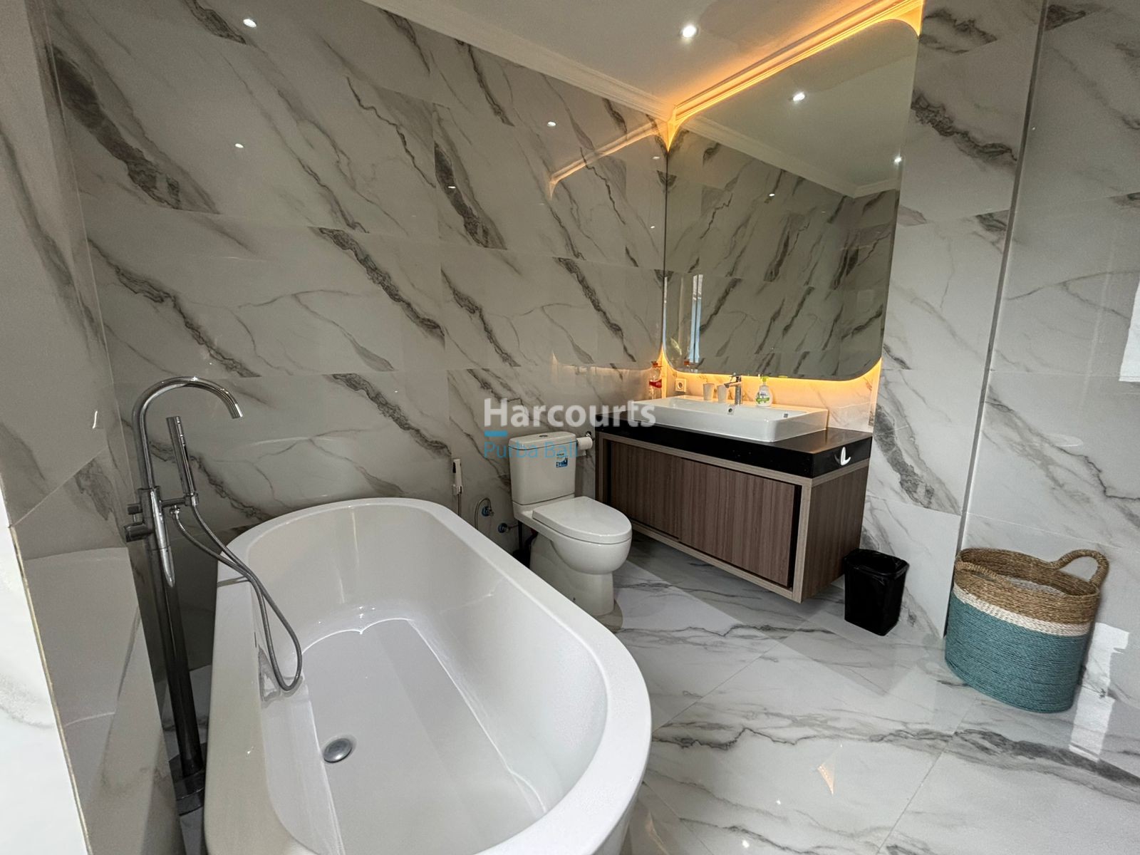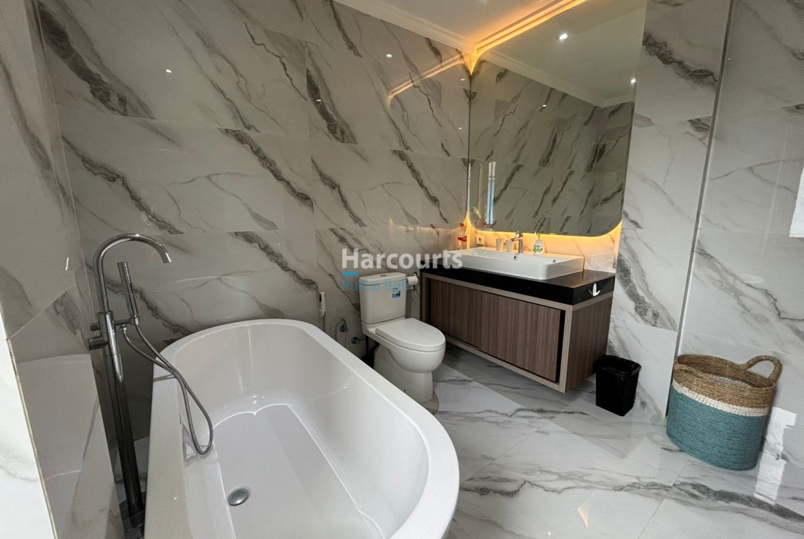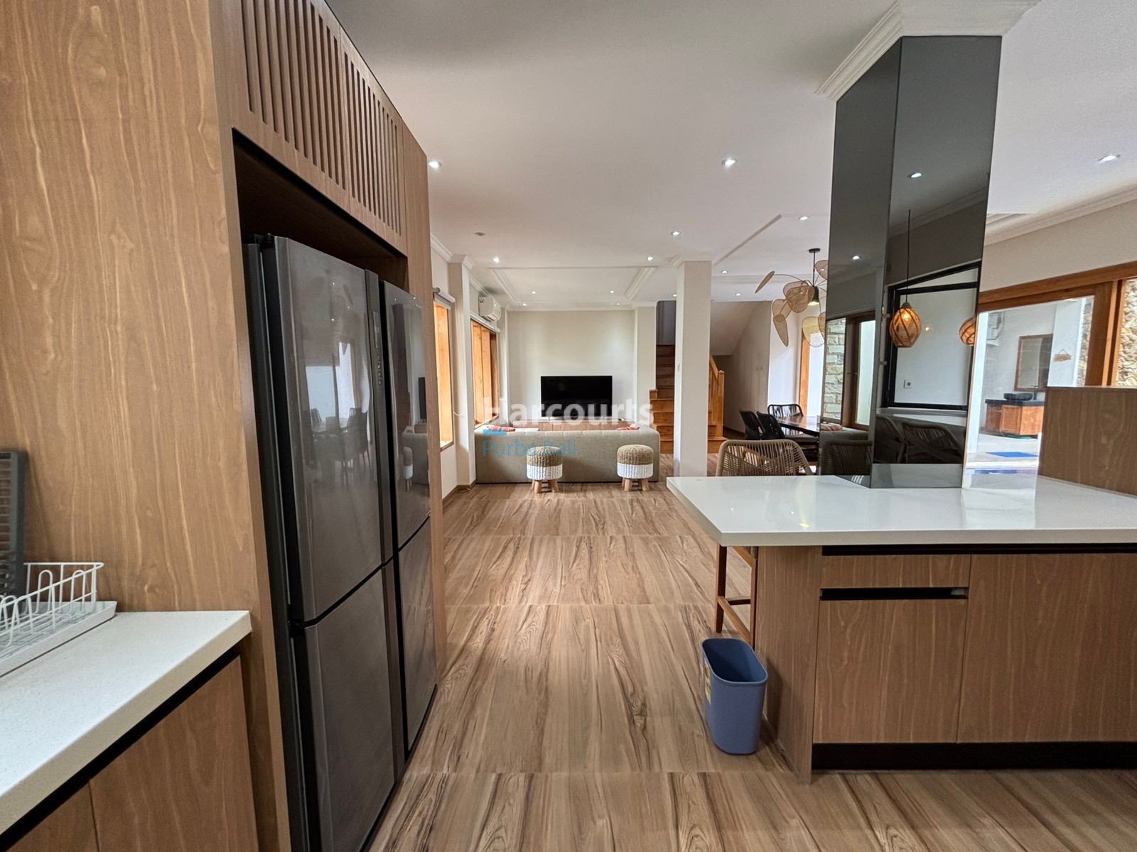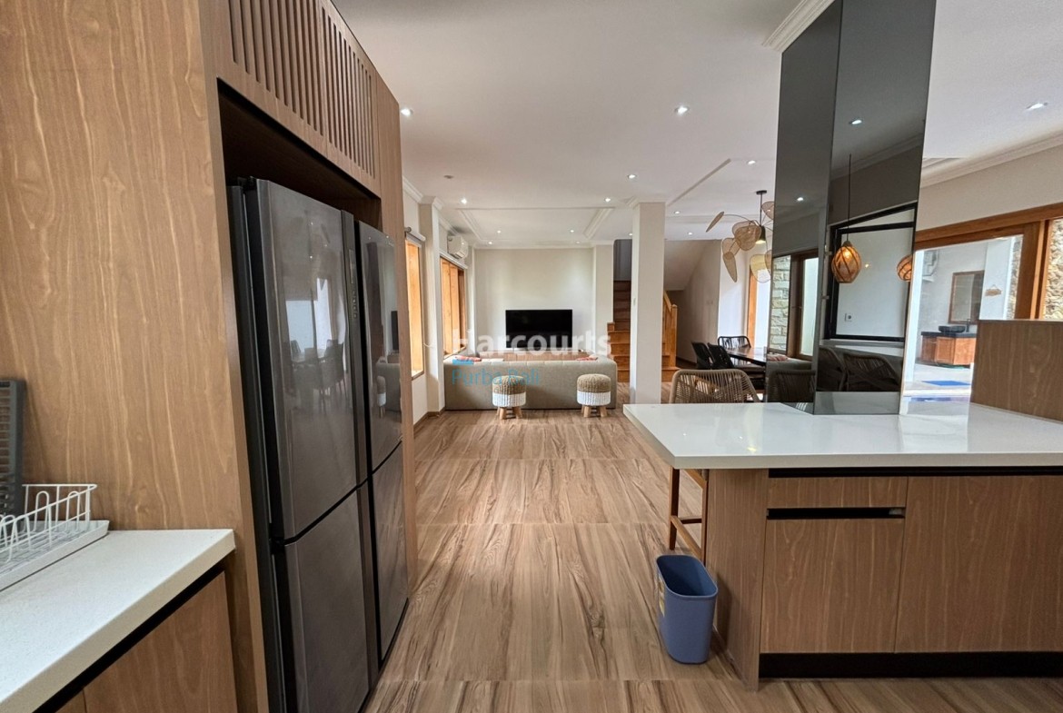 Set on 210 sqm of land with a generous 311 sqm of living space, the villa spans three floors plus a rooftop area, creating a versatile layout ideal for modern living. The fully furnished home features three spacious bedrooms and four bathrooms, including a luxurious master suite with a bathtub and rain shower. The close-plan living and dining areas are tastefully designed, adjoining a fully equipped modern kitchen perfect for entertaining. A private rectangular pool measuring approximately 5 x 2.5 meters adds to the villa’s appeal, while a maid’s room and staff facilities provide extra convenience.