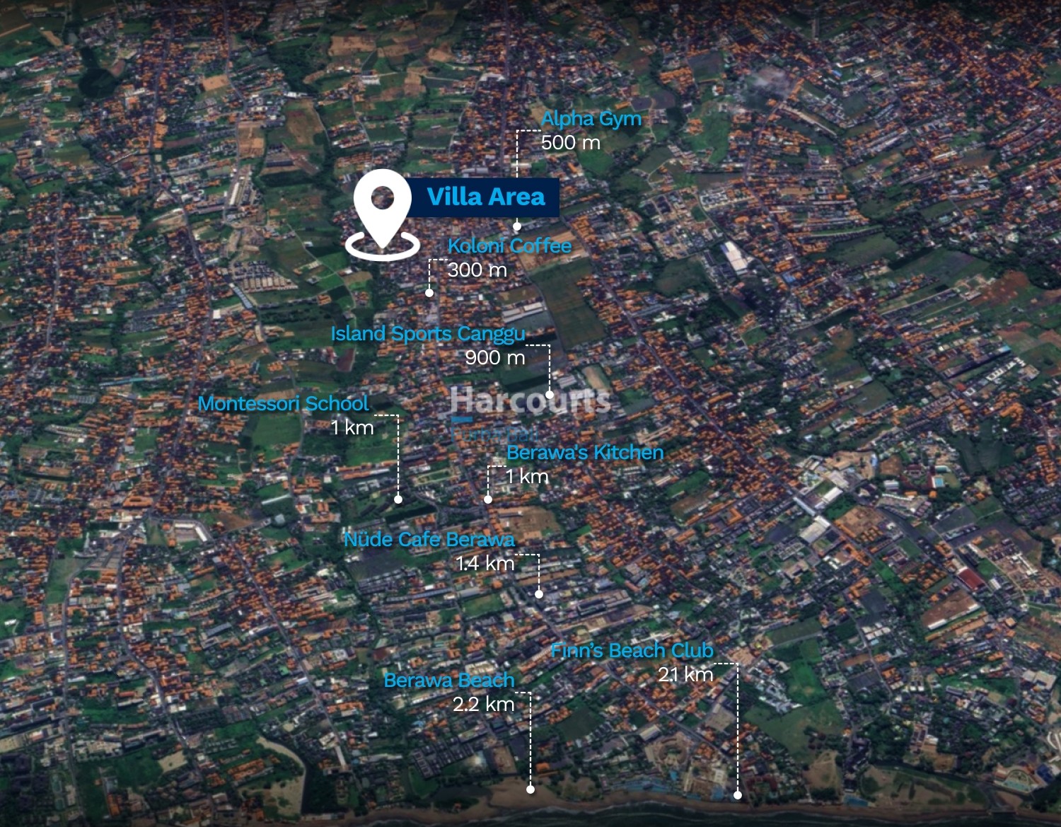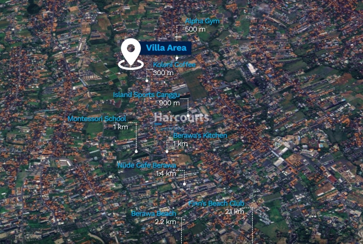 Nearby: Koloni 300 m, Alpha Gym 500 m, Island Sports Canggu 900 m, Montessori School 1 km, Berawa’s Kitchen 1 km, Nüde Cafe Berawa 1.4 km, Finns Beach Club 2.1 km, Berawa Beach 2.2 km