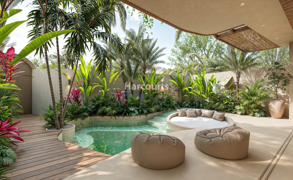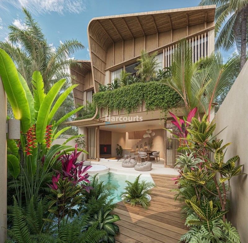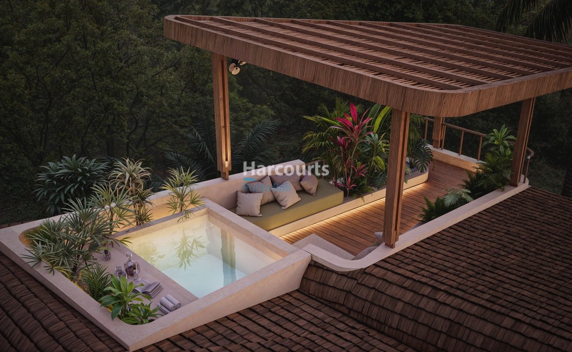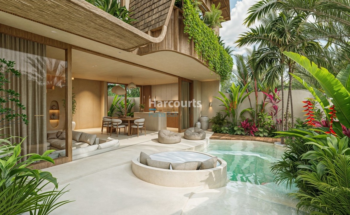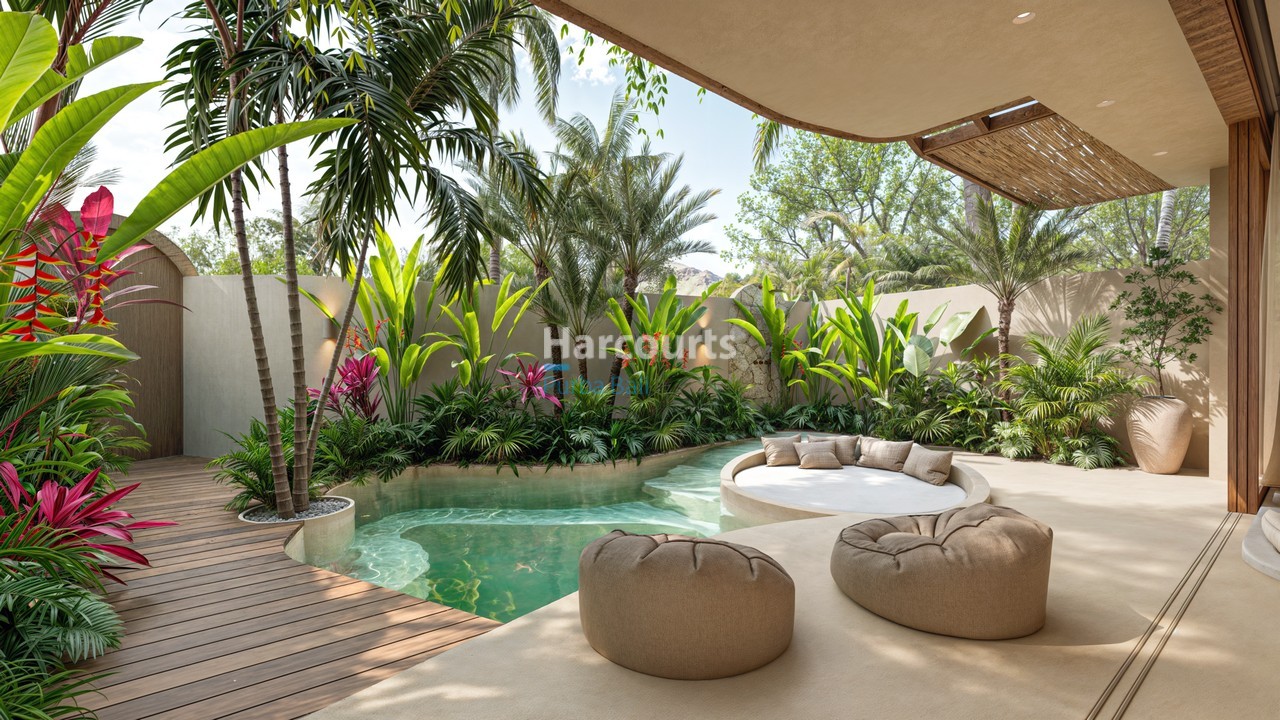 Outside, the villa sits on a 1.05 are (~105 m²) plot where a private garden and small swimming pool with a built-in sunbed are framed by lush tropical planting and a wooden deck. A distinctive outdoor stone shower and multiple circular cushion seating areas create a resort-like atmosphere while fully enclosed grounds and dedicated parking ensure privacy and convenience. The architecture’s curved roofline and natural finishes tie the spaces together.