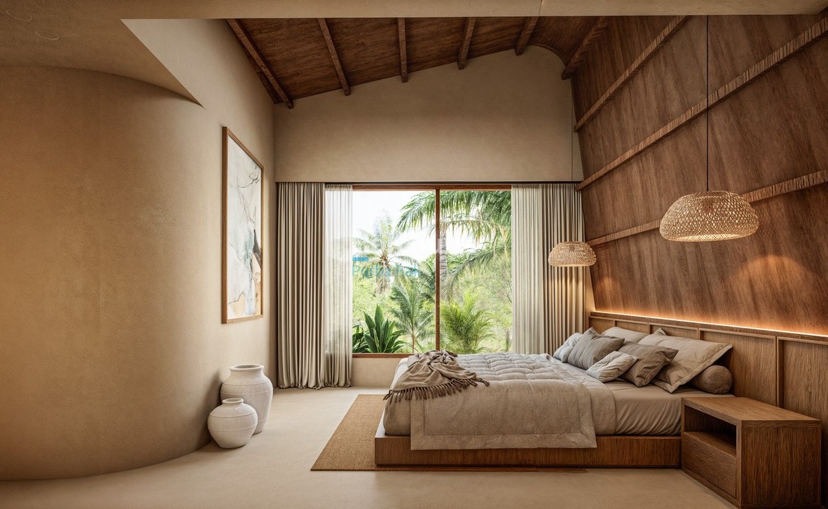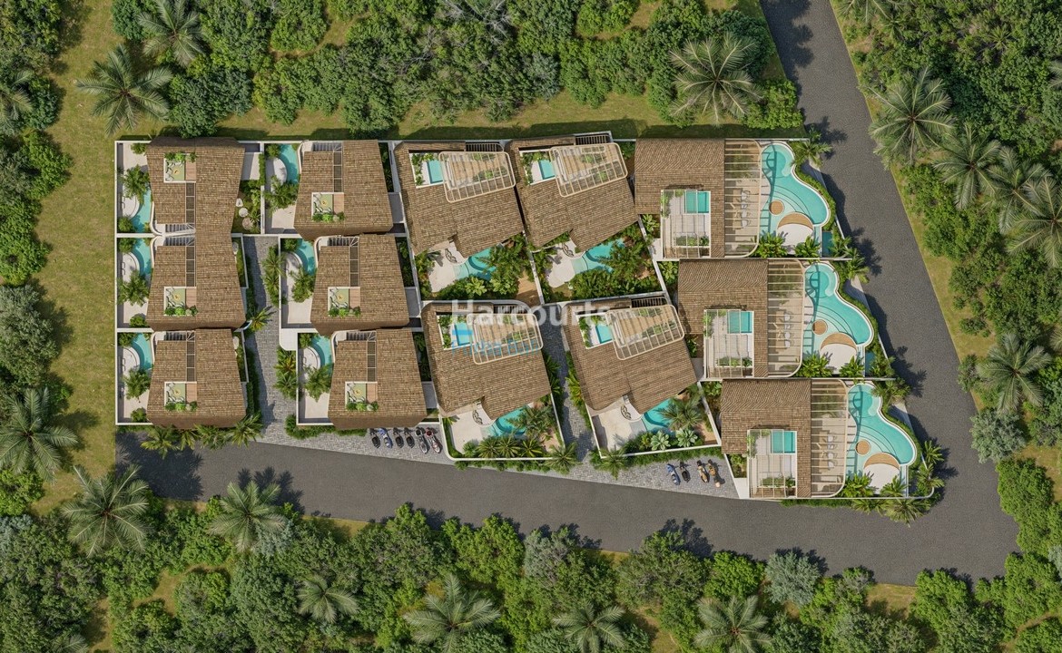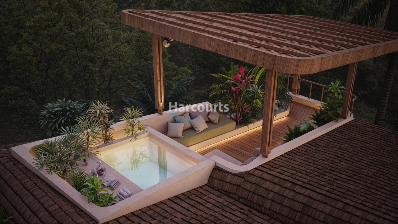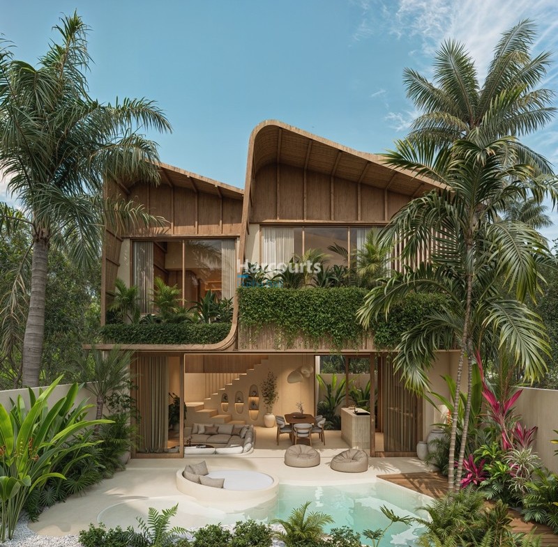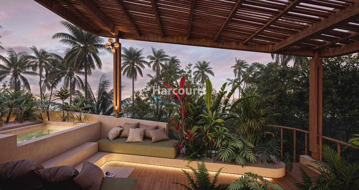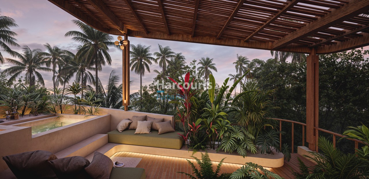 Outside, the villa sits on a 1.05 are (~105 m²) plot where a private garden and small swimming pool with a built-in sunbed are framed by lush tropical planting and a wooden deck. A distinctive outdoor stone shower and multiple circular cushion seating areas create a resort-like atmosphere while fully enclosed grounds and dedicated parking ensure privacy and convenience. The architecture’s curved roofline and natural finishes tie the spaces together.